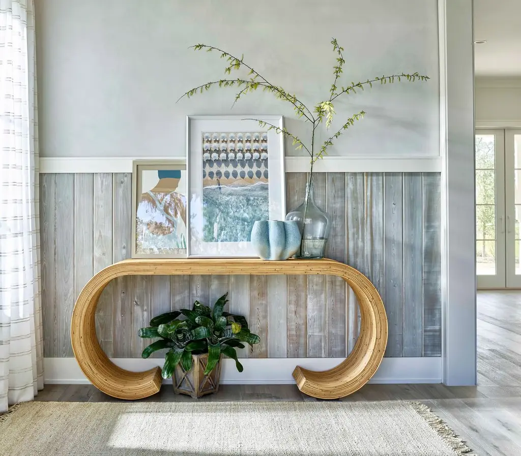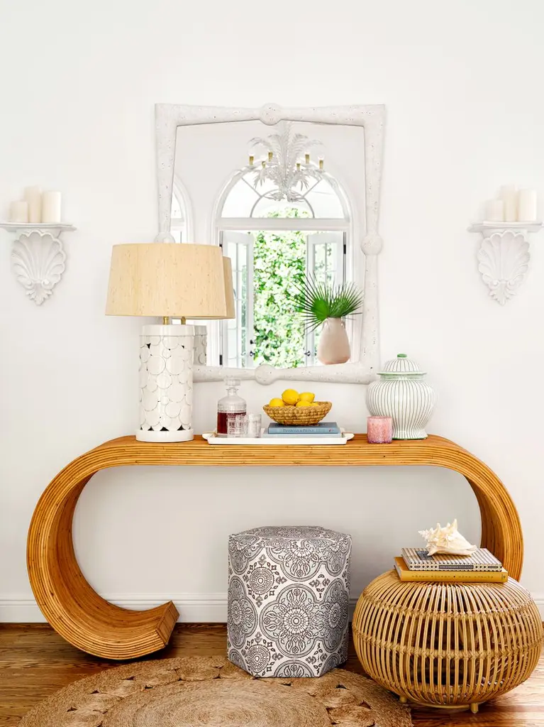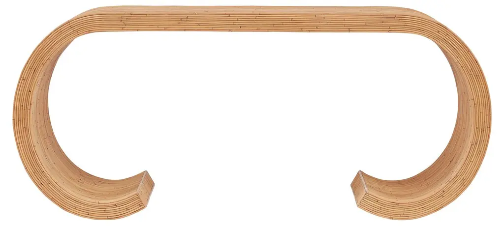 An exemplar of organic elegance, this curvaceous console table is wrapped in rattan for a touch of tropical ease. Whether you place it in an entry, in a hall, or behind a sofa, it's certain to command attention.