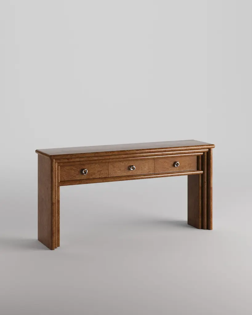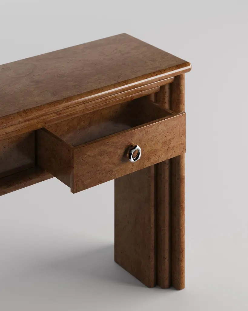 Column Root Wood Console by Tuğçe GeyikDimensions: D 45 x W 180 x H 88 cm. Materials: Wood.Tuğçe Geyik is an architect and designer based in Istanbul. She studied at Yildiz Technical University, Department of Architecture. She began her career by participating in interior design projects and continued to cultivate her interest in this field. She finds great joy in working across different mediums and aesthetics with an approach that is united by the same principles such as furniture and lighting design, interior design, 3D architectural visualization, interior styling, and creative direction. She handles colors, textures, and forms with a holistic approach as if creating a composition from the parts of a collage. She also blends her archive of materials and techniques from the past with forms from the future to create contemporary objects that bring awareness to inanimate beings.