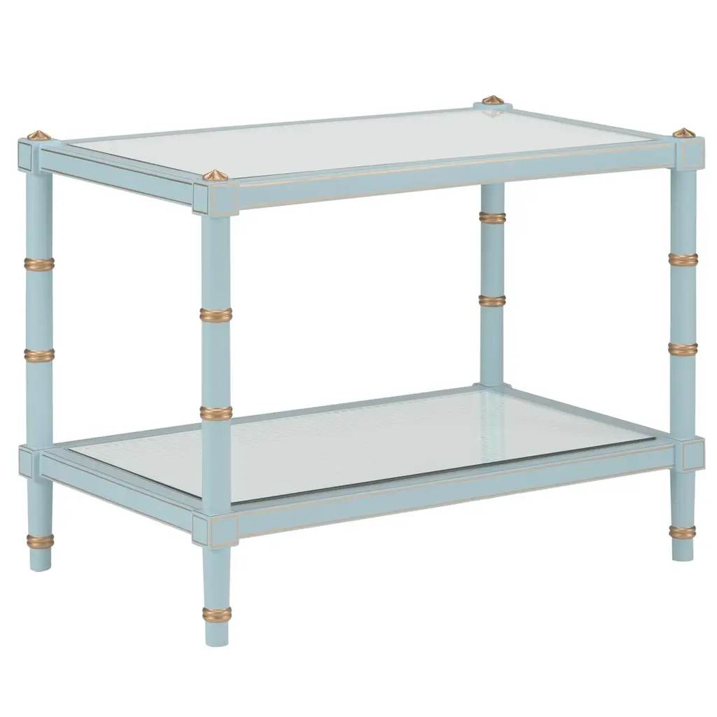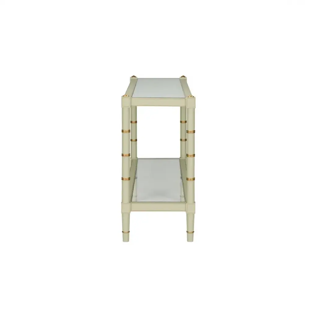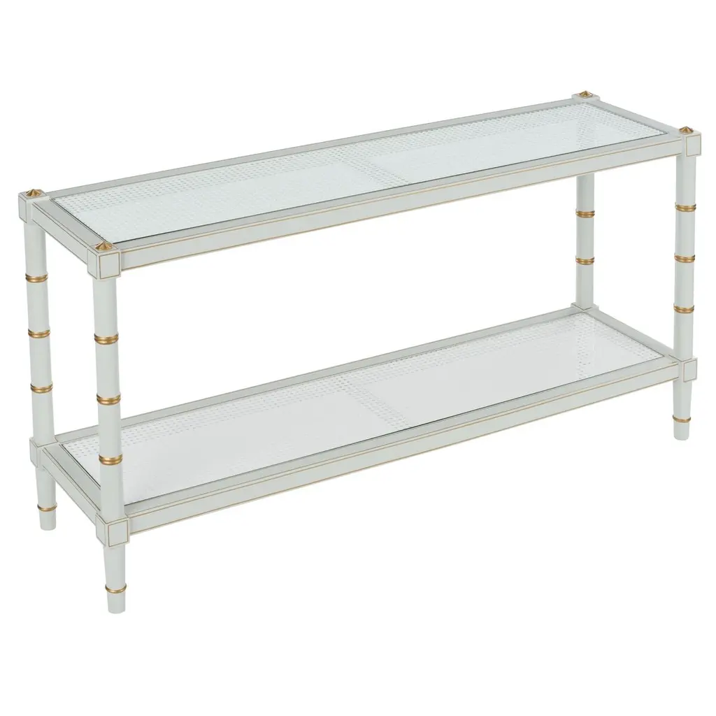The Conner Console Table in green is adorned with gold hand-painted detailing around the edge of the bamboo-inspired legs and natural caned shelf. Perfect for any room that needs a pop of color. Designed by Bill Cain.