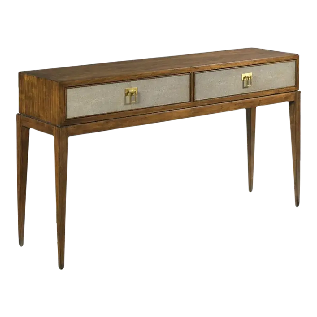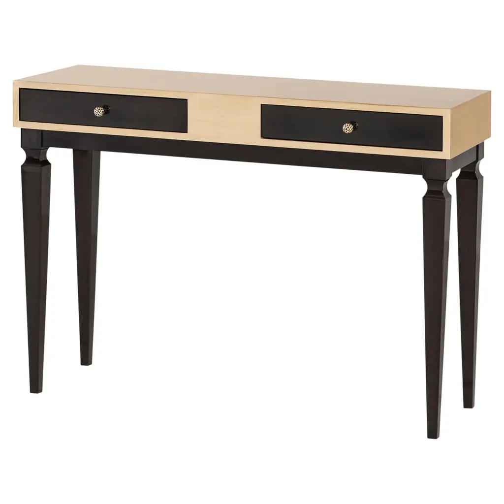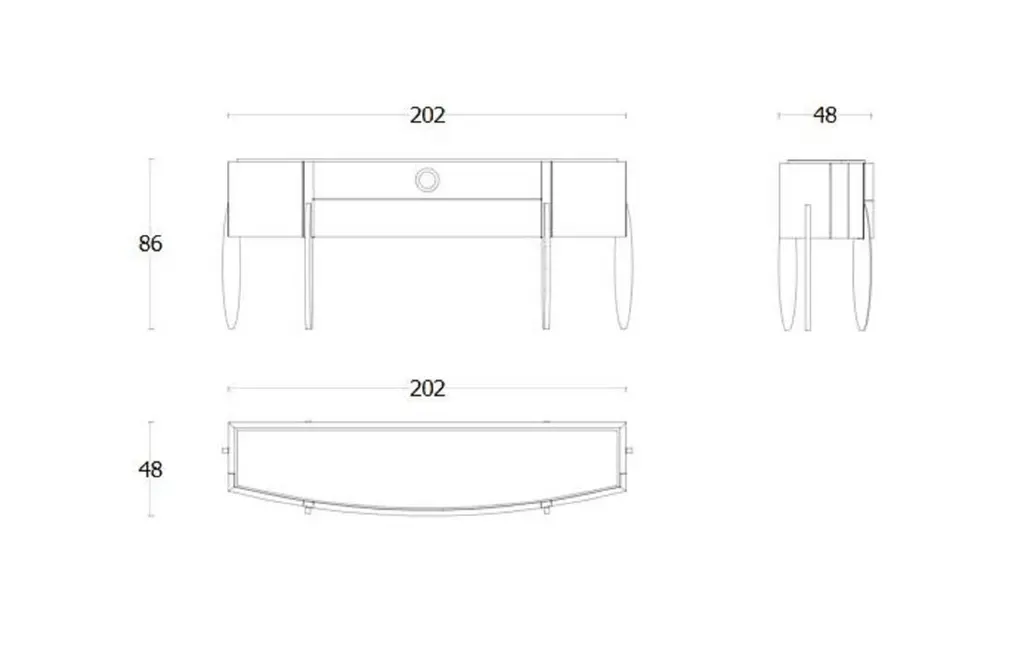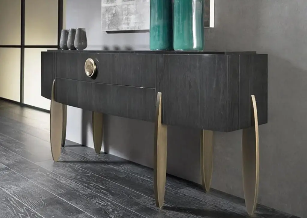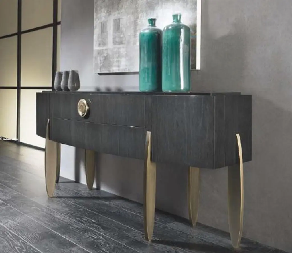 The "Fashion Affair" console appears as a slender sculpture on its elliptical legs, almost floating in the air. The piece is finished with fine wood veneers and a mirror-glossy surface, adding a luxurious touch. It features two side doors and two central drawers for practical storage. The single mother-of-pearl handle and bronzed feet elegantly complete the design. Measuring 202 centimeters in length, this console is a stylish statement piece that brings a touch of sophistication and elegance to any room.