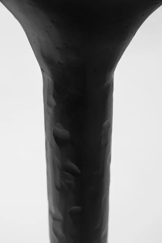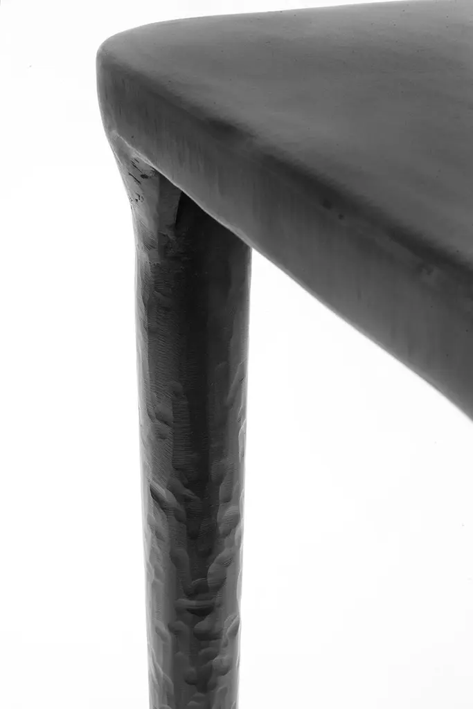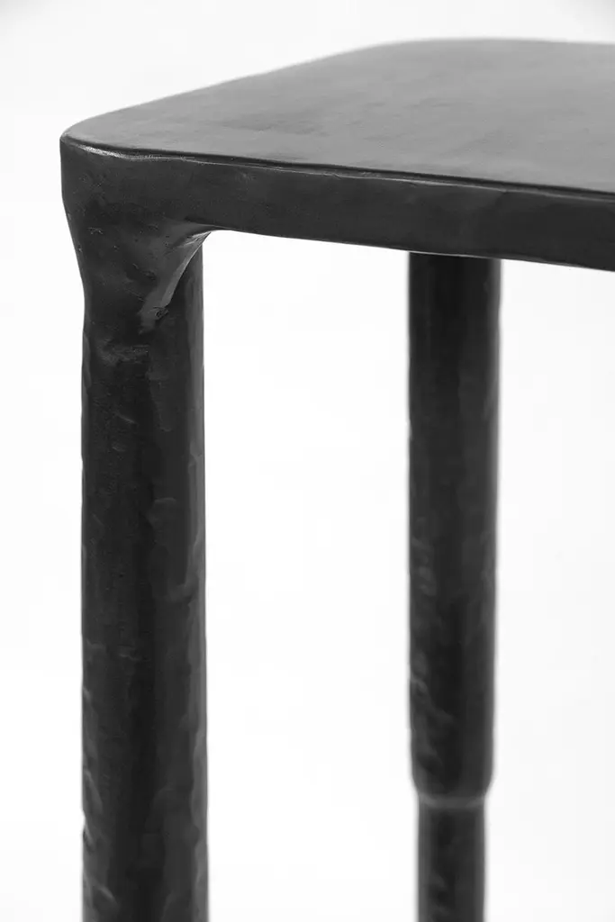 CONSOLE NO. 2 J.M. Szymanskid. 2018A refined and sleek design, this console table is carved out of blackened and waxed steel. The legs are finely tapered and make this elegant console table stand out. Custom sizes available. Made in the Bronx, New York, USA.Our products are fabricated and finished by hand, so variations in size, shape, and patina color are a natural result of this process. Tooling marks and surface scratches are part of the character of many finished pieces. All products are sealed with oil and wax, which, over time, are not impervious to moisture. Our blackened steel pieces installed outside or in areas exposed to moisture indoors, especially in marine environments, will rust. Condensation from hot and cold drinks will leave rings on blackened steel table tops. Coasters or placemats can protect the finish. Periodic maintenance of blackened steel items may be required.