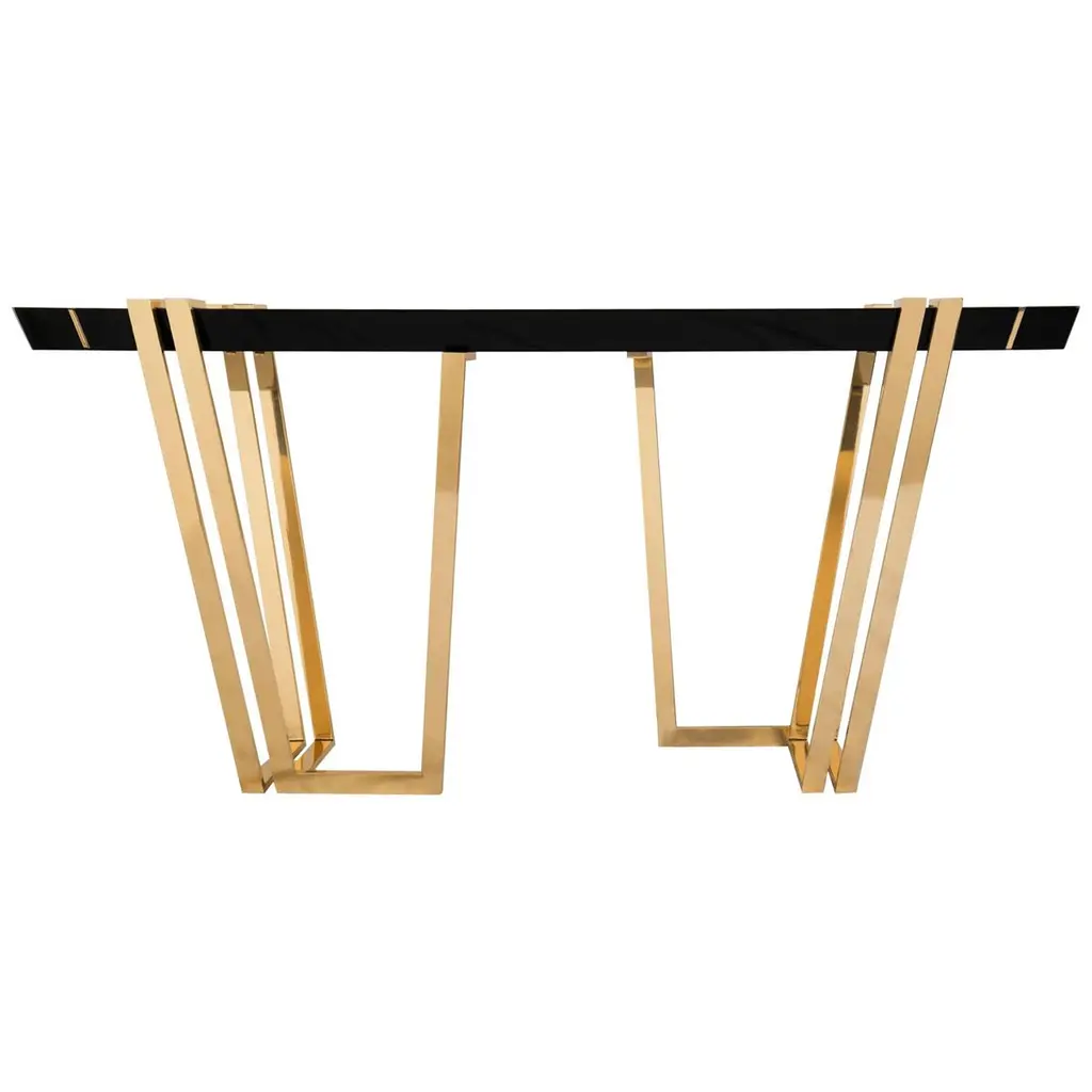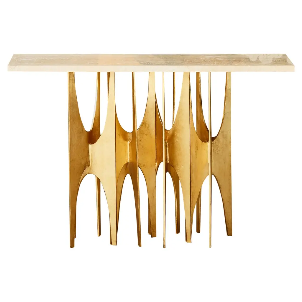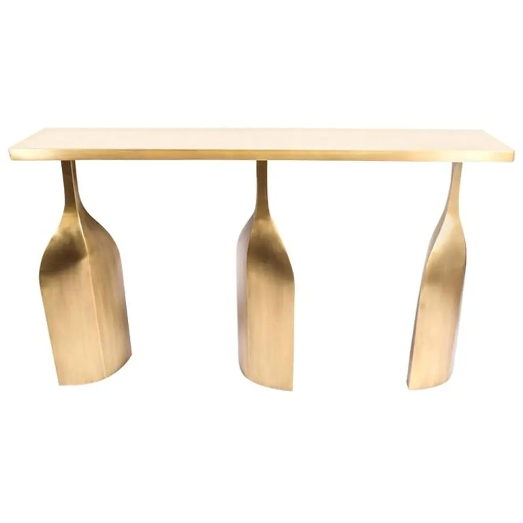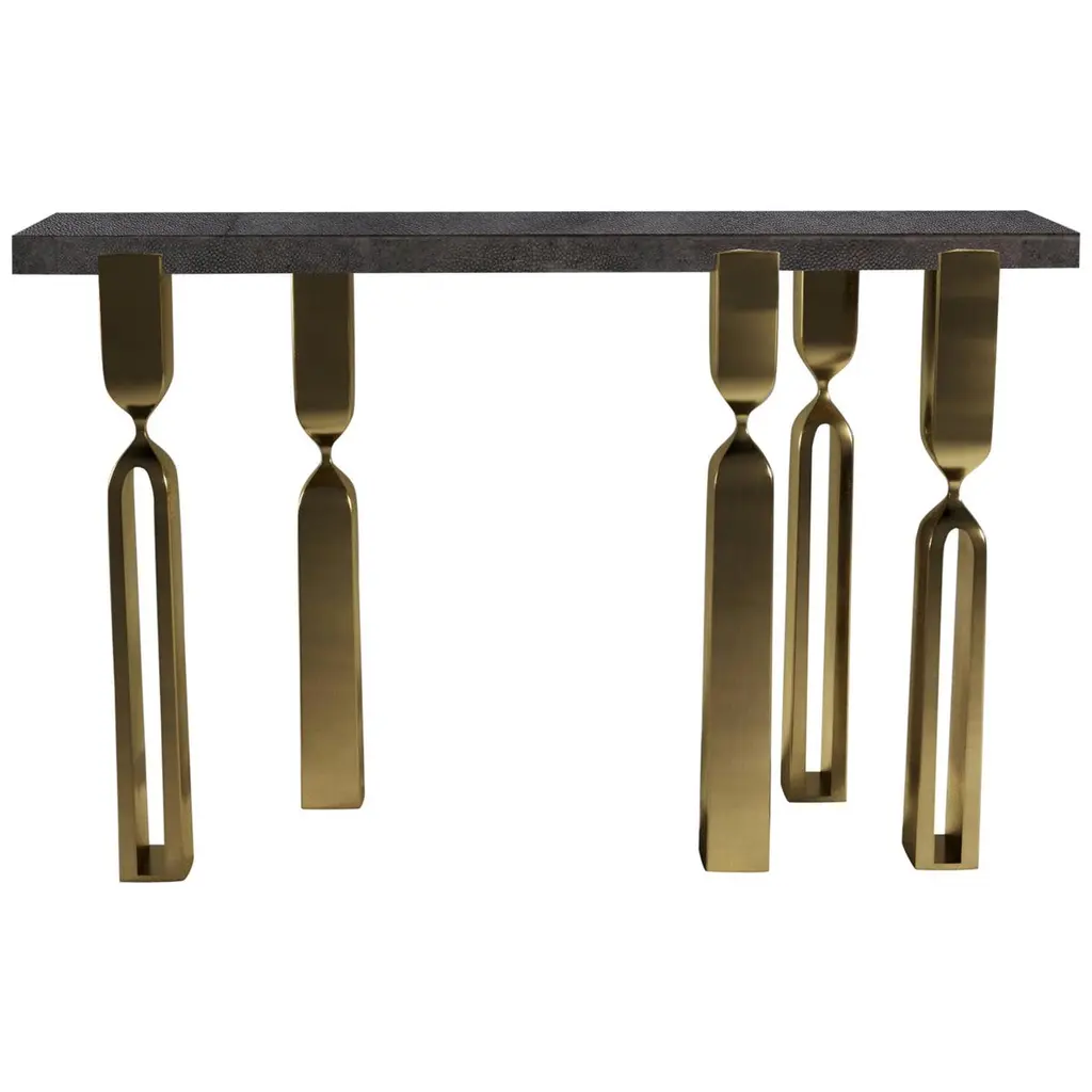 The Paris based label has distinguished themselves since their launch, with their iconic use of shagreen mixed with brass and other exotic materials. All furniture is handcrafted by skilled artisans, ultimately making each piece unique, designed in Paris and produced in the Philippines.Inspired by the original Rhapsody lamp, by her fiancee Patrick Coard Paris, Kifu Paris designs a sculptural console as an ode to his iconic lighting collection. The console tabletop is inlaid in cream shagreen and sits on 5 bronze-patina brass "rhapsody" legs that are a mixture of solid and cut-out shapes. The legs clasp the side of the top creating another elegant detail. Available in other finishes.The dimensions of this piece are 149.5 x 34 x 94.5 cm All Kifu Paris pieces are handmade by artisans, ultimately making each piece unique. Custom color or sizing available on request. Wipe clean with soft dry cloth.Although inspired by her parents, her collection of Home Accessories and Furniture is a distinct identity of its own. Kifu uses handmade techniques of elaborate inlay patterns of shagreen, shells, semi-precious stones, materials she experienced as a child growing up in her parent’s studio, but interpreted in a younger quirkier way reflecting her youth. From her "jewelry inspired knobs" on decorative boxes, gold bar boxes and an extravagant inlay pattern mix of shagreen and shell inspired by galactic constellations, as seen on her enormous round mirror, is refreshing to see. Kifu embodies whimsical elements throughout her collection and is not afraid to be daring and unexpected in her approach to design. All shagreen-covered items should be kept out of direct sunlight, color variants may occur on the stingray and other exotic finishes, but this showcases the Parisian label's commitment to creating authentic luxurious products using natural components.