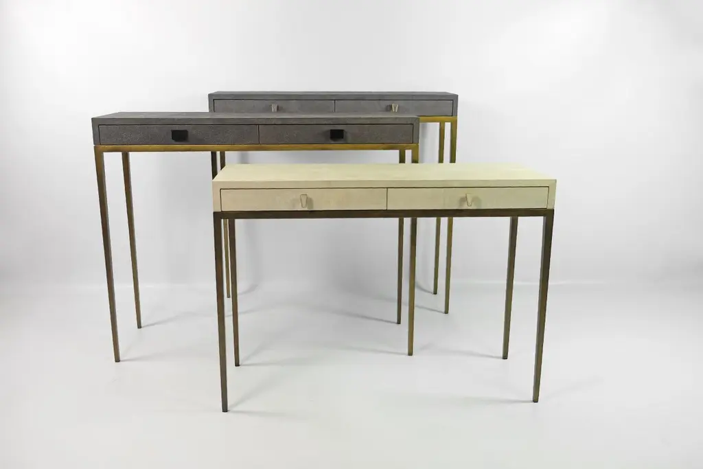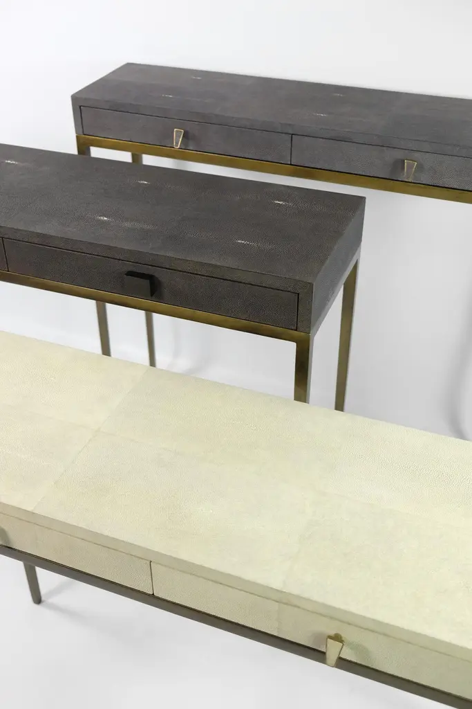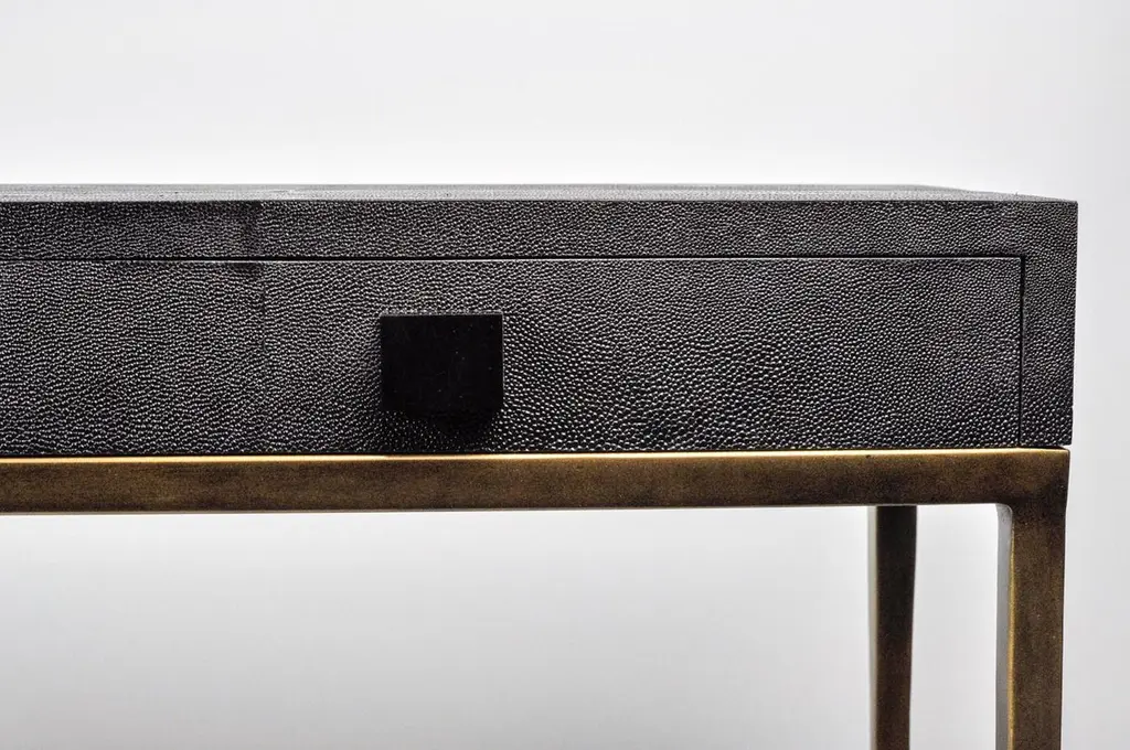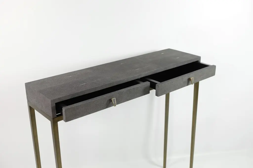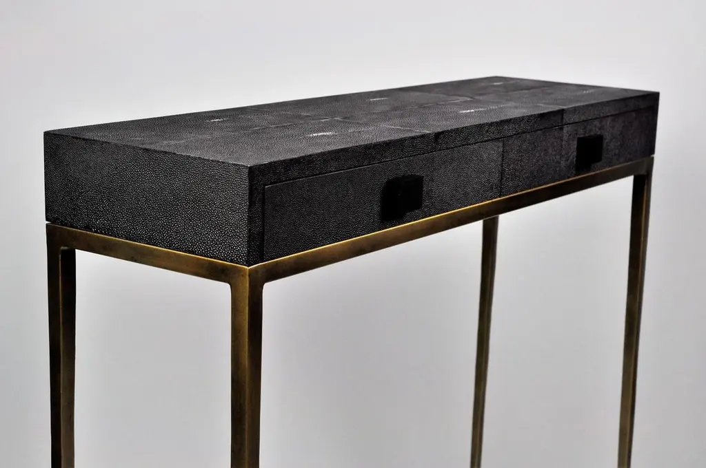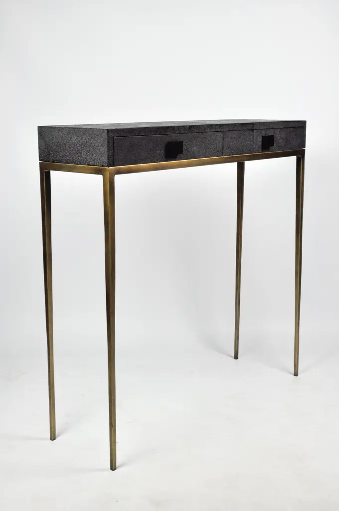 The console table is made of shagreen.It has two thin drawers and the metal legs have an aged brass patina.This piece will settle very well in your entrance or your living room.The style is timeless and chic. No way to get bored of it.The interior of the drawers are in wood veneer, and the small knobs are in polished black shell marquetry.The dimensions of this piece are 31.5" x 9.44" x H 31.49" (80x24x80cm).We can customize the dimensions and finishes of this shagreen console table.You can see some examples in the photo gallery. Care instructions:Keep the materials dry and protected from direct sunlight and heat surfacesTo clean, simply wipe with a dry clean clothDo not use any cleaning agent on the surfaceThis piece is handmade by our talented master craftsmen.