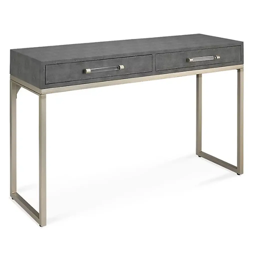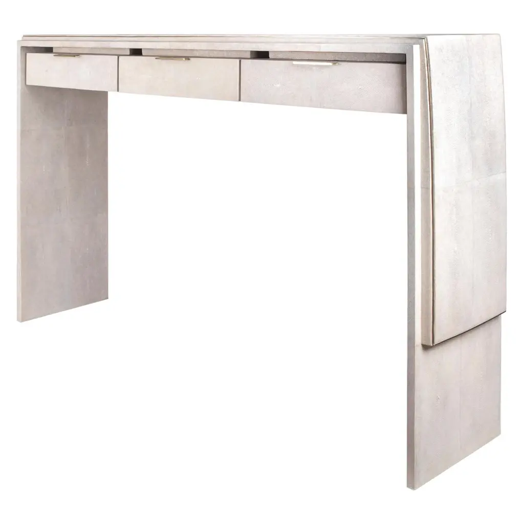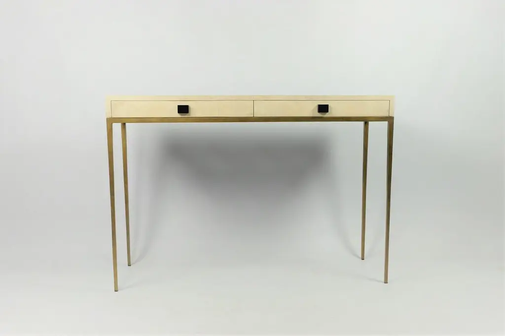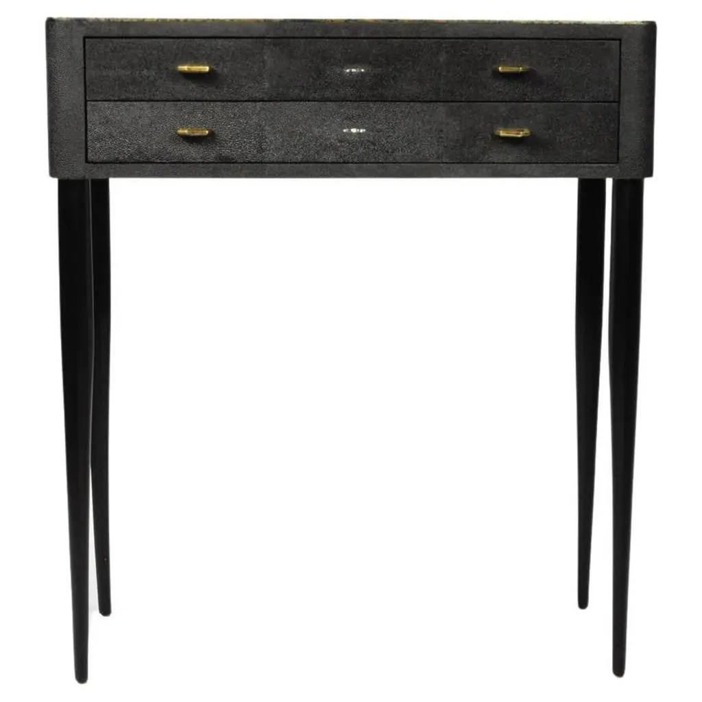 The console table is made of shagreen.It has two thin drawers and the metal legs have an aged brass patina.This piece will settle very well in your entrance or your living room.The style is timeless and chic. No way to get bored of it.The interior of the drawers are in wood veneer, and the small knobs are in polished black shell marquetry.The dimensions of this piece are 31.5" x 9.44" x H 31.49" (80x24x80cm).We can customize the dimensions and finishes of this shagreen console table.You can see some examples in the photo gallery. Care instructions:Keep the materials dry and protected from direct sunlight and heat surfacesTo clean, simply wipe with a dry clean clothDo not use any cleaning agent on the surfaceThis piece is handmade by our talented master craftsmen.