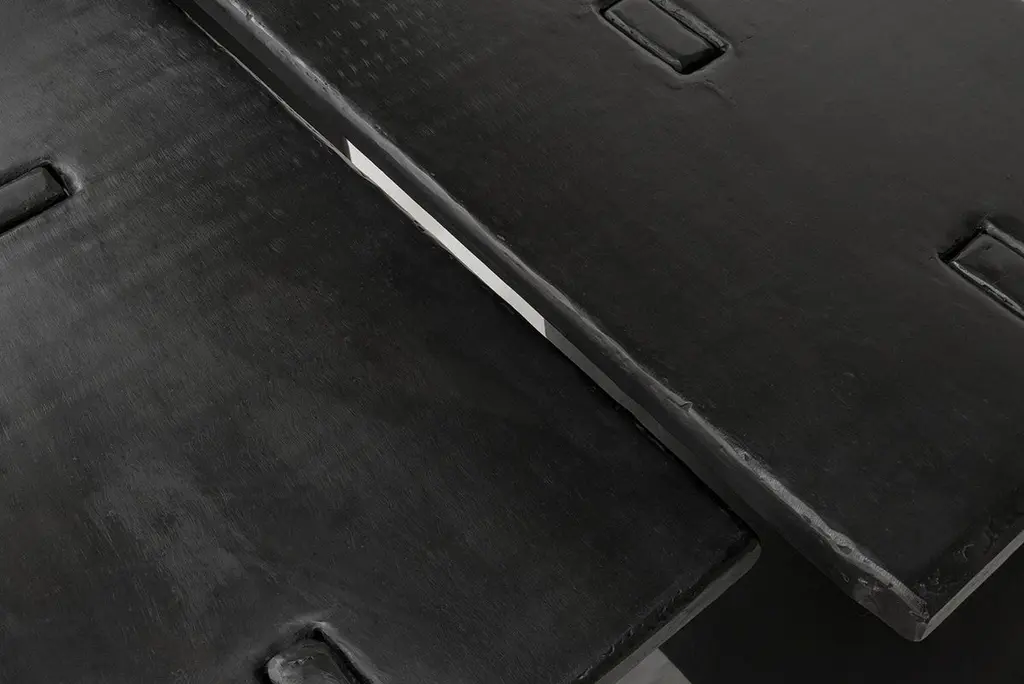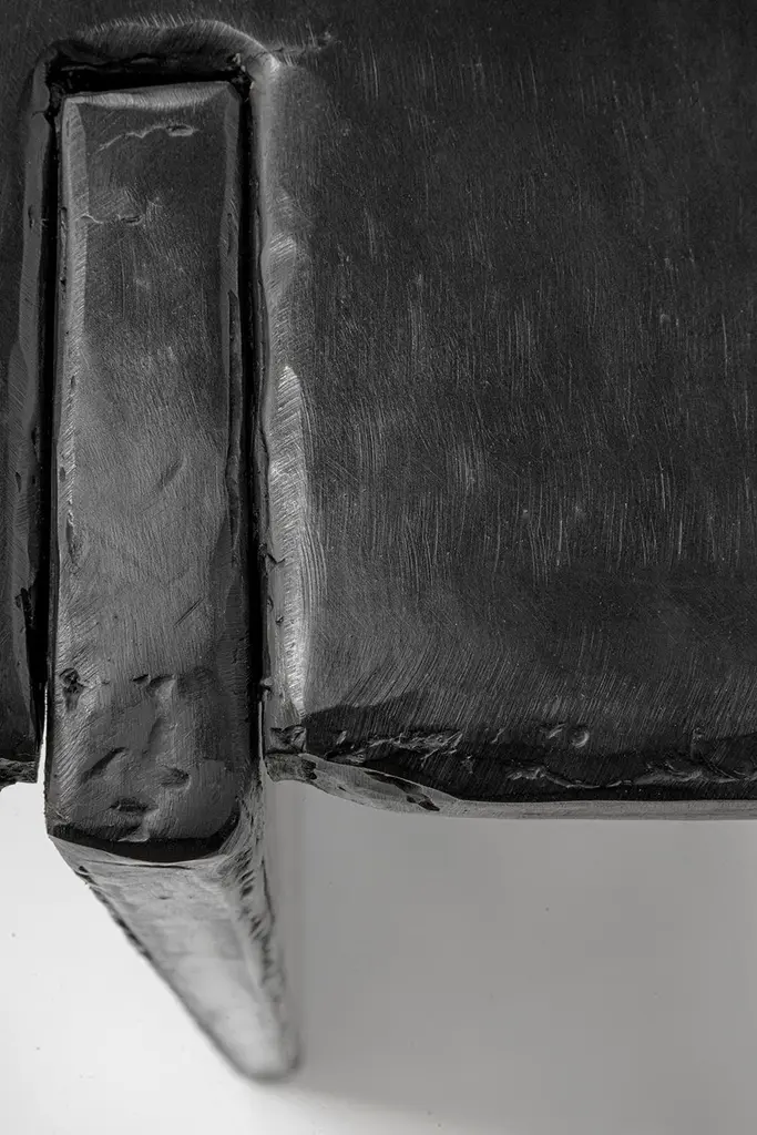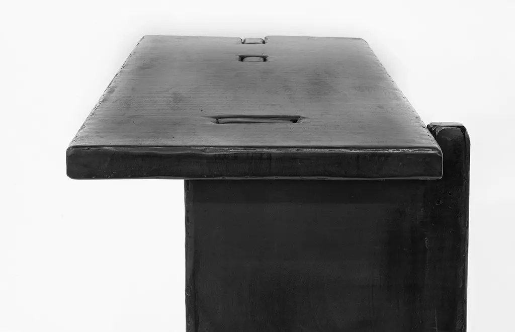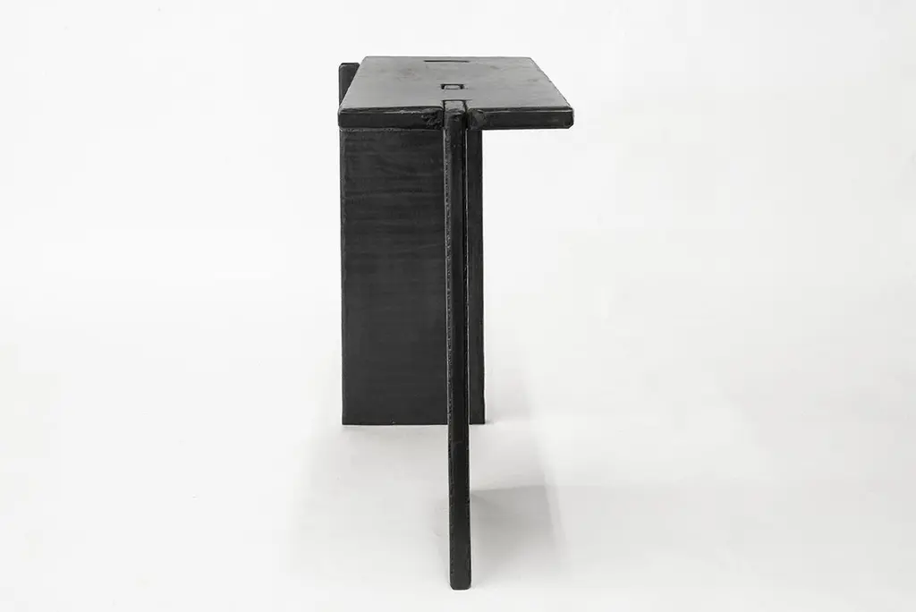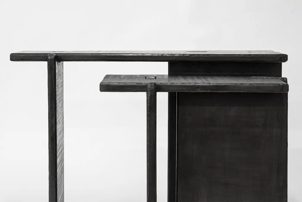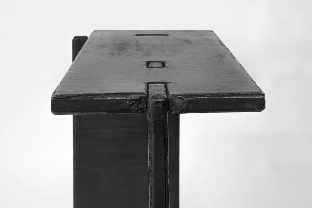 Console No. 5J.M. Szymanskid. 2022This console is composed of stark, perpendicular planes that have been notched and precisely slotted together. Its hand-carved rough edges contrast beautifully with the continuous flat surfaces that make up its top and legs. Custom sizes and finishes available. Made in the Bronx, New York, USA.Our products are fabricated and finished by hand, so variations in size, shape, and patina color are a natural result of this process. Tooling marks and surface scratches are part of the character of many finished pieces. All products are sealed with oil and wax, which, over time, are not impervious to moisture. Our blackened steel pieces installed outside or in areas exposed to moisture indoors, especially in marine environments, will rust. Condensation from hot and cold drinks will leave rings on blackened steel table tops. Coasters or placemats can protect the finish. Periodic maintenance of blackened steel items may be required.