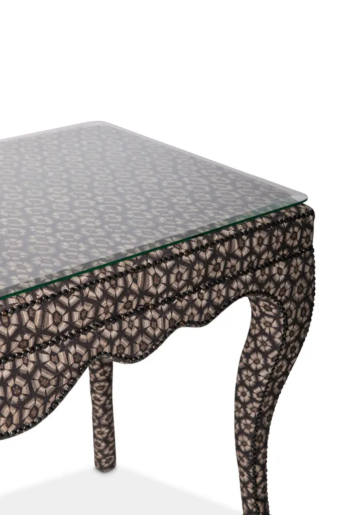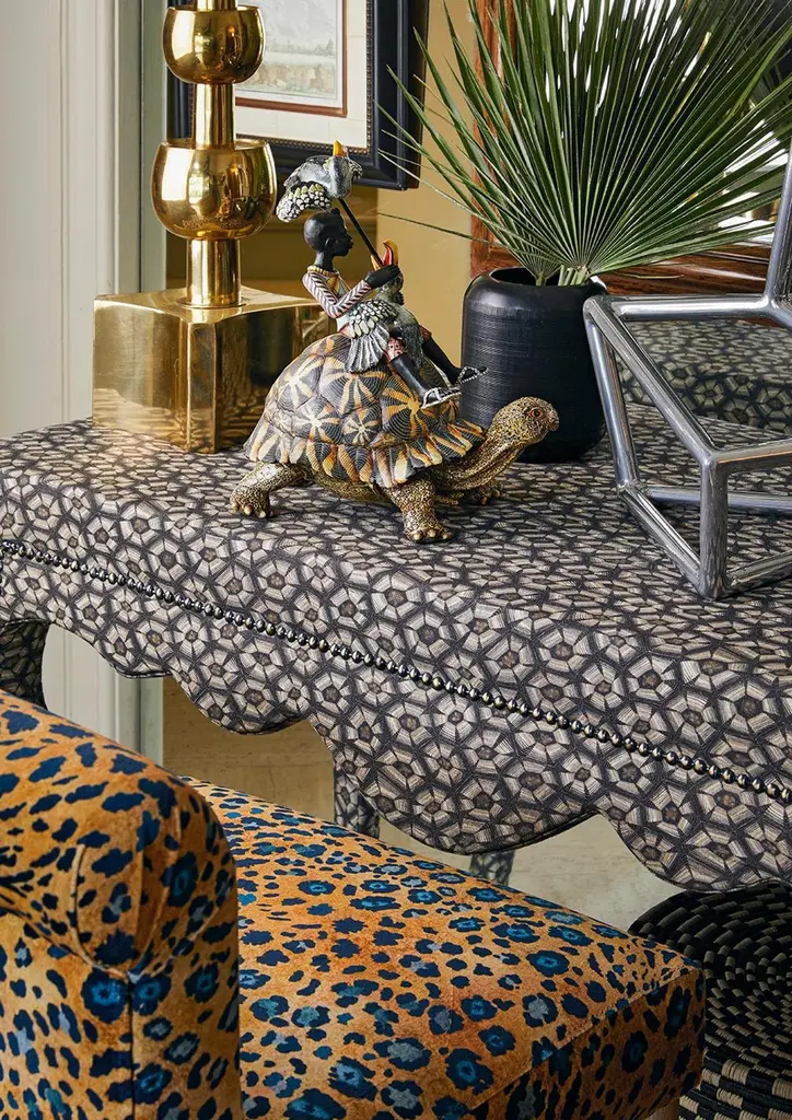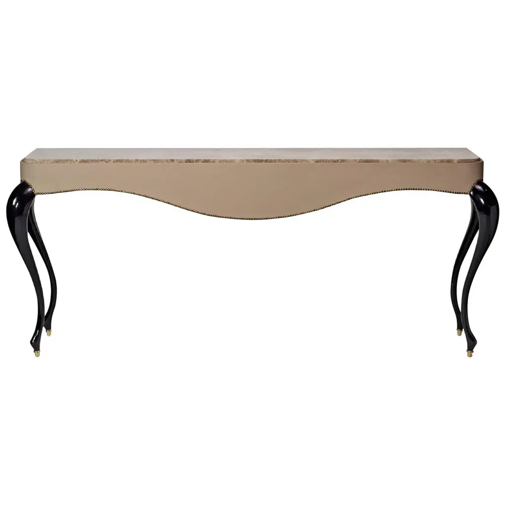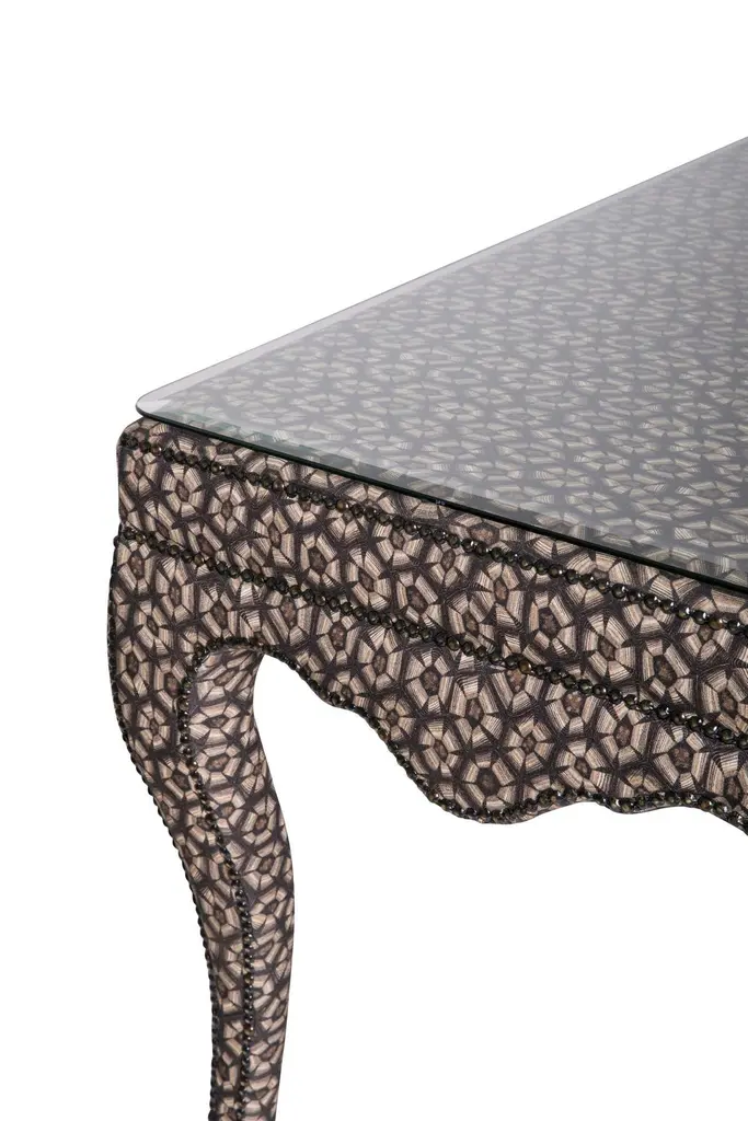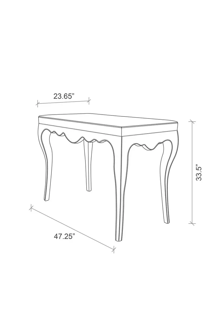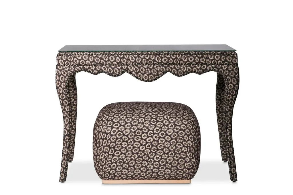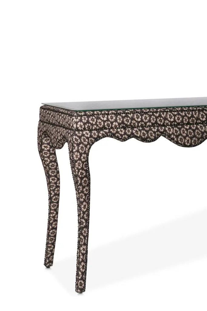 The elegant symmetry of Nyala antelope horns inspired the flowing forms of our Nyala Table - perfect for a dressing room or entrance hall table. Available in linen fabric only.Dimensions: 47.25" W x 23.65" D x 33.5" HColor: Safari Spot GoldMade Of: Linen Fabric (70% Linen / 30% Viscose) / Rubber Wood / Bevelled Glass / Antique Brass Nail HeadsManufacturer: ArdmoreMade In: Johannesburg, South Africa