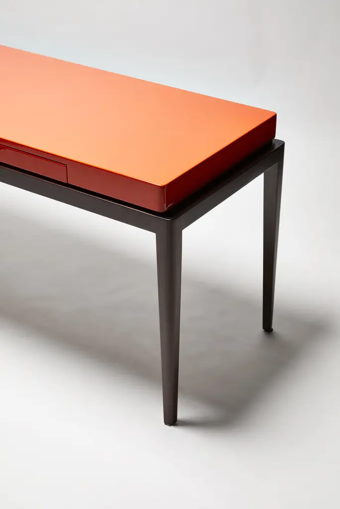 The perfect console; Size: 140cmFlat surface, smooth, purity of the line only asking to be inhabited. If it is aconsole or a desk, TARA is a piece that distinguish itself with the power of itsminimalism. It is enough to dress up any interior. The glossy or matte lacquered top exists in several colors, the same ones as the dot table and offer to the sight a dive into intensity of material. A piece allowing to forge intimacy.Walnut legs, leather finish inside the drawer.Special size and color made to order. Exits also as a desk.Designed by Reda Amalou, 2020Availability on request.