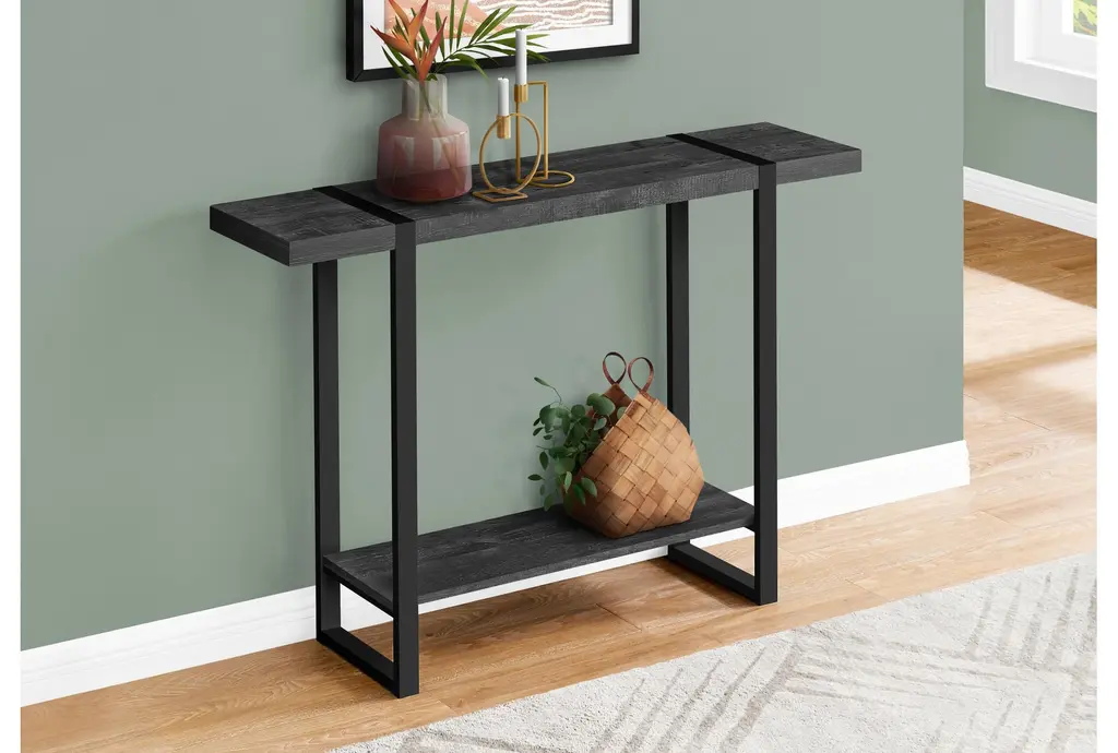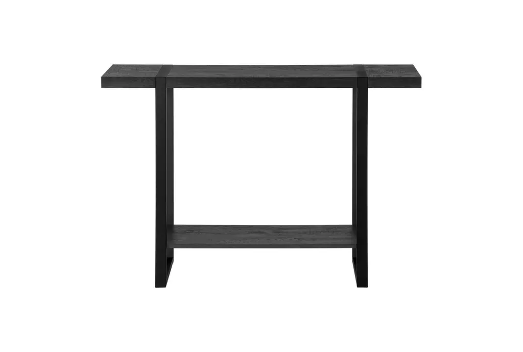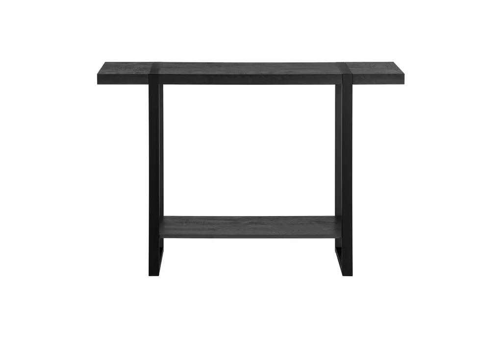 The Contempo Modern Black 47" Console Table is a stylish and functional addition to any modern or contemporary space. Its industrial-farmhouse design features a fixed shelf for additional storage, making it both practical and visually appealing. The thick, wide tabletop and smaller lower shelf boast a black reclaimed wood-look finish, adding a rustic charm to the piece. Supported by black metal legs, this console table offers a modern touch and ensures stability.
