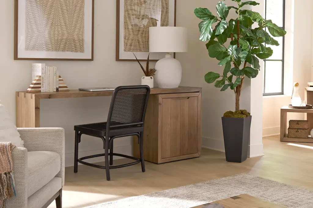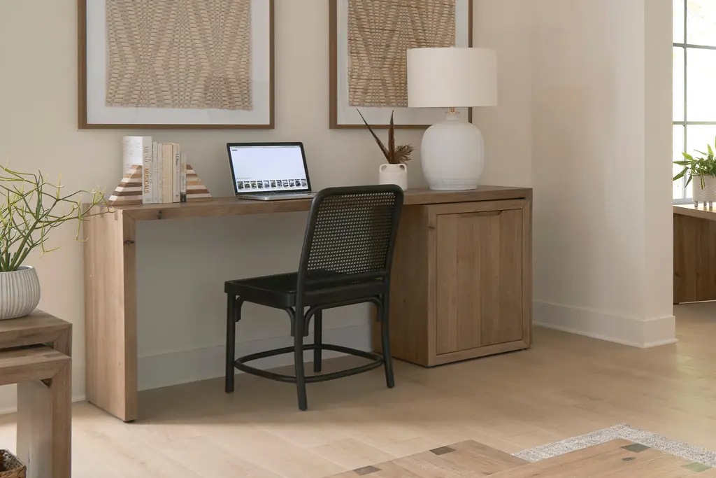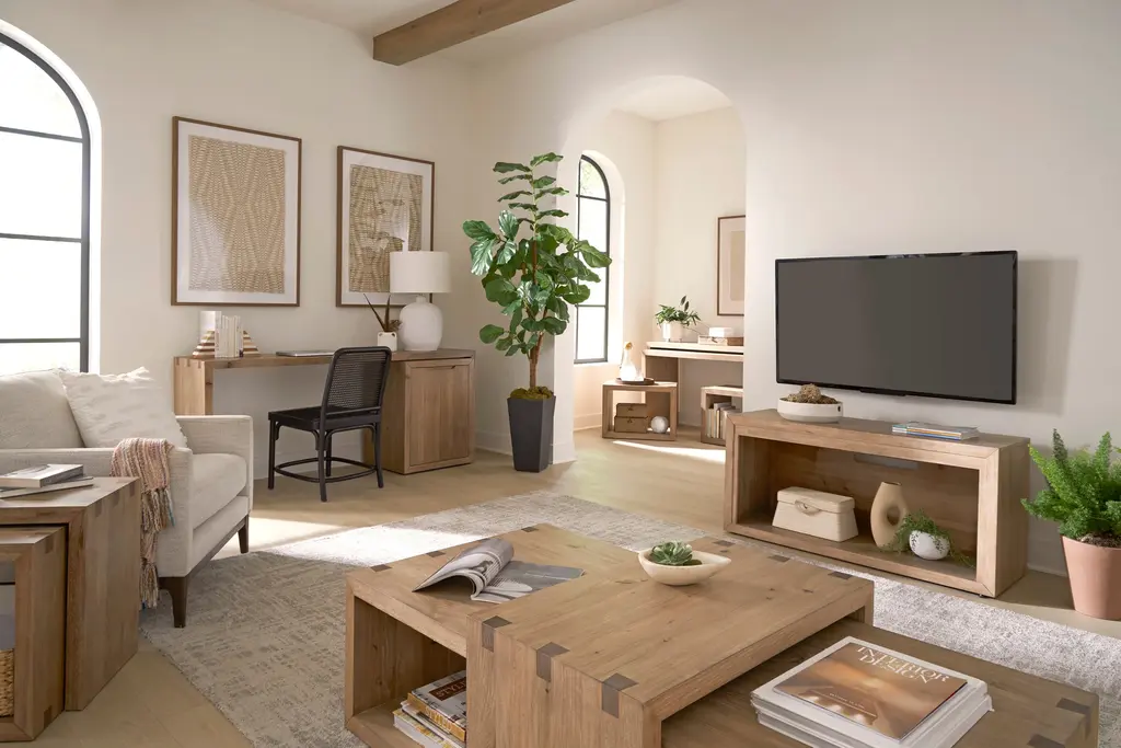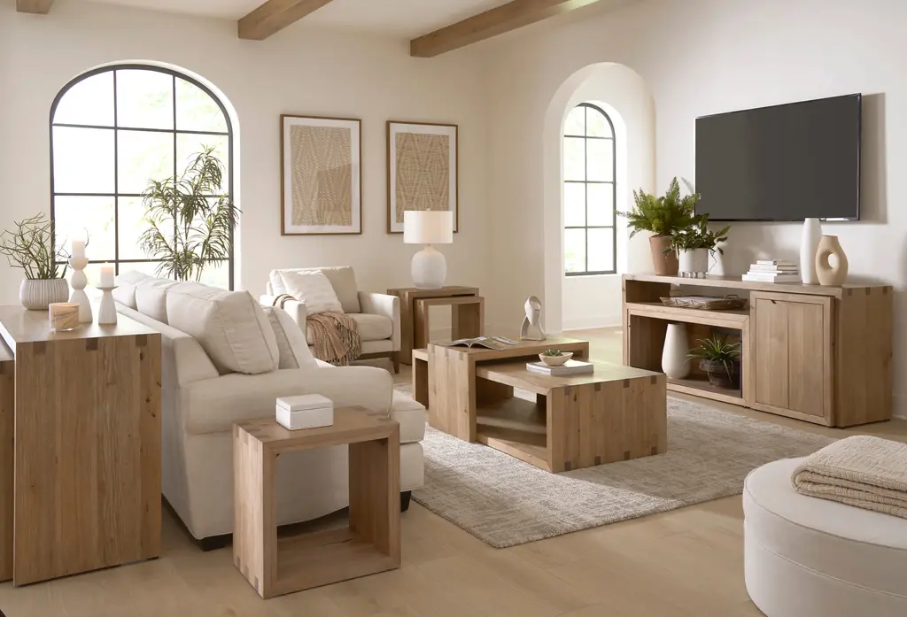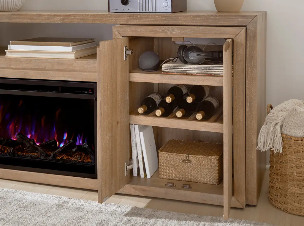 Exuding the best of natural modernism, this nesting console table takes the simplest of forms and crafts a piece that can be utilized in endless configurations for a supreme capsule space. Use all the pieces together for a storage-filled setup or split them apart to create various storage and display pieces. Wire management holes allow for easy cord access, keeping them out of sight and out of mind! The removable door box piece includes two adjustable shelves that can also serve as wine bottle storage. Its light finish brings an airy vibe to geometric silhouettes and helps to craft the perfect earthly yet contemporary piece!