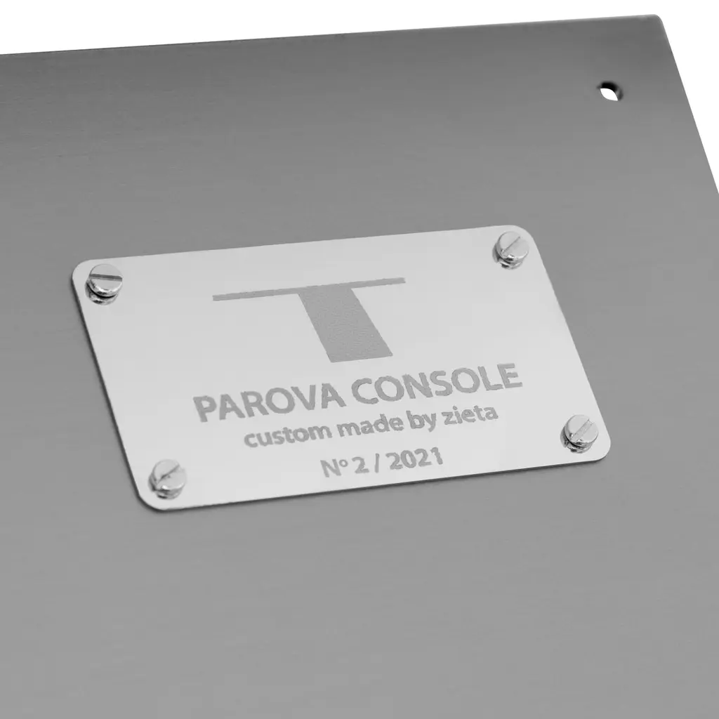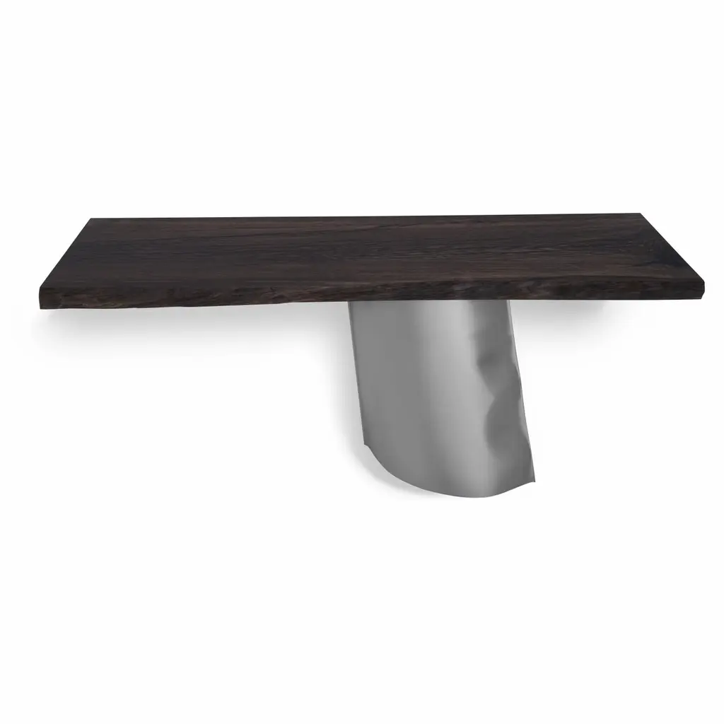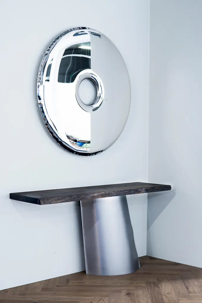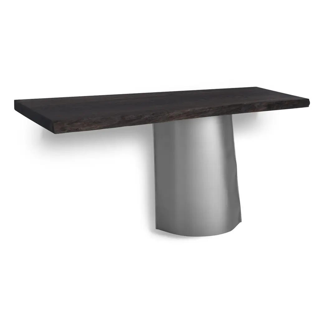 "Parova Oak" contemporary console by Zietatop: bog oakbase: carbon steelMeasures: 75 x 150 x 40 cm.Parova Console is a new object in the Parova series, which is distinguished by a solid cylindrical base with a sculptural, organic character. In 2019, at the Warsaw Home, Zieta Studio presented Parova Coffee Table. In the case of the console, powder coated or polished steel is combined with personalized table tops. A steel, wooden or concrete top can be selected for the Parova Console. Thus, the console is an object that can be adapted to the interior in terms of form (single or double base), as well as finishes (inox, powder coated steel).Parova Console is a piece of furniture dedicated to be leant against the wall in a space of an entry hall, a corridor or bedroom. It is a complementary object that decorates and elevates the style of an interior. With its tube-like base and thin, light top, it resembles a contemporary minimalist sculpture.