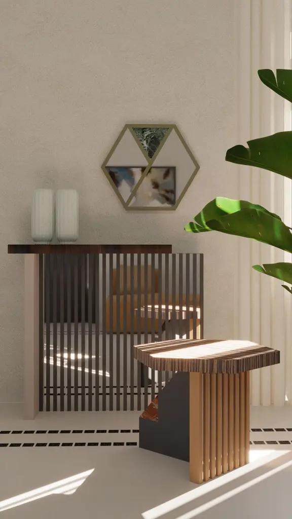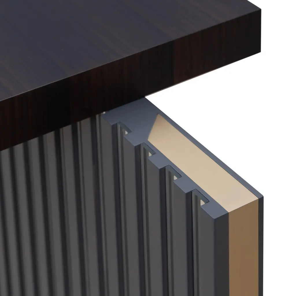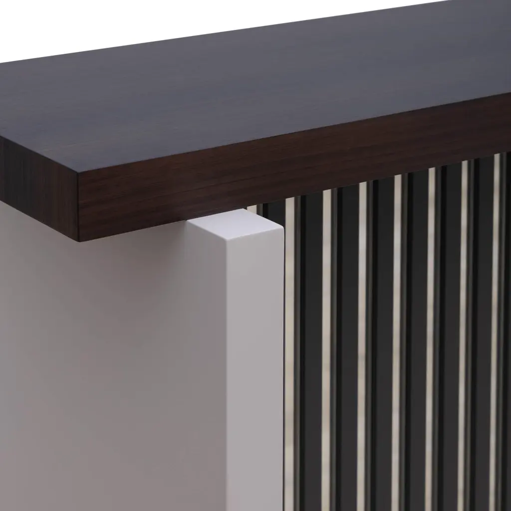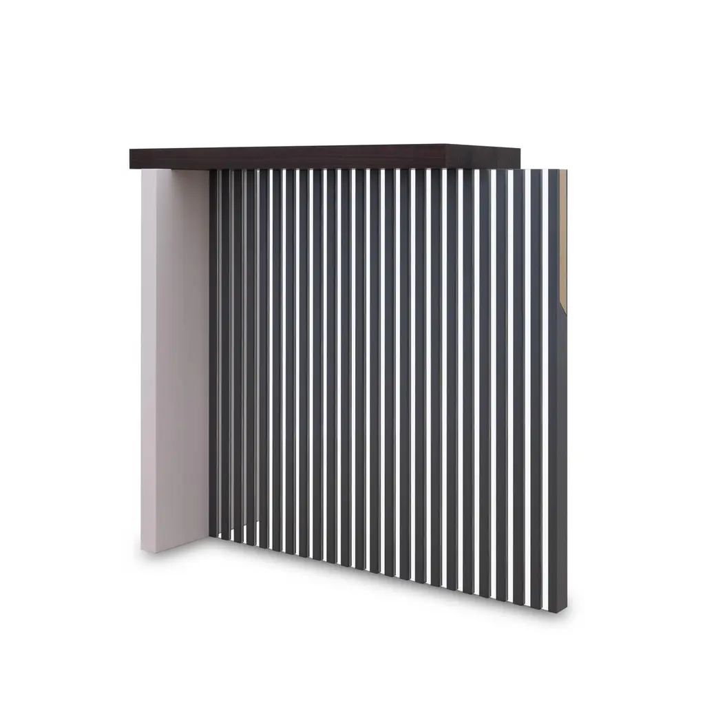 Constructed starting from two lacquered wood panels and an eucalyptus essence top, the Palmaria console is then worked to be able to apply a satin brass insert on the side. Frontally, the console has been hollowed out to be able to house the mirror strips that capture and reflect the environment it is located in. The Palmaria console can be used in the entrance of the house, in a corridor or in the living room. To personalize with a plant, a lamp or a pocket emptier.100% Made in Italy.