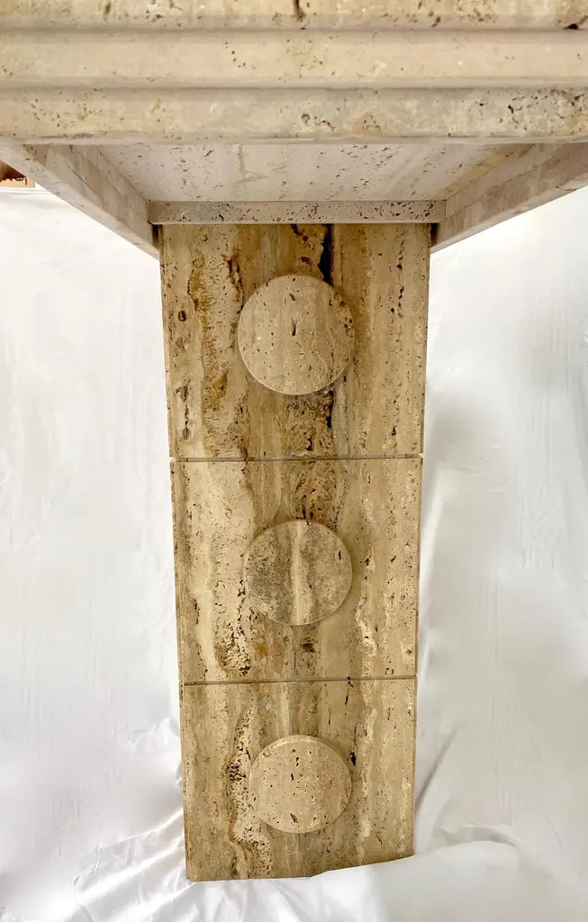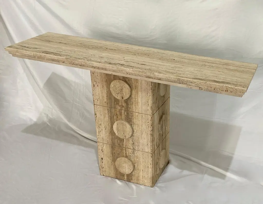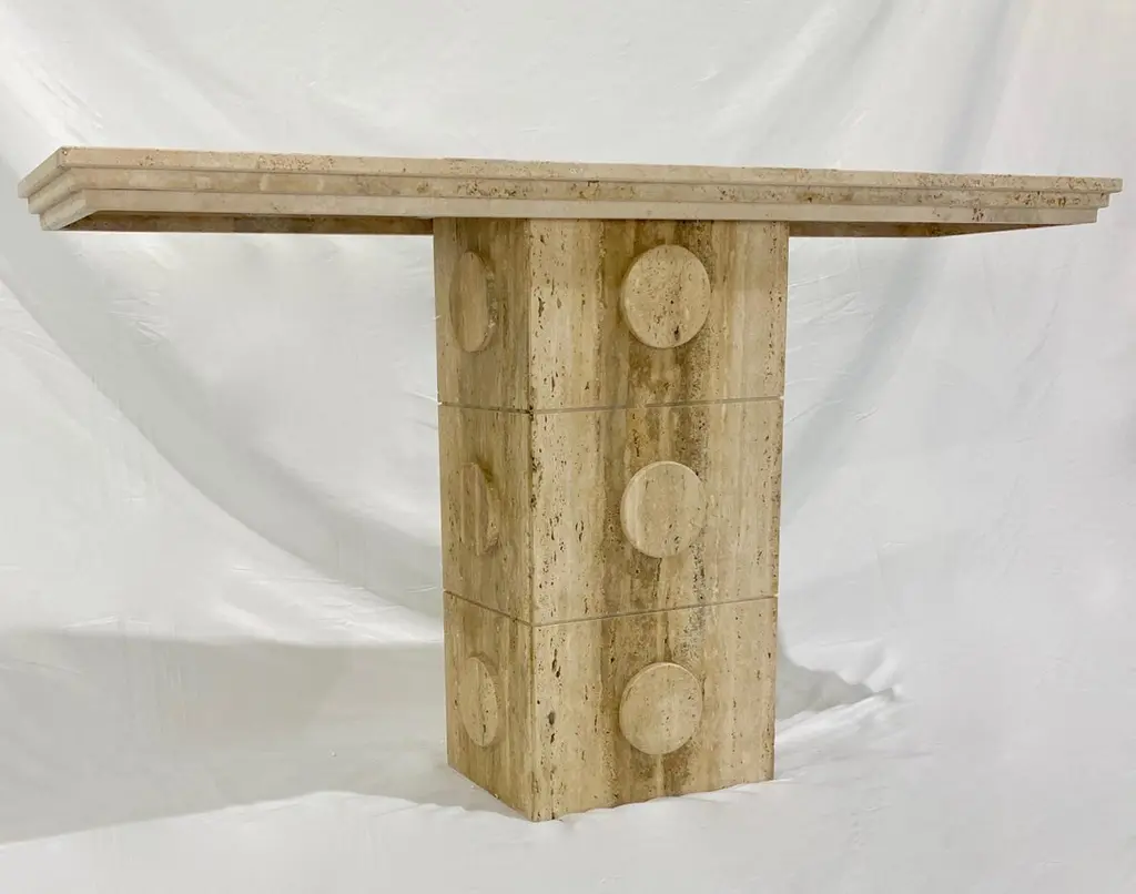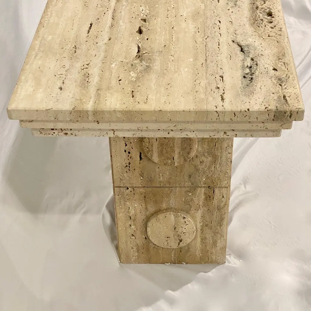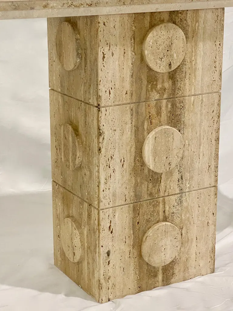This console of urban architectural design, entirely handcrafted in Italy, of Minimalist post-modern design, has a central upright structural support in cream white beige travertine stone, with circular decorations on all 4 sides. The table top is elegantly decorated with a geometric stepped triple edge all the way around. This piece combines essential and Aztec design with functional qualities, as it can also be displayed in the interior away from the walls as a divider or central table.Supporting column dimensions W 15.75 in x D 11.5 in.Top surface overall thickness approximately 2 in.