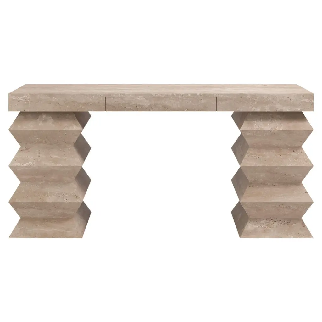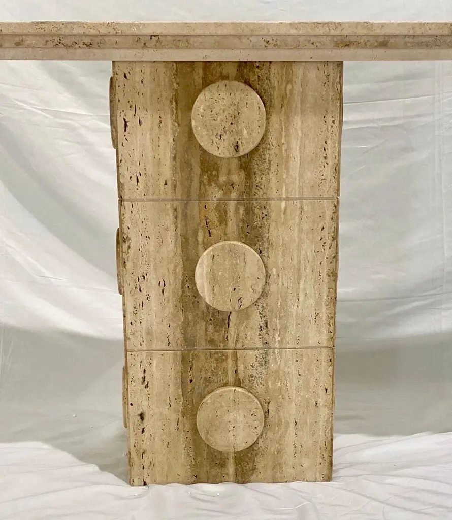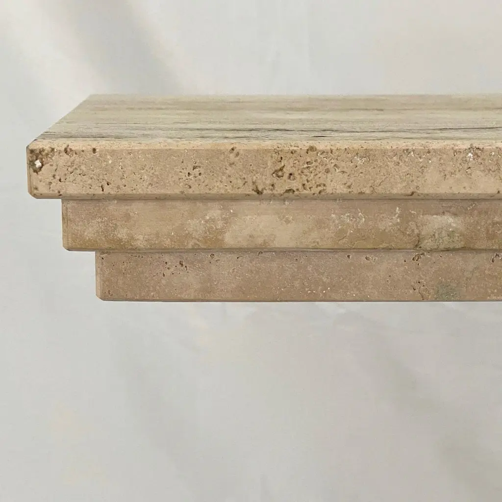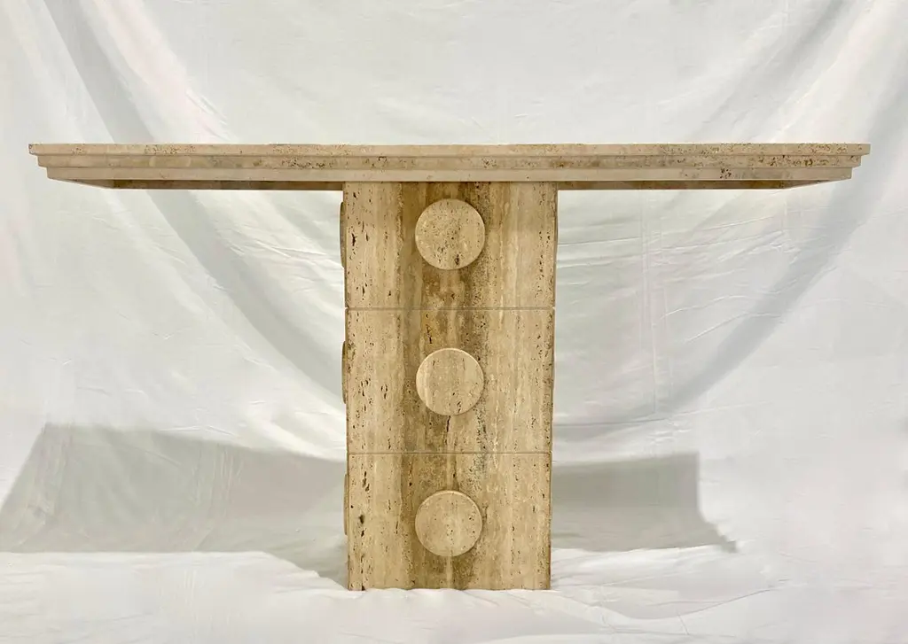 This console of urban architectural design, entirely handcrafted in Italy, of Minimalist post-modern design, has a central upright structural support in cream white beige travertine stone, with circular decorations on all 4 sides. The table top is elegantly decorated with a geometric stepped triple edge all the way around. This piece combines essential and Aztec design with functional qualities, as it can also be displayed in the interior away from the walls as a divider or central table.Supporting column dimensions W 15.75 in x D 11.5 in.Top surface overall thickness approximately 2 in.