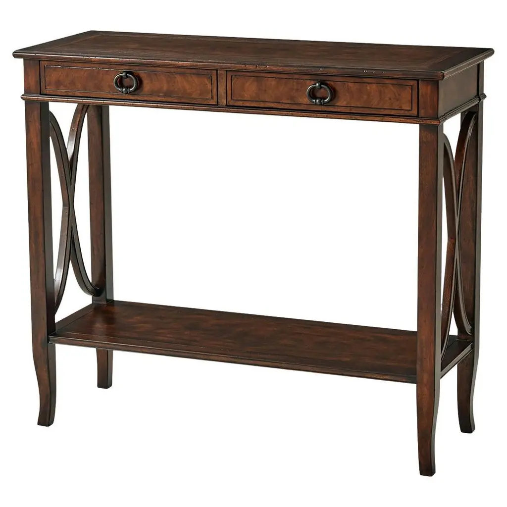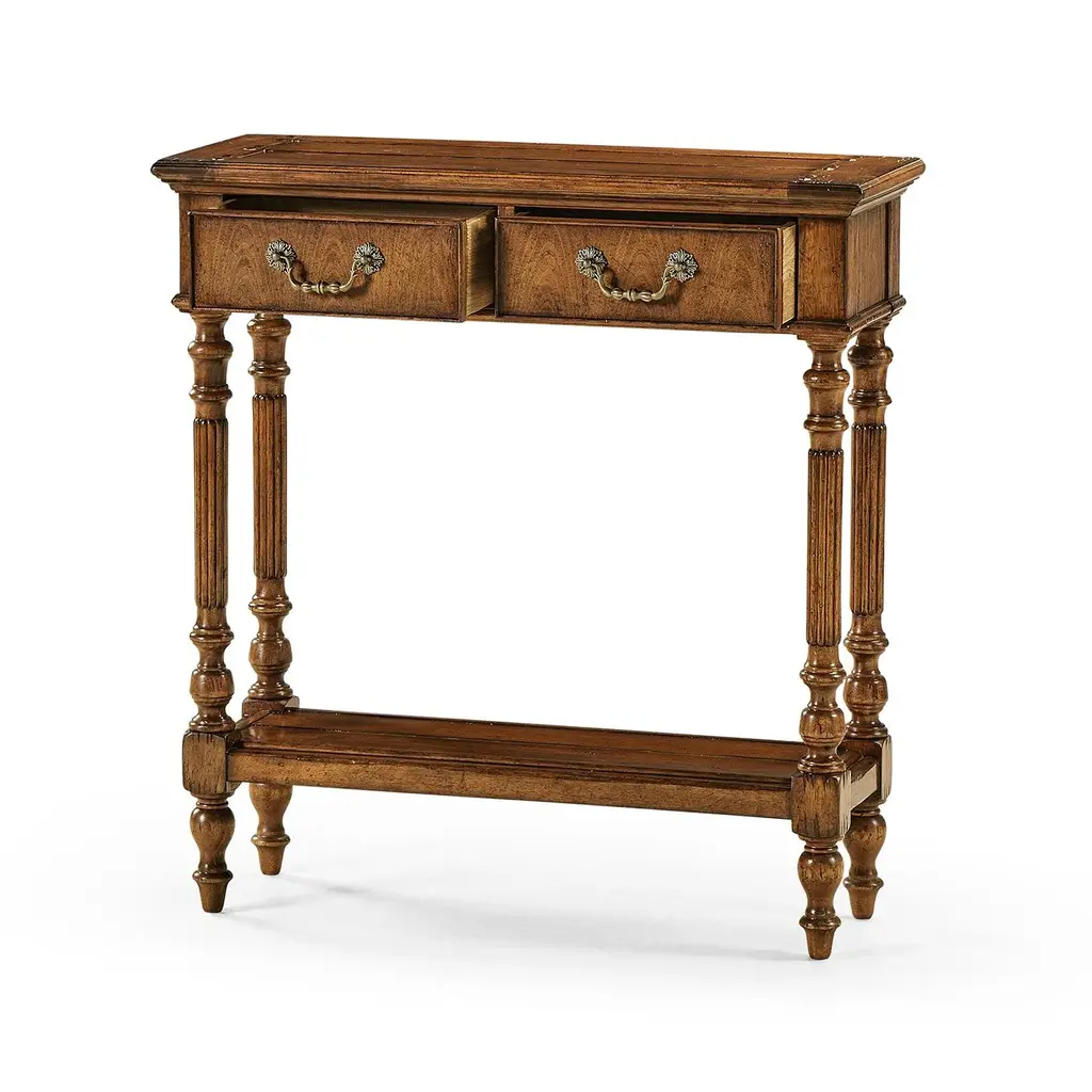 Designed in an antique walnut finish, this console features a planked top and shelf, lending a rustic charm to its classic silhouette. The two drawers, adorned with custom cast brass hardware, provide discreet storage while maintaining the table’s refined aesthetic. Fluted and baluster-turned legs give this piece an air of Jacobean grandeur, while the lower shelf offers additional space for displaying decor. Constructed from premium acacia wood, this console table is not only a visually stunning accent but also a durable and functional piece suited for entryways, hallways, or compact living spaces. Dimensions: 31.125" W x 11" D x 33" H