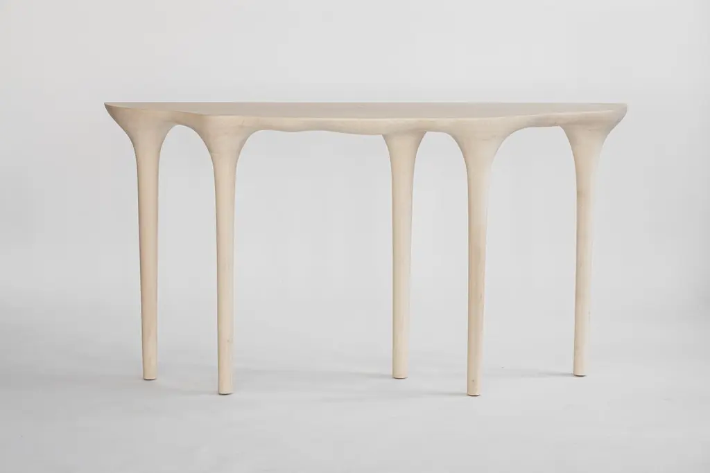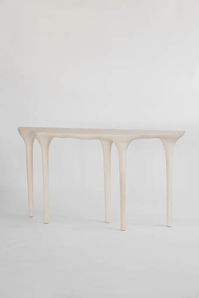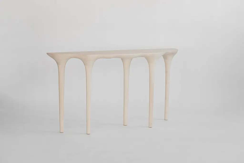 The BTRFL Collection is the first historical furniture collection of Cedric Breisachera series. It resluts of hand-carved pieces that evoke the seamless flow of nature, giving the impression that each object is sculpted from a single, continuous piece of wood. This illusion is made possible by the precise craftsmanship of its assembly, where each join is so carefully executed that the transitions become invisible to the eye.Directly inspired by natural forms, each piece emerges from the carving process guided by the organic lines of the wood itself. Following the grain and allowing intuition to lead, shapes reveal themselves gradually, transforming the raw material into fluid, harmonious forms. The result is a collection that feels alive, as if shaped by nature’s own hand, bringing an elegant and organic presence to any space.Carved wood from France, vegetal dye from chlorophyle (green color) and hydro mat varnish.. Resistant to a daily use.
