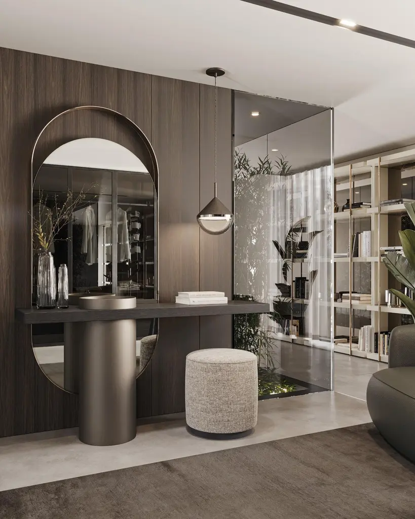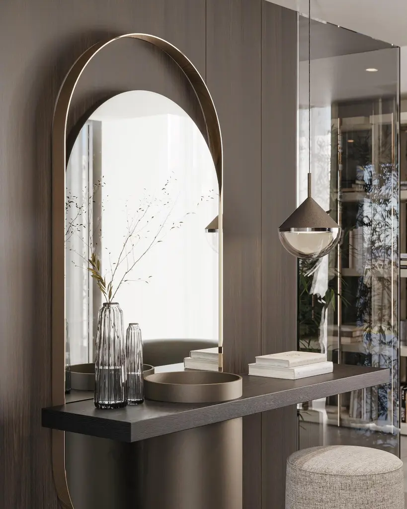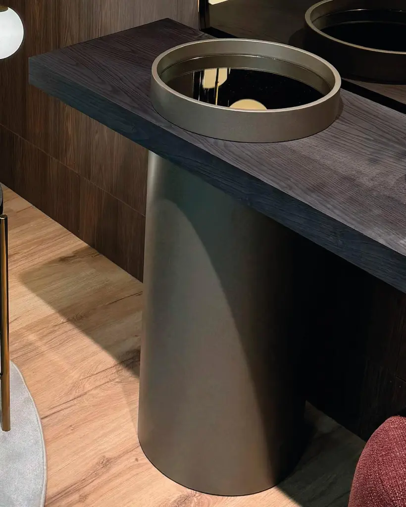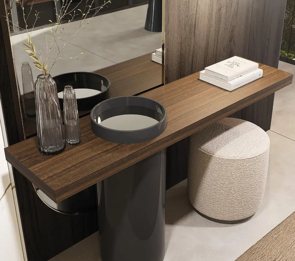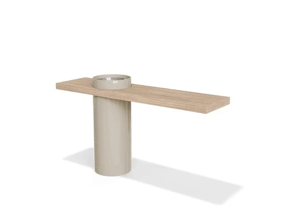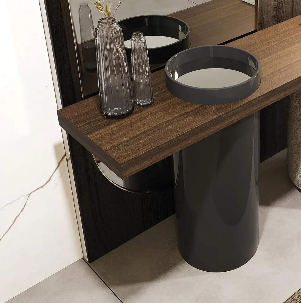 This contemporary console table combines elegance with functionality, featuring a sleek wooden top supported by a bold cylindrical base. The standout feature of this design is the circular storage compartment located at the top of the cylindrical base, which extends through the shelf above the surface. This compartment includes a mirrored base, available in normal, gray, or bronze finishes, adding a touch of sophistication while offering practical storage.The console is also available in various lacquer and wood finishes to suit different interior styles. It can be made entirely in lacquer, entirely in wood, or with a combination of both, offering endless customization possibilities. If no specific finish is indicated, the default configuration provides a balanced and versatile look. Our pricing includes all costs for international shipping to the U.S., as well as duties and customs clearance fees. Please be aware that local delivery within the U.S. is not included. We offer white glove, front door, and warehouse delivery options. For shipments outside the U.S., kindly reach out to us for a detailed quote.We do our best to expedite production and to ship and deliver product within the listed lead time, however current lead times might be longer due to global shipping backlog and delays. These delays are out of our control and cannot be a reason to cancel an order.