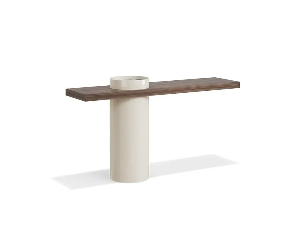 Contemporary Sculptural Console: High Gloss Cylindrical Base & Matte Walnut Top