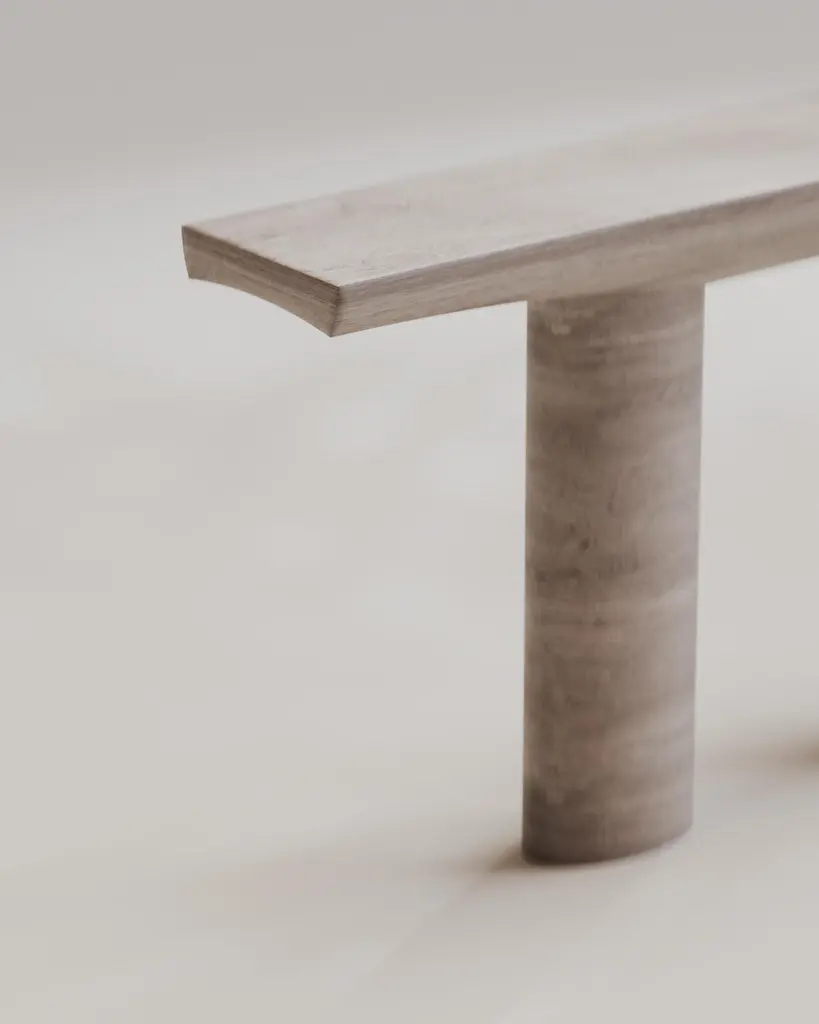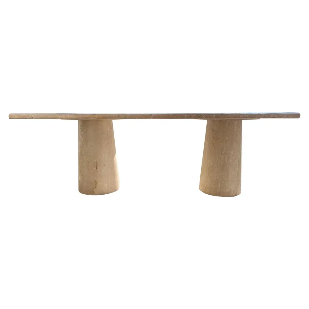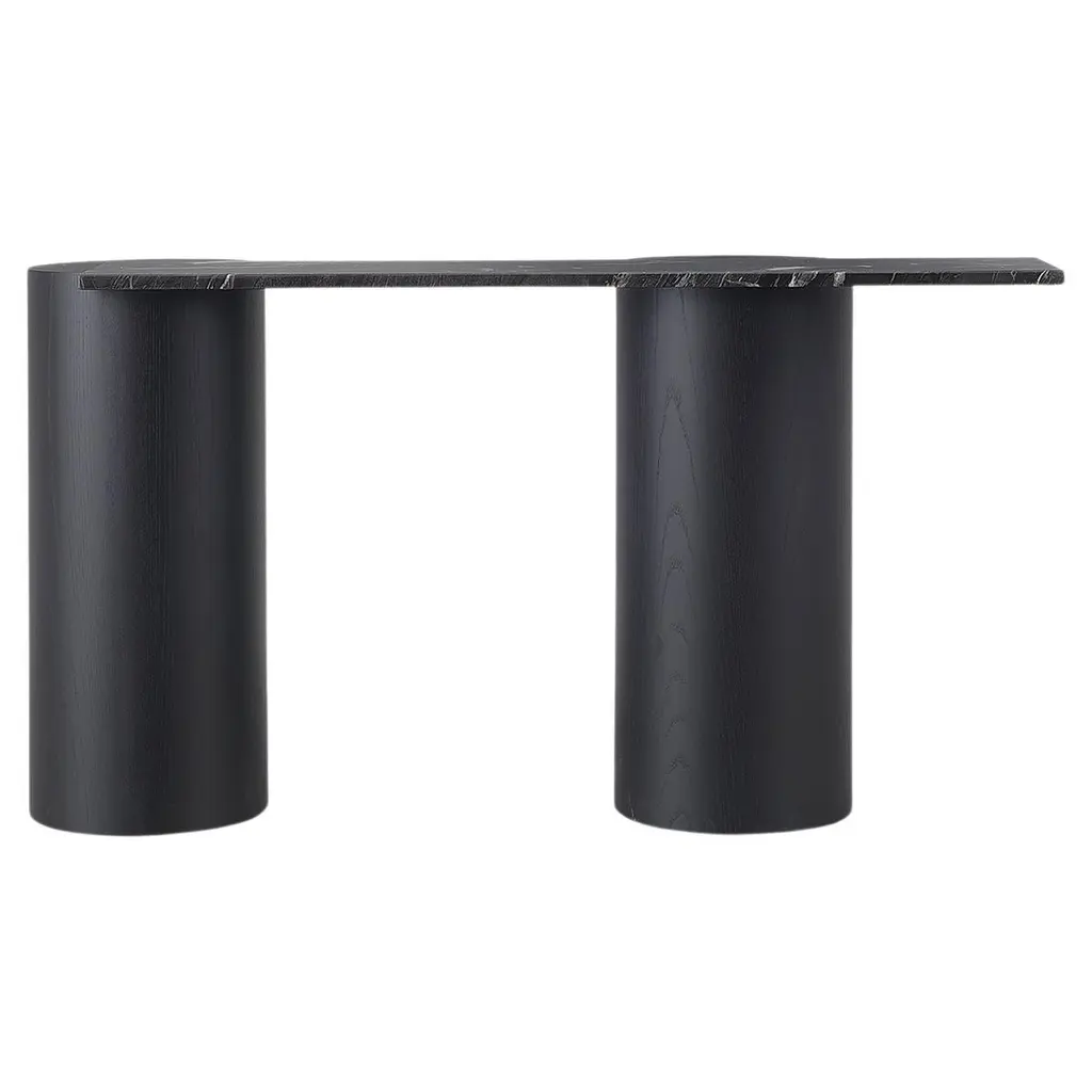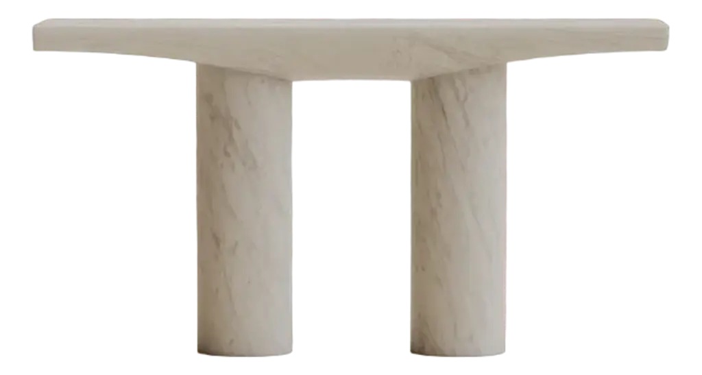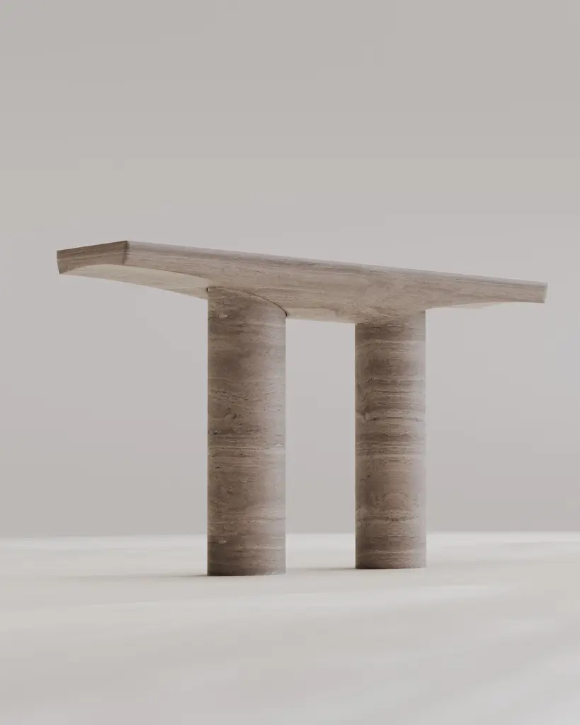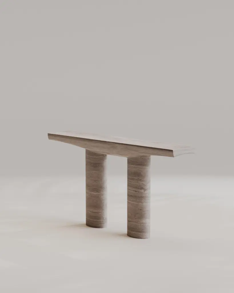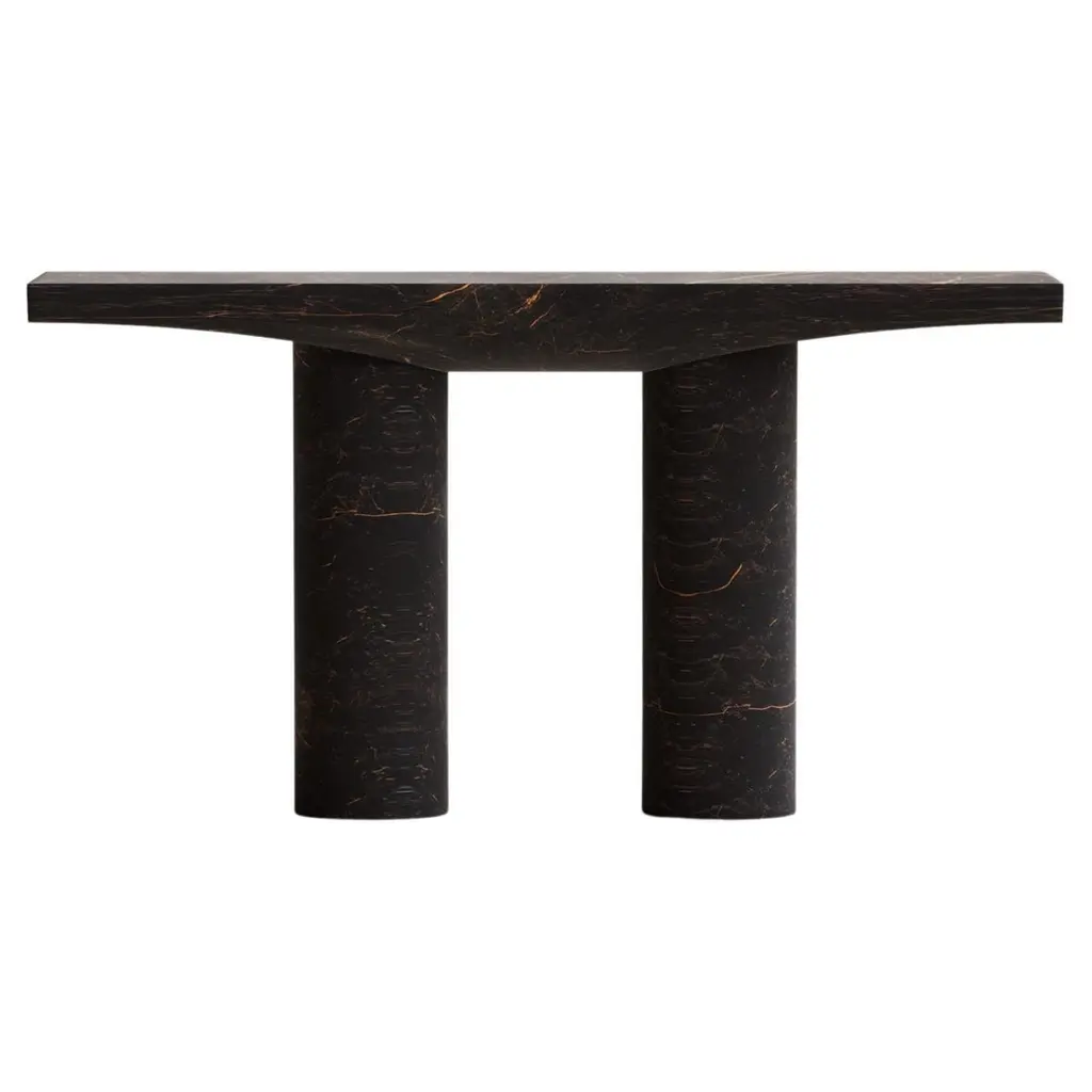 Introducing the "Abraccio" Collection or translated "embrace" Collection unites the enduring beauty of solid carved marble with a language of form that pays homage to primitive structures. Two primal shaped columns support a commanding horizontal solid slab. It becomes a conversation between classical and contemporary, nature and craftsmanship, geometric precision and organic shapes. Yet, it's the ellipsoid embrace that truly defines the collection's character. These graceful curves, meticulously carved into the stone, encircle the columns like an enigmatic story waiting to be deciphered. This ellipsoidal motif not only adds a layer of visual allure but also imparts a sense of unity and balance, bridging the gap between the geometric precision of the columns and the softer lines of the surrounding space.Hand crafted solid marble by Serafini. Each stone will be selected together with the client to create the desired effect. Custom stones/marbles are possible upon request. We can also do different sizes.