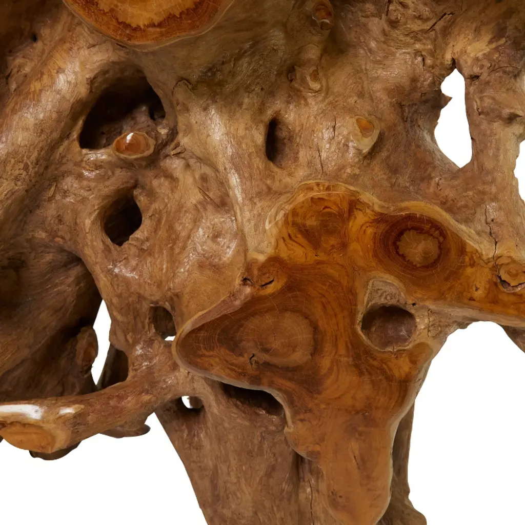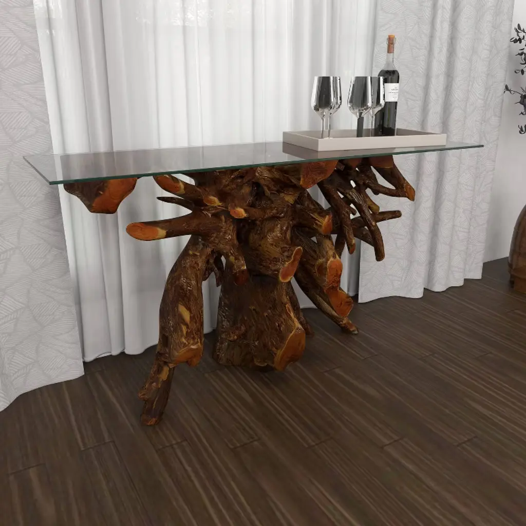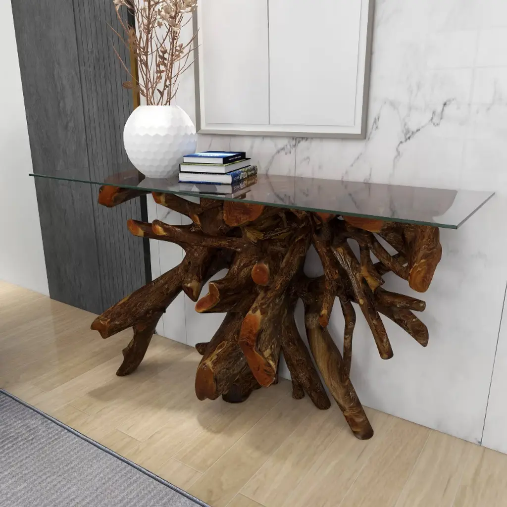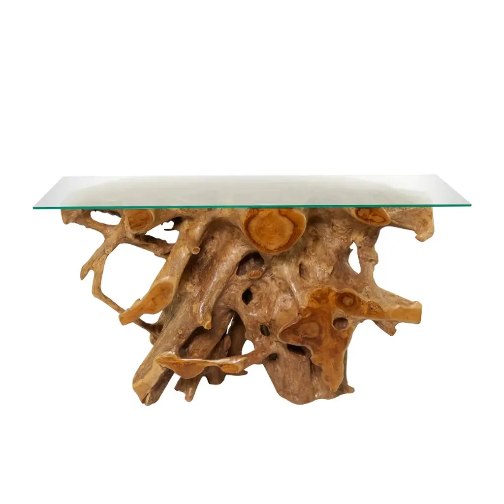 Bring a finishing touch to your home with an inviting appeal with this console table. A sturdy and long lasting construction for a years of enjoyment. Display this teak console table in your entryway and decorate it with wooden sculpture, tall sleek lamp and natural canvas art for a refined look. This item ships in 2 cartons. The one-of-a-kind item you have purchased is made from the stumps and unused trunks of harvested teak trees. This teak comes from ecologically managed forests. Once the tree is harvested, the remaining stumps must be removed to make space to plant replacement trees. In the past, these pieces would be harvested and then burned to dispose of them, which created pollution. Today we use these tree stumps and trunks to create beautiful, handcrafted pieces for your home. Coloring, cracks, and shapes will vary between items. Each one is unique and the artisan works to bring out the inner beauty within the tree to become a cherished piece of art for your home. Suitable for indoor use only. This item ships fully assembled in one piece. Due to the live edges of the piece, each is unique, so no two products will have an identical pattern, shade, or cut. Maximum weight limit is 75 lbs. Made in Indonesia. This is a single brown colored entryway table. Contemporary style.