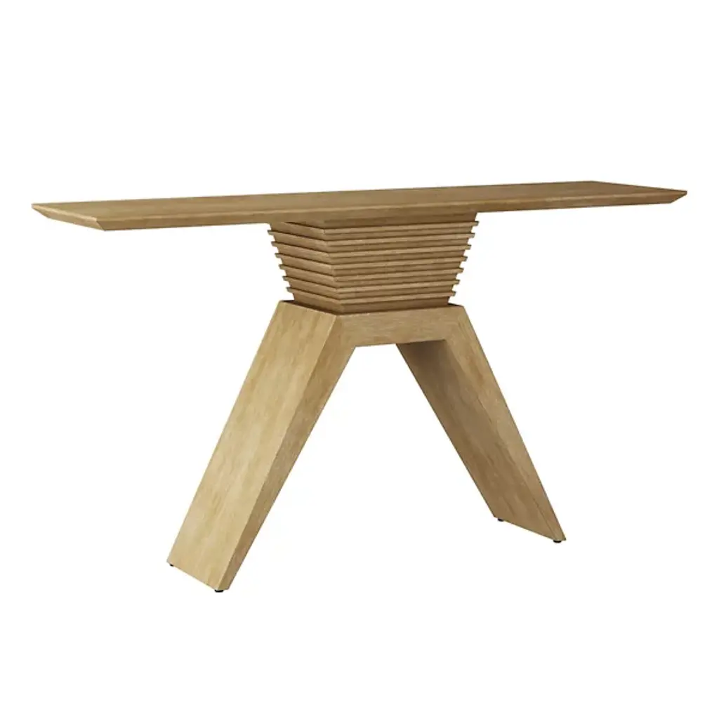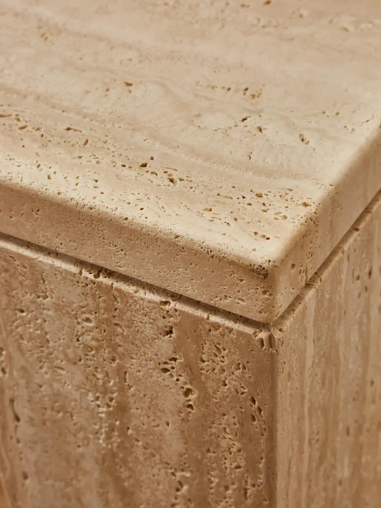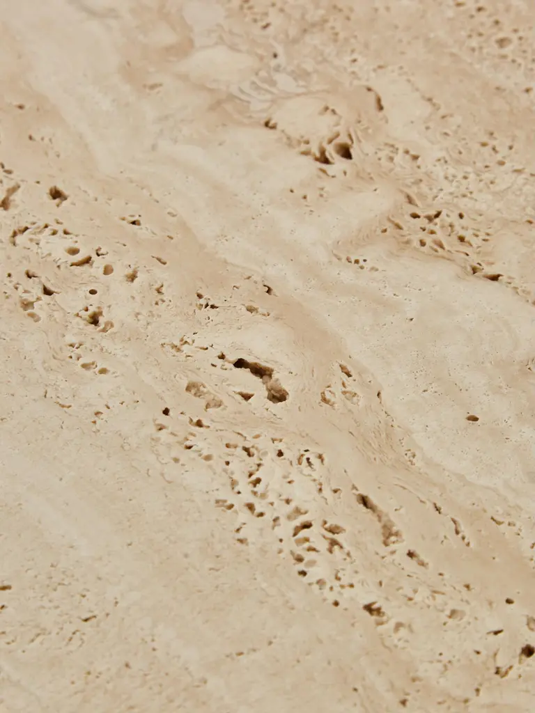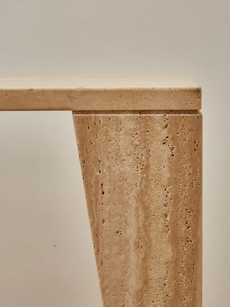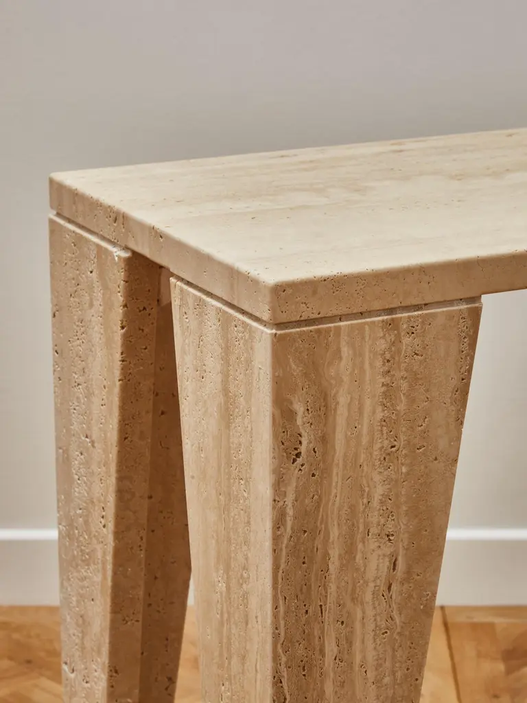 Elegant travertine consoles entirely made of travertine. Four triangular feet supporting a rectangular top.Made to measure available.