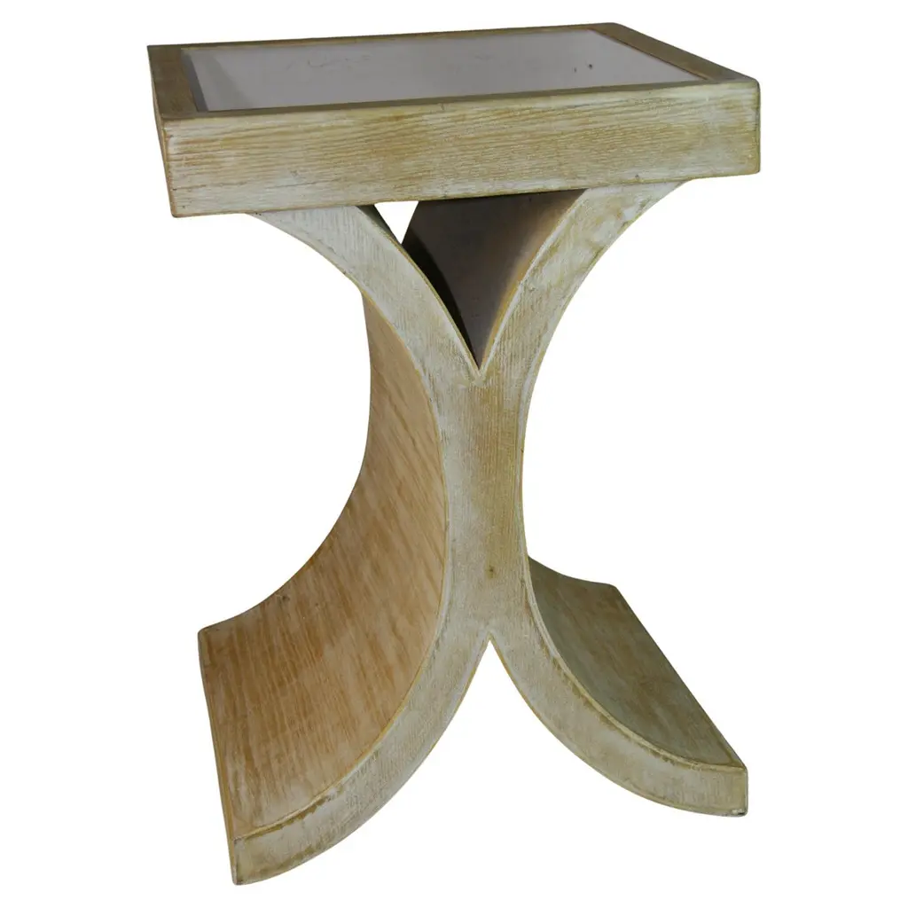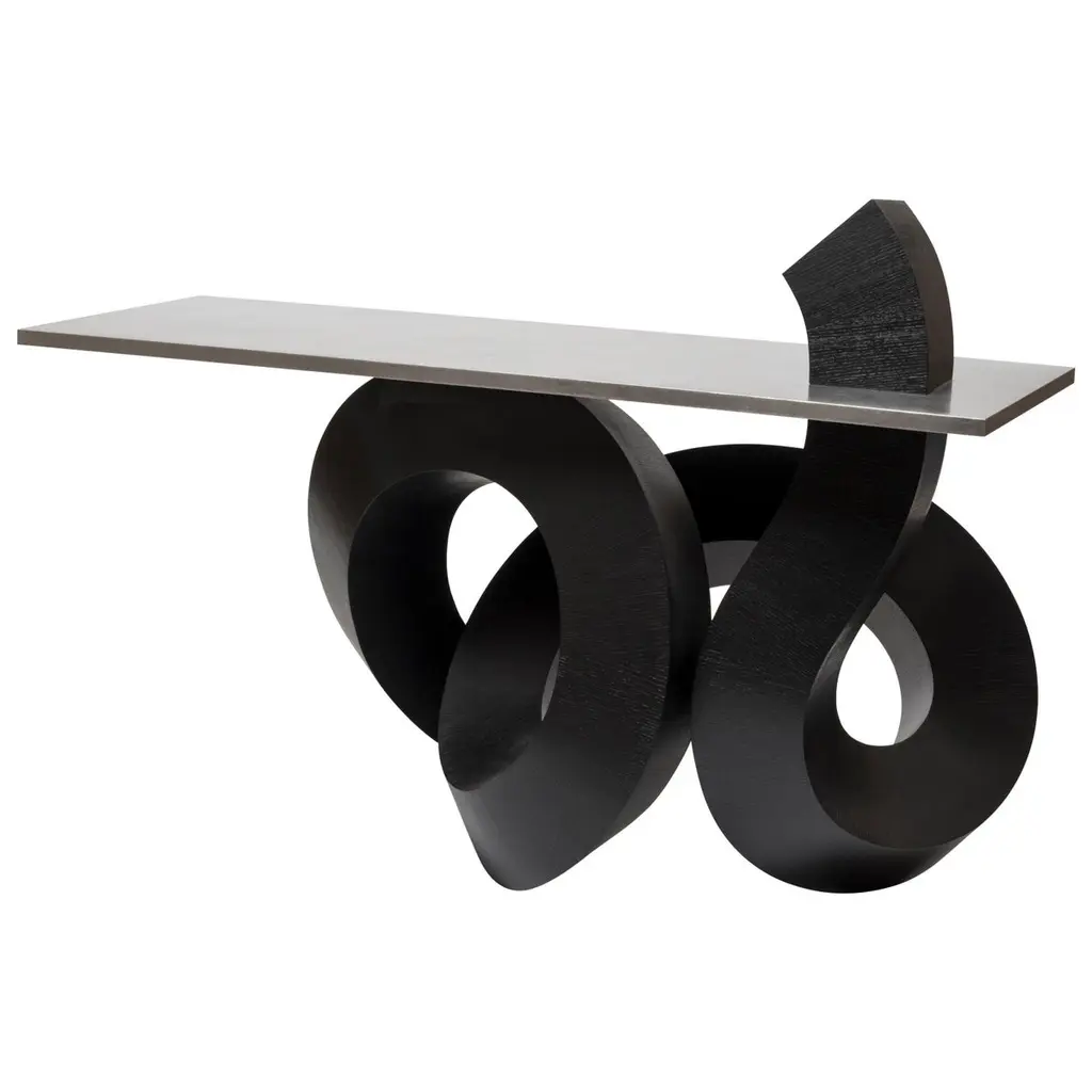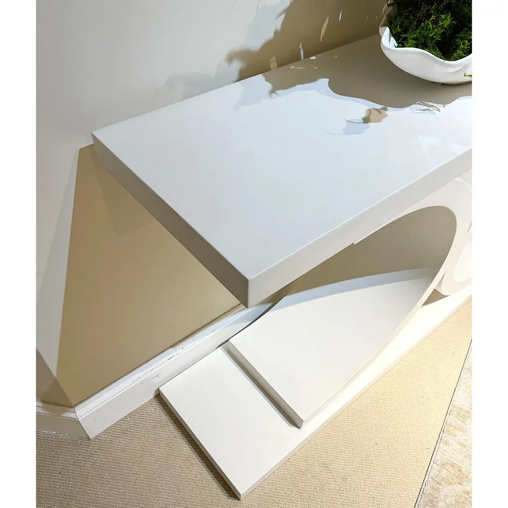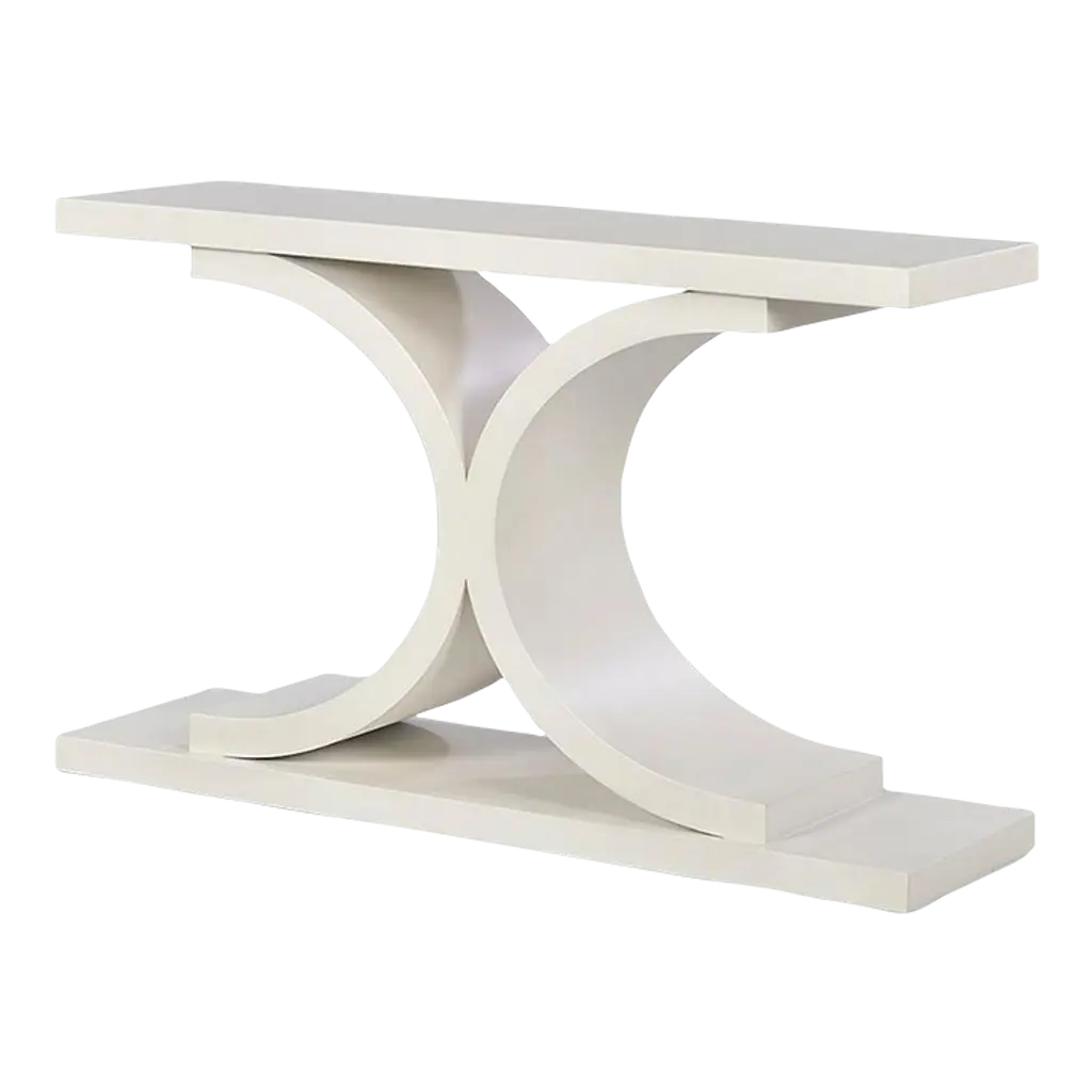 Contemporary White Painted Console with a bold rectangular top, with an unusual incurved C form column raised on a plinth base.The finish is in the Egret white lacquer with a satin finish.Dimensions: 54" W x 13" D x 32" H.
