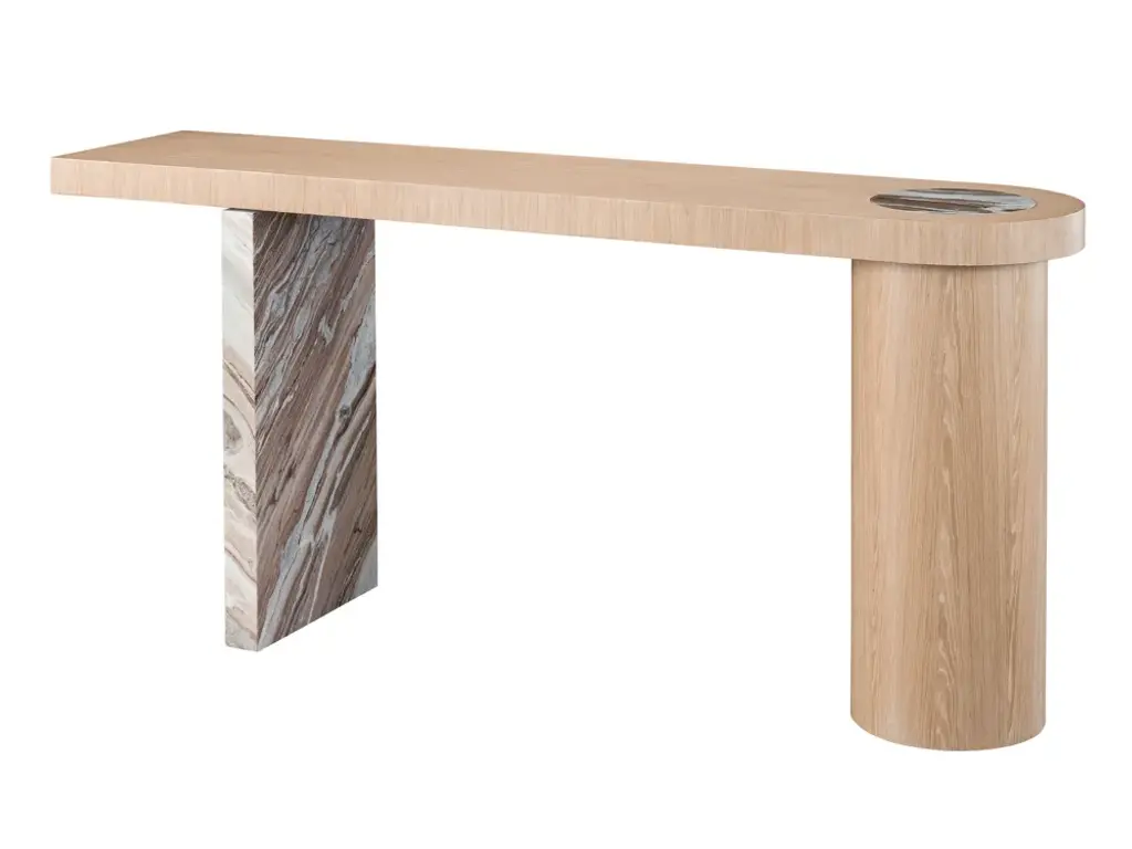 Imaginative and free-spirited, the Wood and Stone Console creatively marries an oak-finished silhouette with one marble pedestal leg offset by a petite marble tabletop accent. Assembly Required? Yes