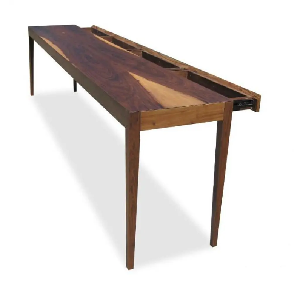This sleek and elegant console table features hidden drawers, mitered into the face of the front edge. Shown in natural Argentine Rosewood and available in any species or finish.About Costantini DesignCostantini is a furniture design and manufacturing company founded in 2002 by artist and designer William C Stuart. The name Costantini comes from his maternal grandfather, a first generation Italian-American. Born in New York City and raised upstate, William majored in studio art at Colgate University with a year abroad in Paris, graduating with honors. In 2001, he traveled to Buenos Aires and fell in love with the culture and craftsmanship instantly. He designed his first collection soon after and opened an art and design gallery in Los Angeles. A decade later, he came home to New York and now has a studio in the famed West Chelsea Arts Building where his works blur the lines between art and functional design. The team of artisans continue to produce the majority of the furniture in Argentina. Aside from private collections, some notable public projects include the Hotel Bel Air, the Sultanate of Oman, Bergdorf Goodman, NoMad Hotels, Four Seasons, Ritz Carlton, and Grand Hyatt. Our work has been featured in publications such as Architectural Digest, Galerie Magazine, the Wall Street Journal, Interior Design Magazine, Luxe, and more. Visit us at our New York studio, open by appointment.