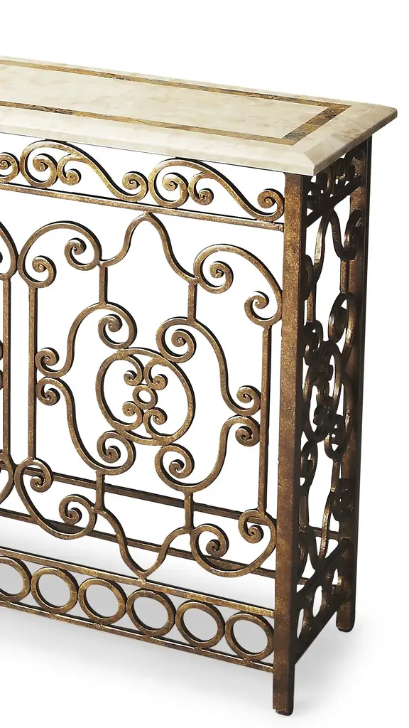 This stunning console table will be the brightest spot in your room. Its white fossil stone veneer top has a snake skin fossil stone inset border. Its intricate hand forged wrought iron base provides a beautiful counterpoint in an antique gold finish. Durably Constructed With: Wrought Iron, Plywood, White Fossil Stone, Snakeskin Stone Product Construction Features: Finish Distressing Product Assembled Measurement & Weight: 34.25" H x 52.25" W x 14.5" D -- 125.0 lbs. 165 lbs. Suggested weight capacity Item Arrives: Assembled Stone is natural material and is known for its variation in color, carbon deposits and veining patterns. Variations in colors, shade and markings are normal and can be expected with the natural materials used in the construction of this product. Avoid placing hot or wet items on surface. Coaster or trivet recommended Photo may slightly differ from actual item in terms of color/finish due to the lighting during photo shoot or the monitor's display.
