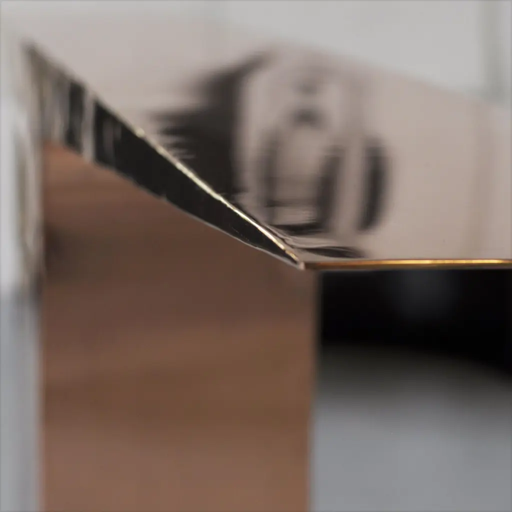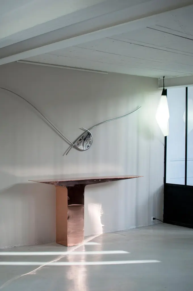 Copper Blade Console by Pol Quadens Limited Edition Of 8+4 Pieces.Dimensions: D 30 x W 210 x H 95 cm.Materials: Polished red copper.Pol Quadens was born in Brussels. His father was active in the fields of composites the metal industry, and the world of materials, therefore, surrounded Pol since his early childhood. After his artistic studies, he starts restoring vintage cars. This experience has allowed him to gain strong practical skills and a deep knowledge of all materials.In 1987, he made his first creations and production of objects. His sensitivity and passion for the arts led him to create functional artworks. His CD shelf has sold more than 100,000 pieces and has become iconic in its category.