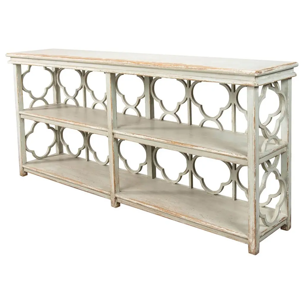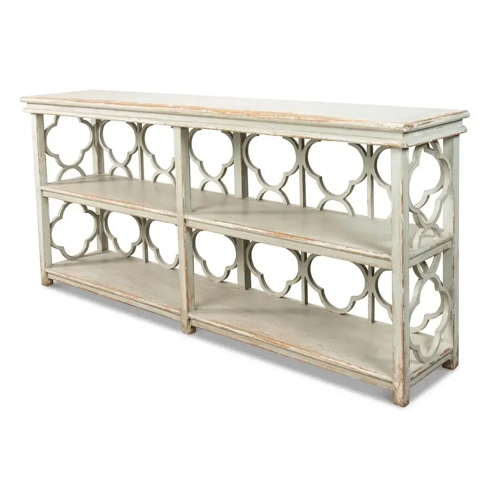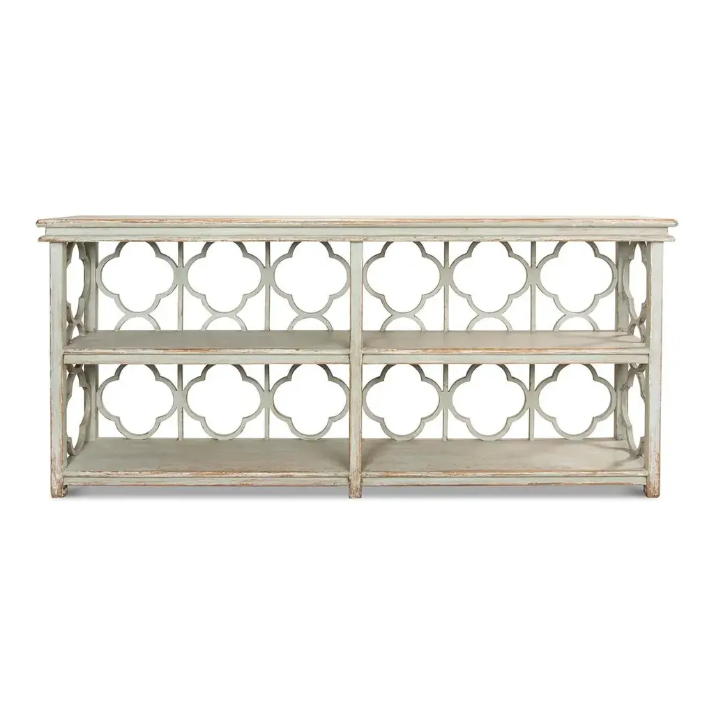Country Painted Quatrefoil bookcase or long console table with a painted green distressed finish. A beautiful piece for book storage and display, this bookcase console table features an openwork quatrefoil design on the back and sides. Constructed of reclaimed pine, this piece features a weathered or distressed painted finish. Dimensions: 78" W x 16" D x 35" H