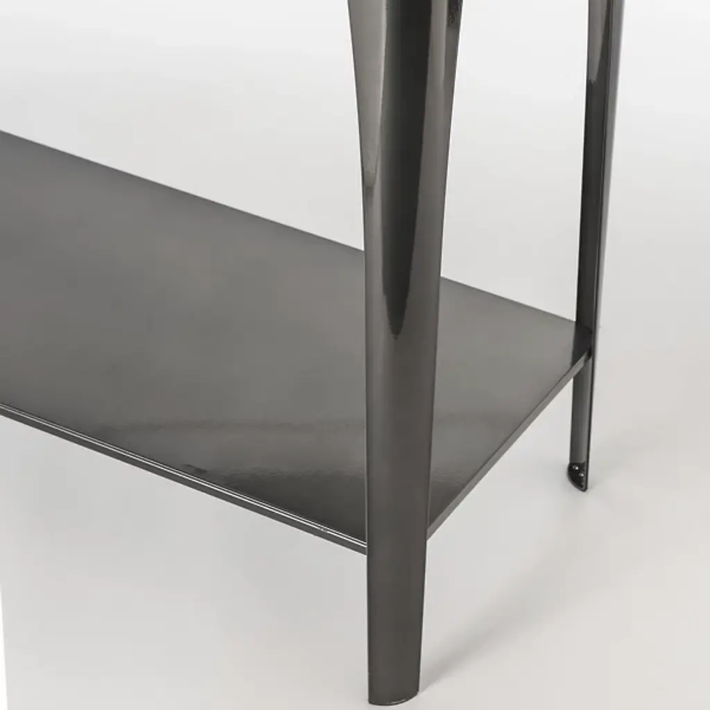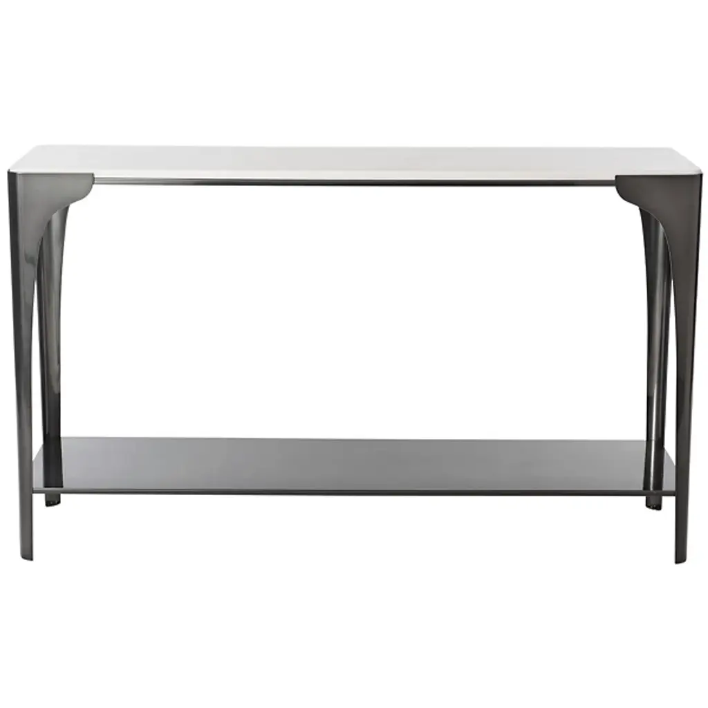 Clean lines and elegant curves for modern interiors. Behind a sofa or in an entryway, the Cove Marble Top Console Table by Hubbardton Forge shows off impeccable craftsmanship in its handmade steel legs and frame. A bright slab of solid marble acts as the smooth, visually textural top. The shape of the top is duplicated in the lower steel shelf, offering a cohesive look to the overall design of the console table while also adding to its functional with additional storage space.