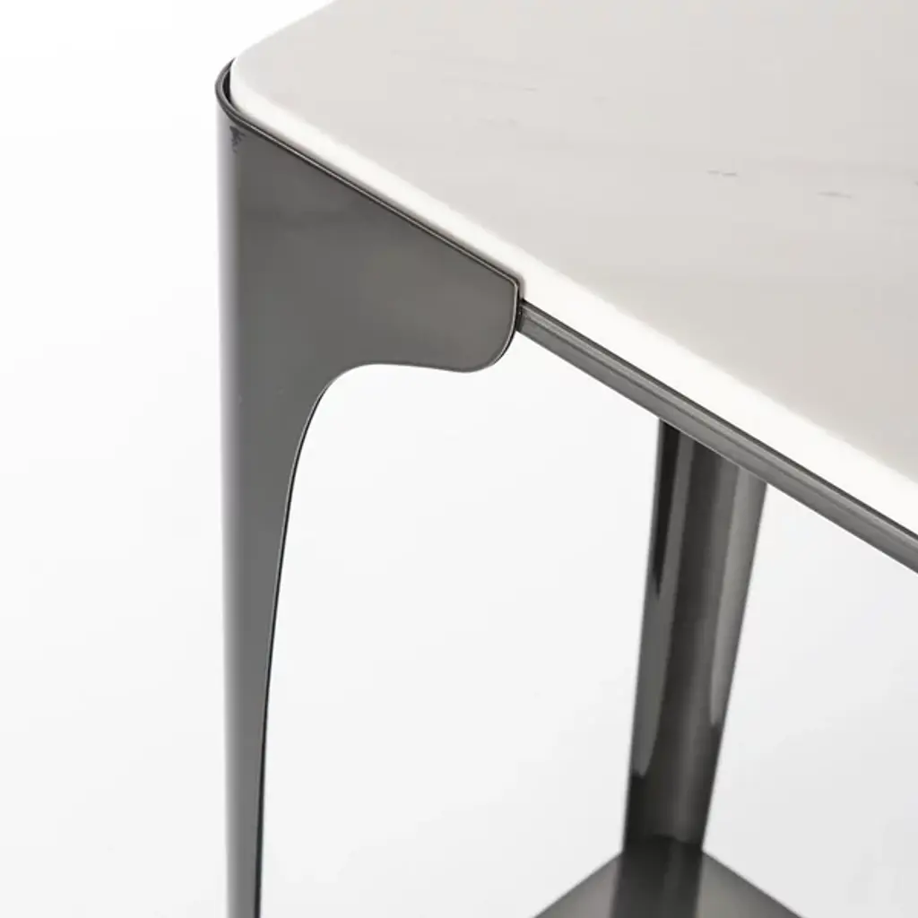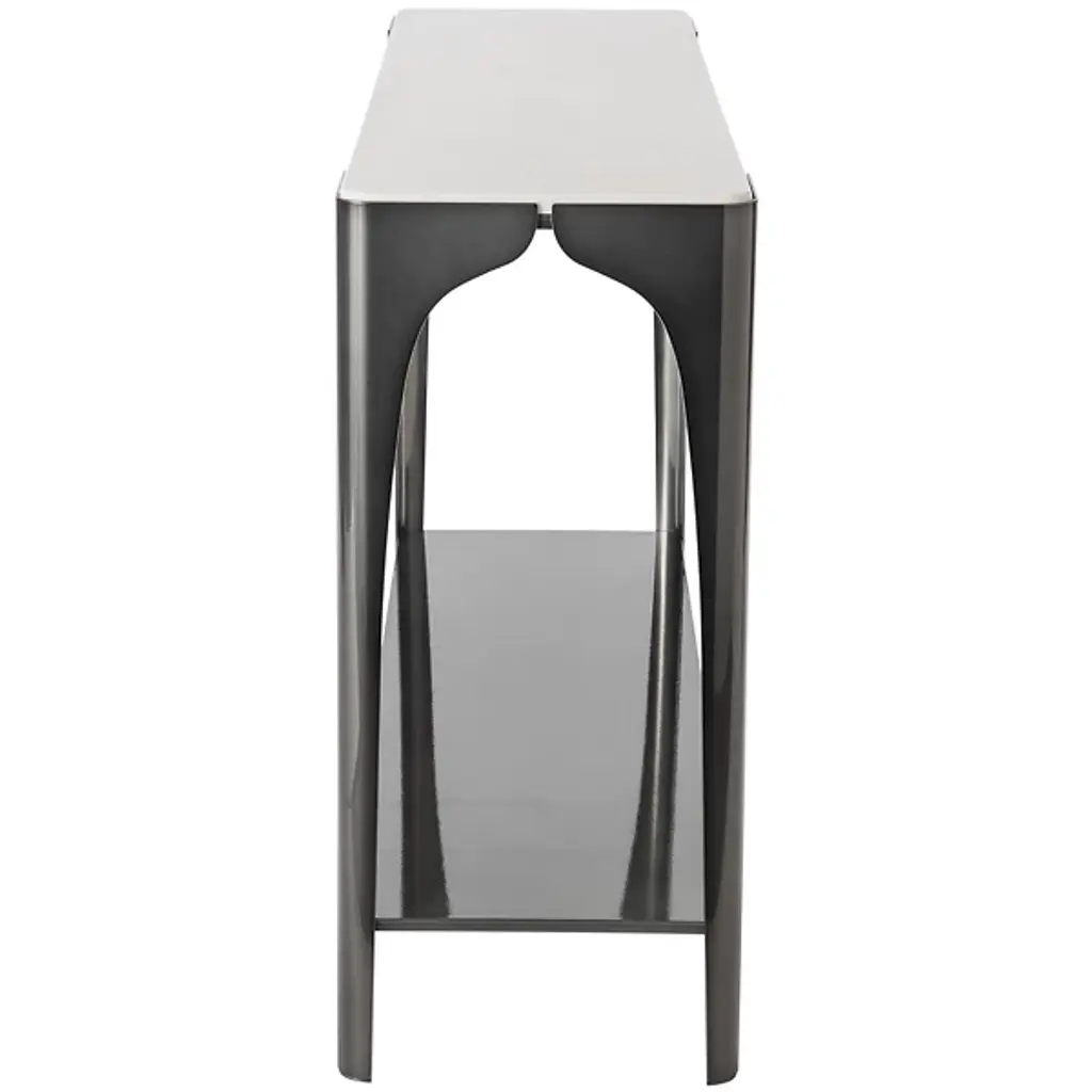 Clean lines and elegant curves for modern interiors. Behind a sofa or in an entryway, the Cove Marble Top Console Table by Hubbardton Forge shows off impeccable craftsmanship in its handmade steel legs and frame. A bright slab of solid marble acts as the smooth, visually textural top. The shape of the top is duplicated in the lower steel shelf, offering a cohesive look to the overall design of the console table while also adding to its functional with additional storage space.