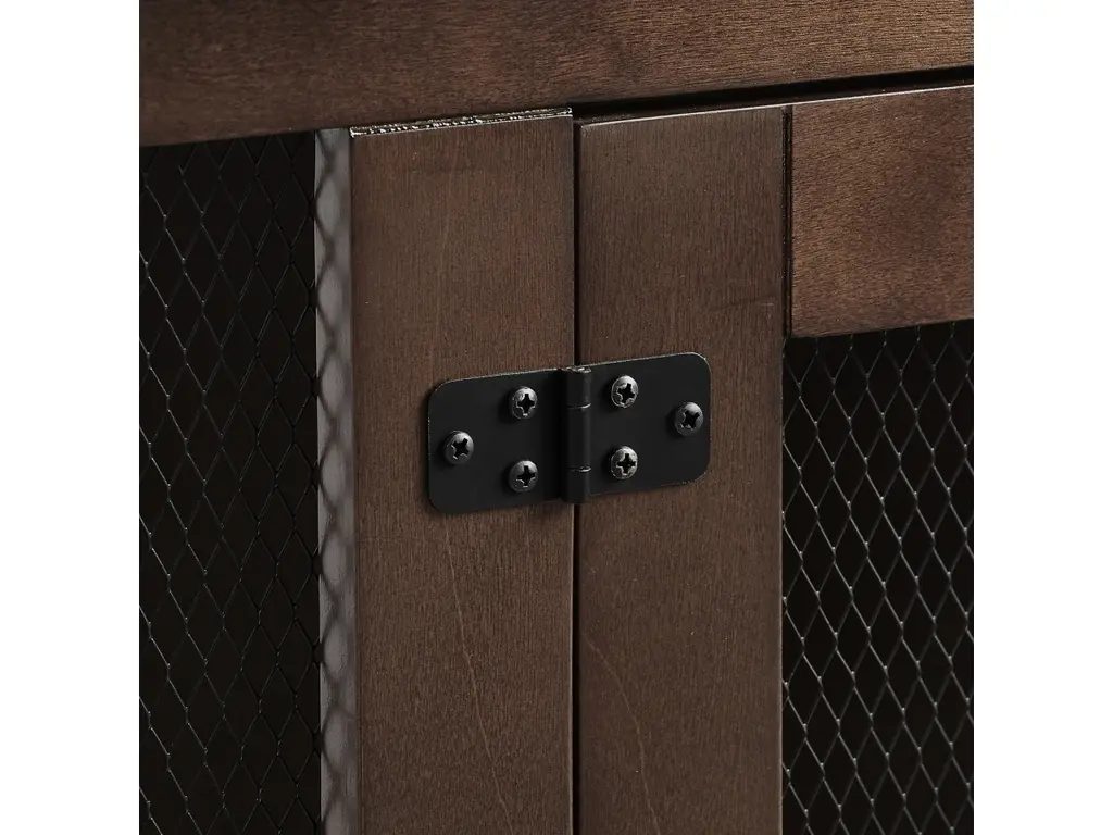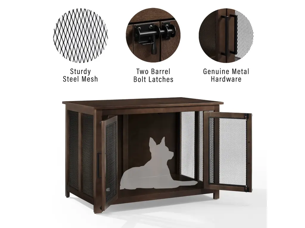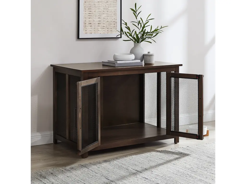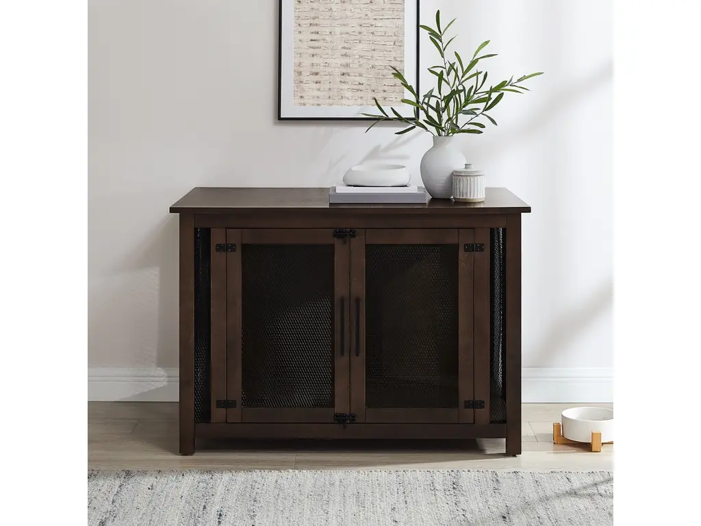 The Dane Credenza Dog Crate gives your precious pooch a cozy hideaway that doubles as a stylish console table. Ideal for small to medium crate-trained pets, this lovely dog kennel features durable steel mesh for ventilation and visibility. Double doors on the console make it easy to get your furry friend in and out. Though not recommended for escape artists or ardent chewers, this dog crate offers a secure and beautiful alternative to a traditional metal dog cage.