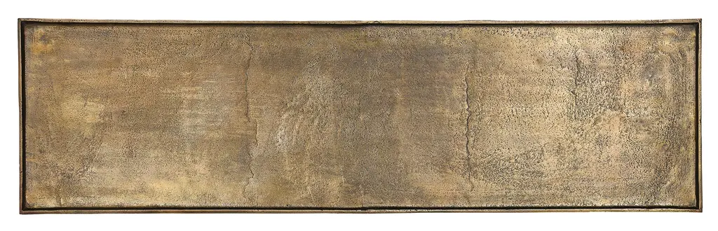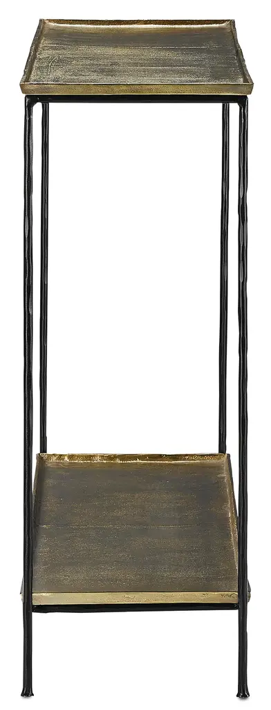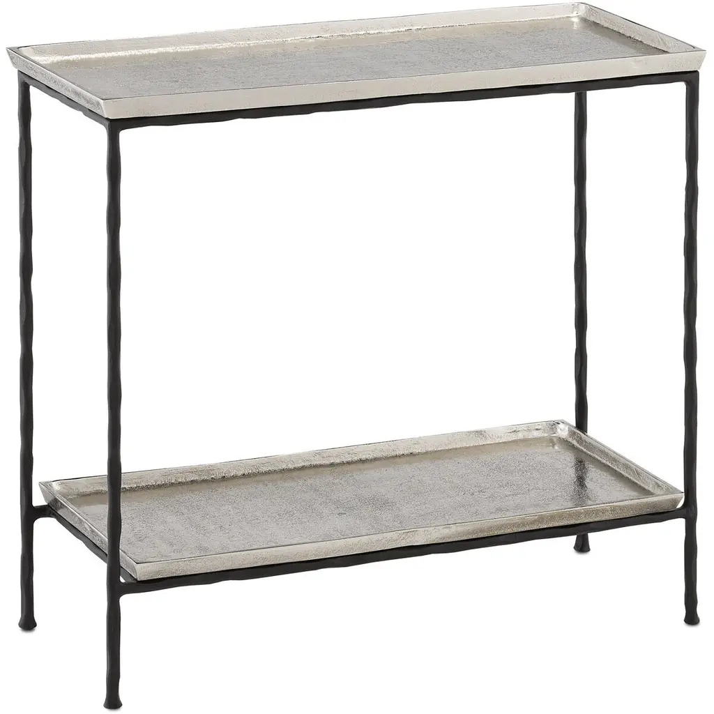 The Boyles Brass Console Table has a simple forged iron base in a black iron finish holding an antique brass tray-like top. This console table is an expressive piece of furniture for any spot where a narrow table is needed, such as a hallway or foyer. We have a number of Boyles products in silver and brass finishes. Iron/Cast Aluminum, Black Iron/Antique Brass Care Instructions: Dust with dry, lint-free cloth