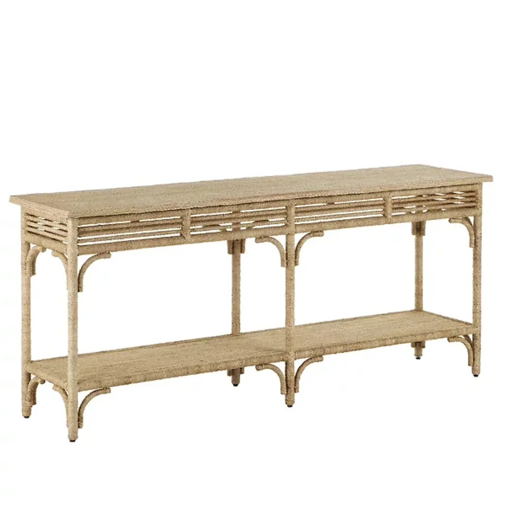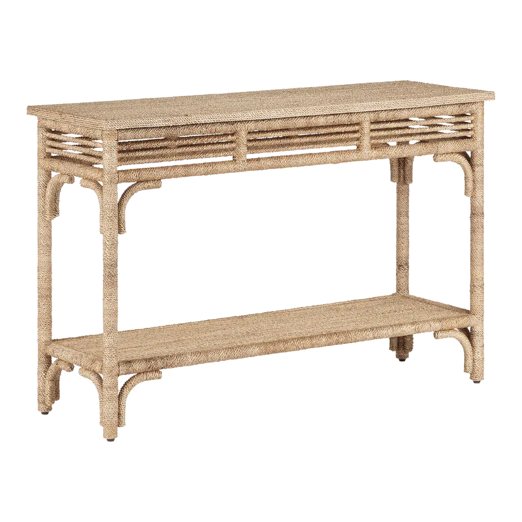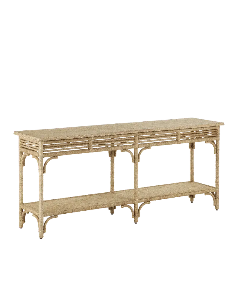 With the earthy feel of rattan and wicker but a much heavier dose of personality, the Olisa Console Table is a wrap star! Covered in braided Abaca rope, this console table would make a noteworthy statement in an oceanfront retreat or in a lovely lakeside residence. The narrow depth of the table makes it a wonderful accent for hallways and foyers.