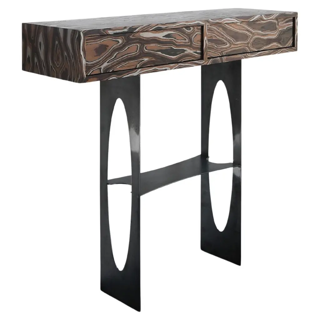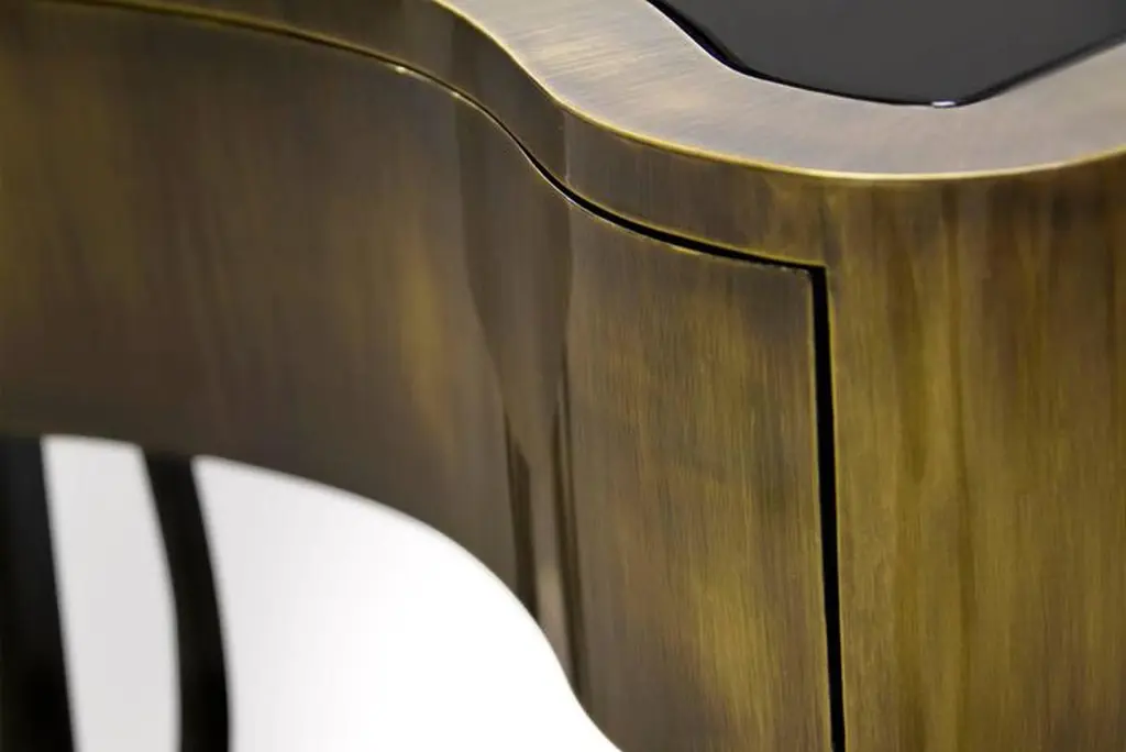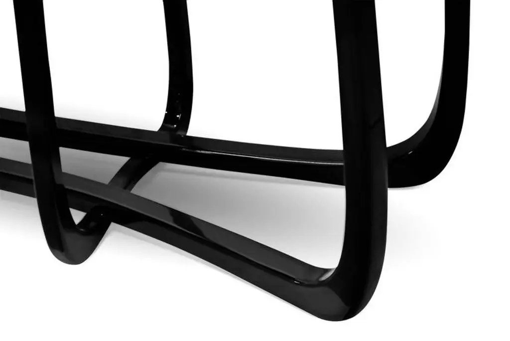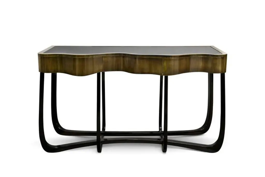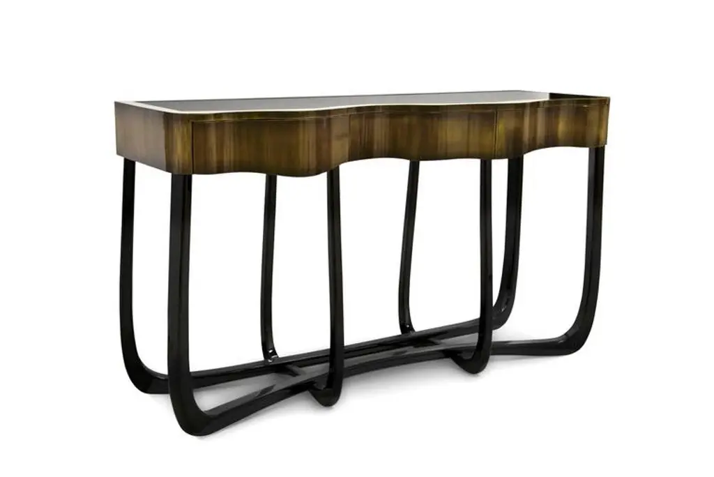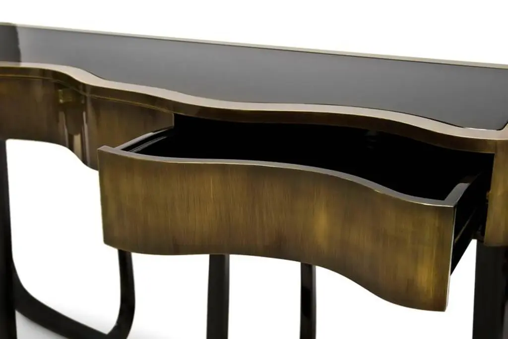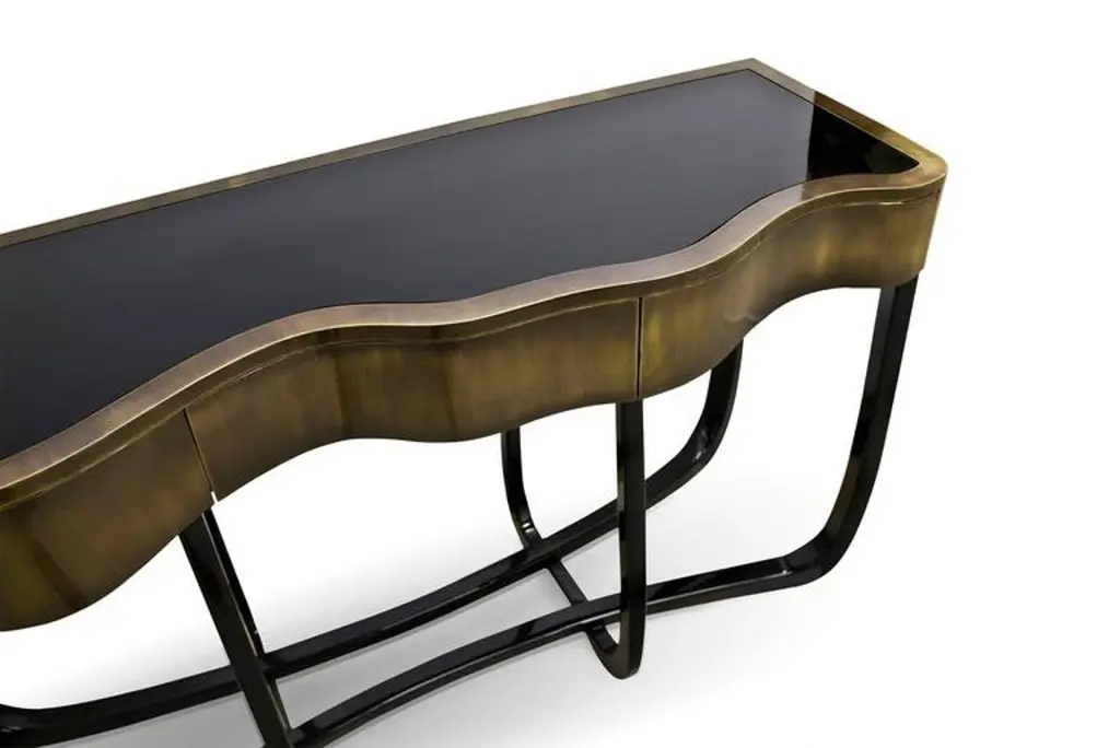 Console table Curvy with patinated brass top structure and with black glass flat top. With mahogany legs in black lacquered finish.Also available on request in polished brass finish.