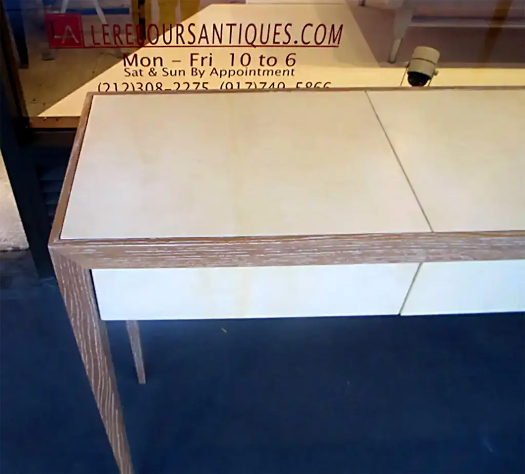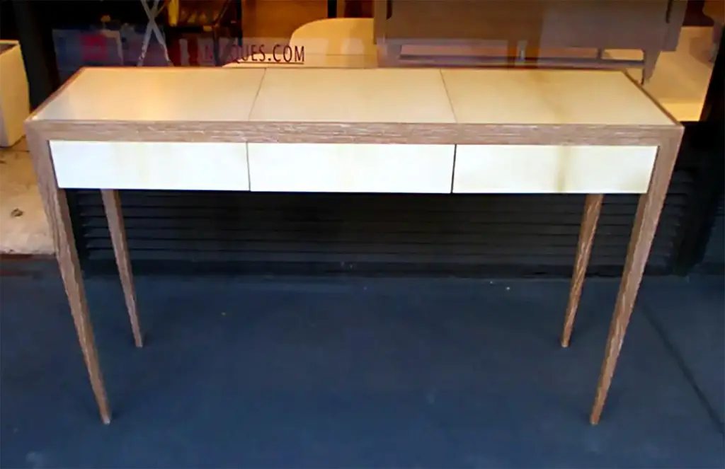 A custom cerused-oak and parchment console table in the Jean Michel Frank Manner. Lead Time is 8-12 weeks.