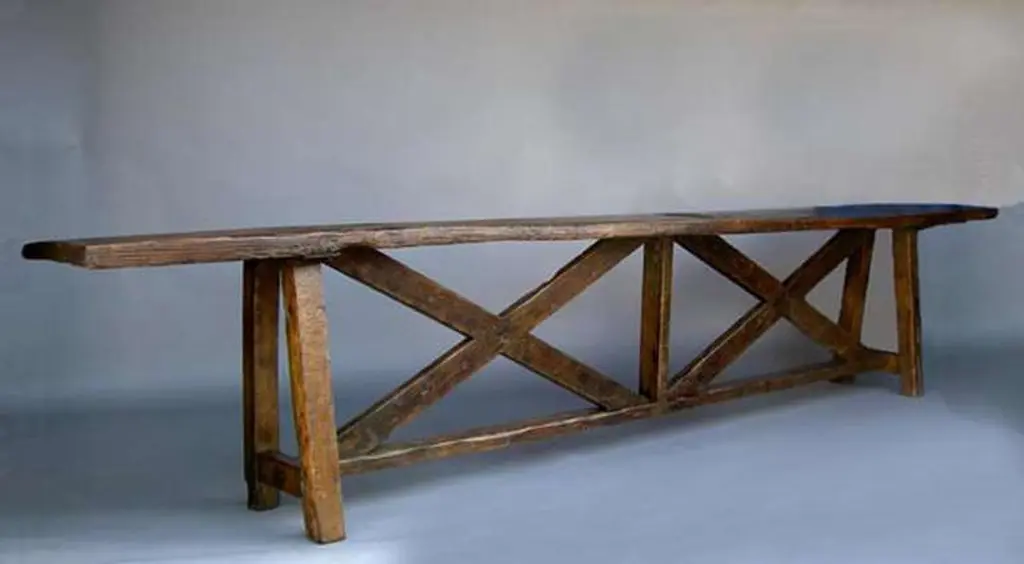 Custom oak console table with double X's. Shown in medium oak and medium to heavy distress. Made in Los Angeles by Dos Gallos Studio.CUSTOM PRICES ARE SUBJECT TO CHANGE DUE TO FLUCTUATING WOOD AND LABOR PRICES. PLEASE INQUIRE BEFORE PLACING AN ORDER. CUSTOM ORDERS ARE NON RETURNABLE. FINAL SALE