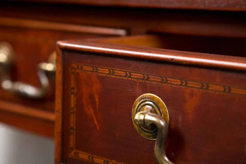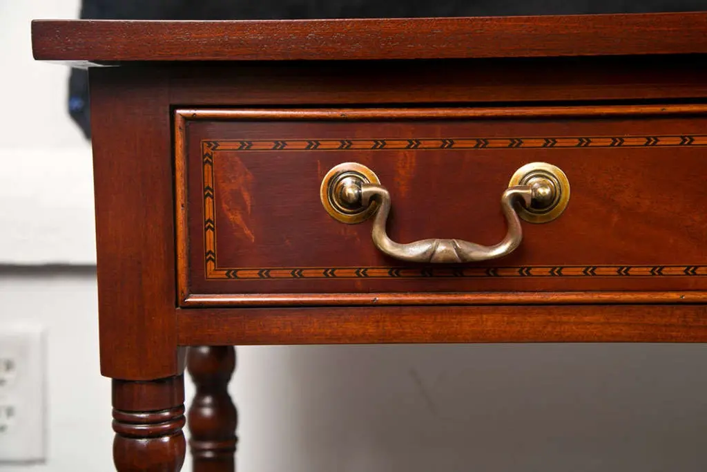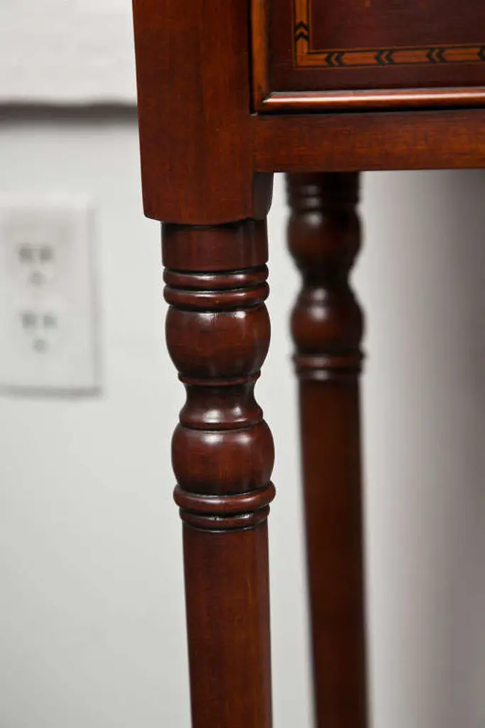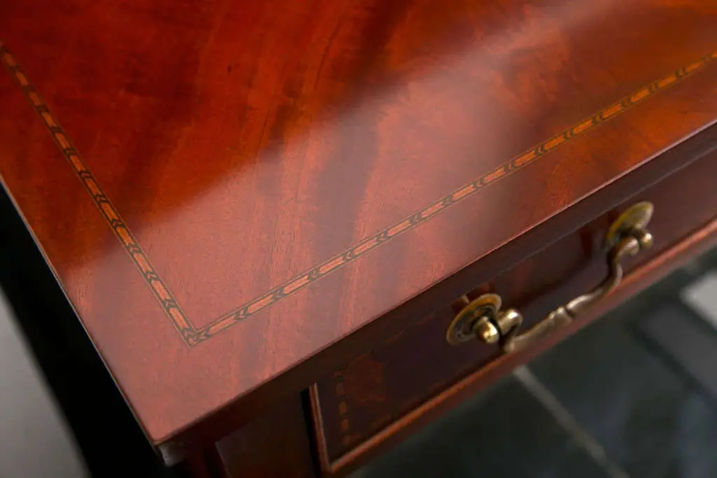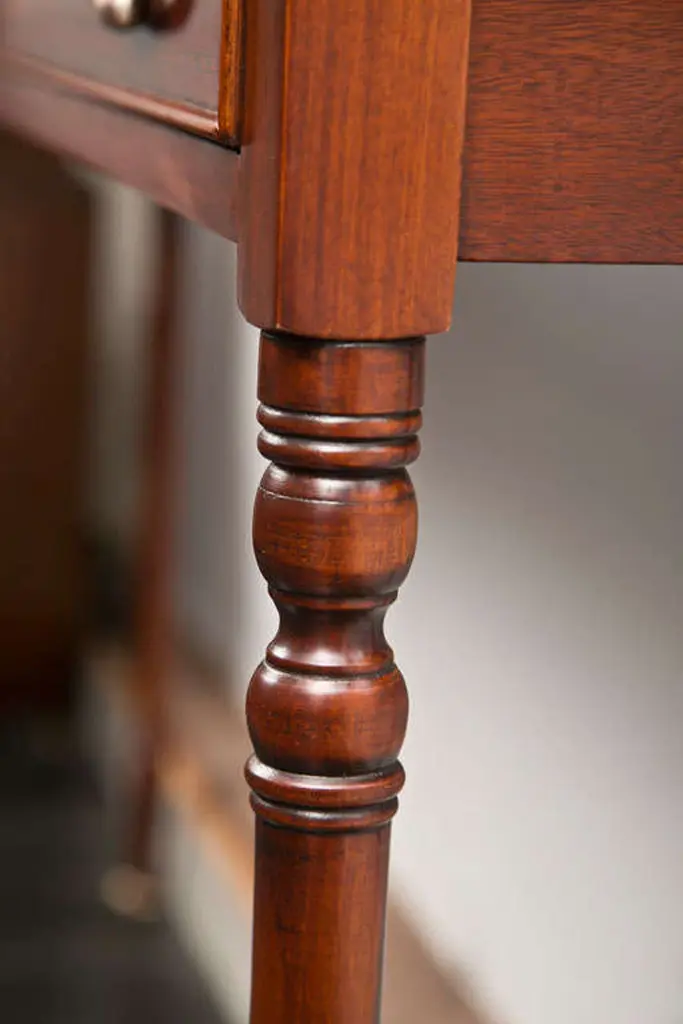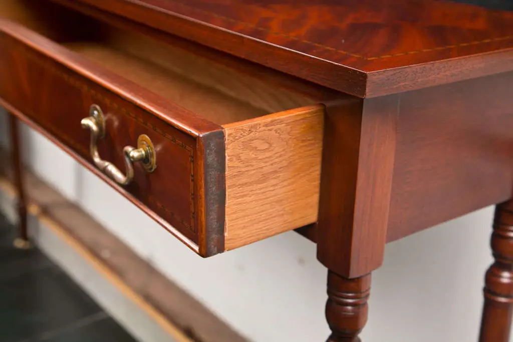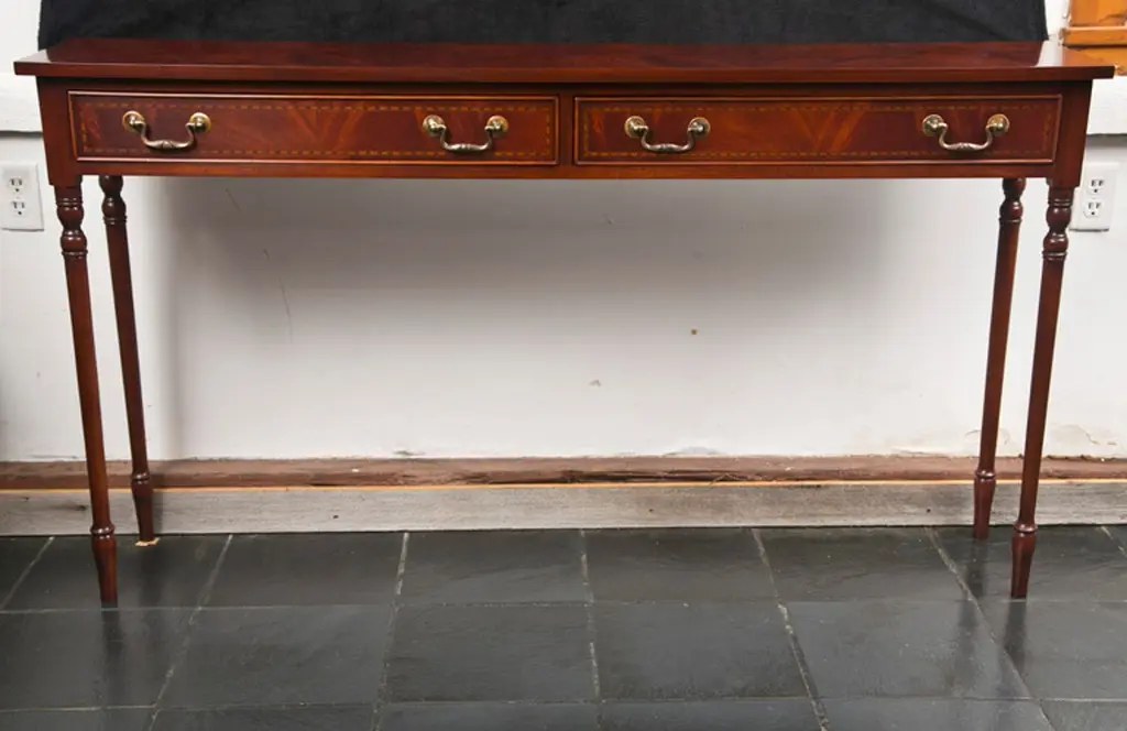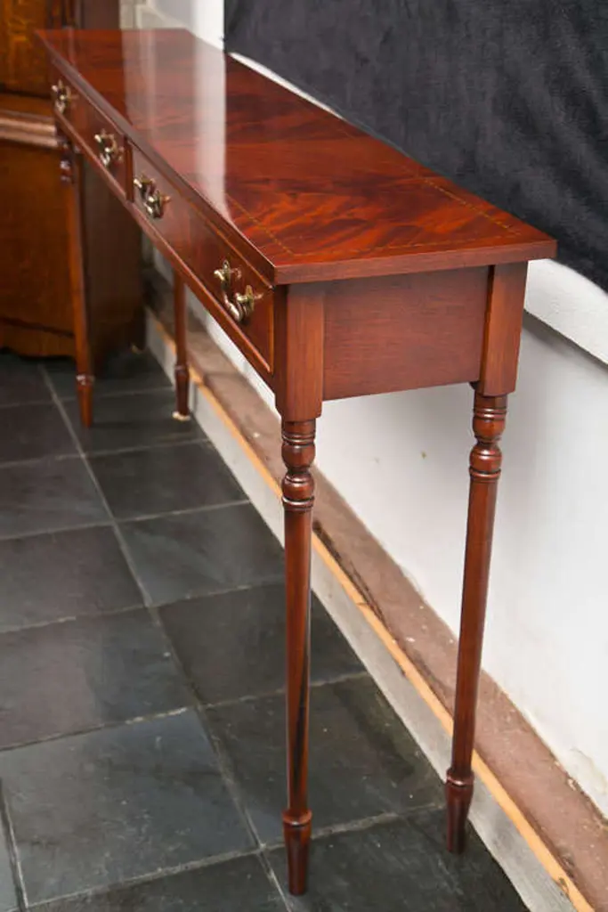 Made for us in England, this console in flame mahogany is just the right depth to squeeze into that hallway or tuck behind the sofa. With Regency touches like ebony and satinwood string inlay and narrow, turned legs, it is able to bridge many stylistic choices. Two functional drawers offer space for anything from keys to coasters. Also available in 72" width.