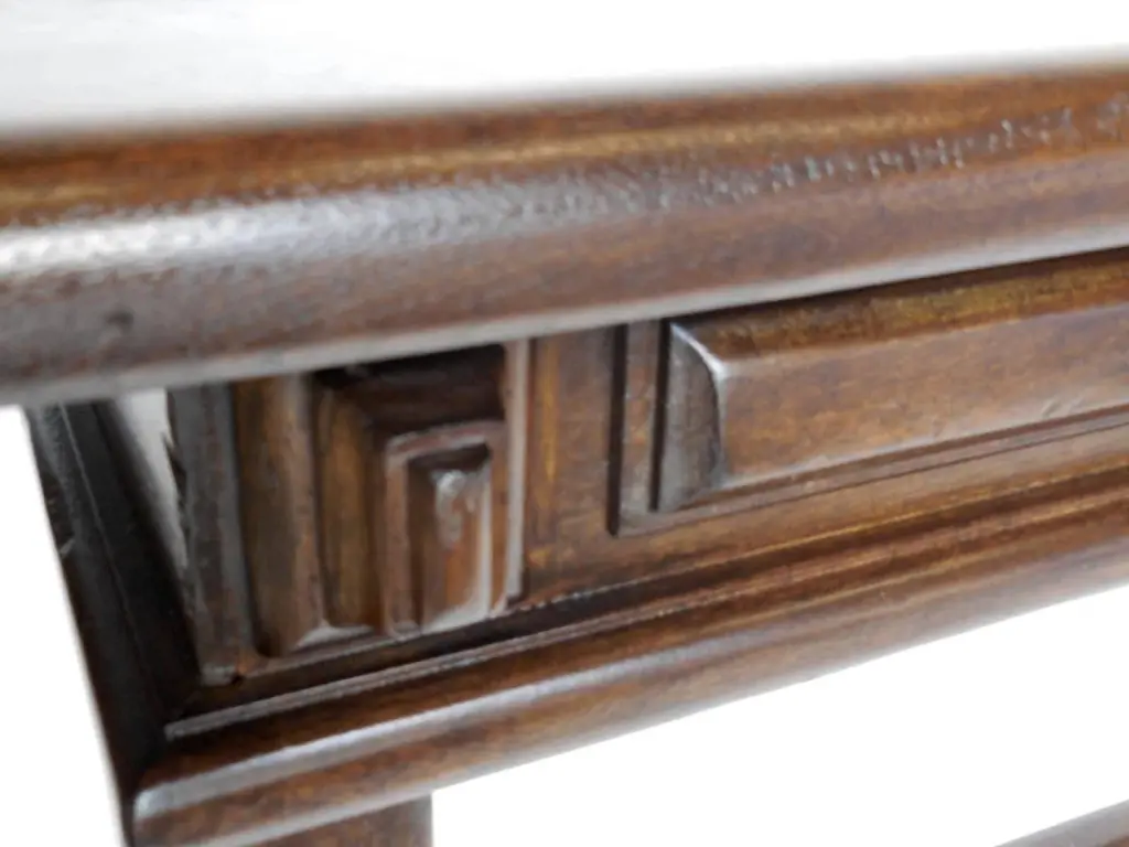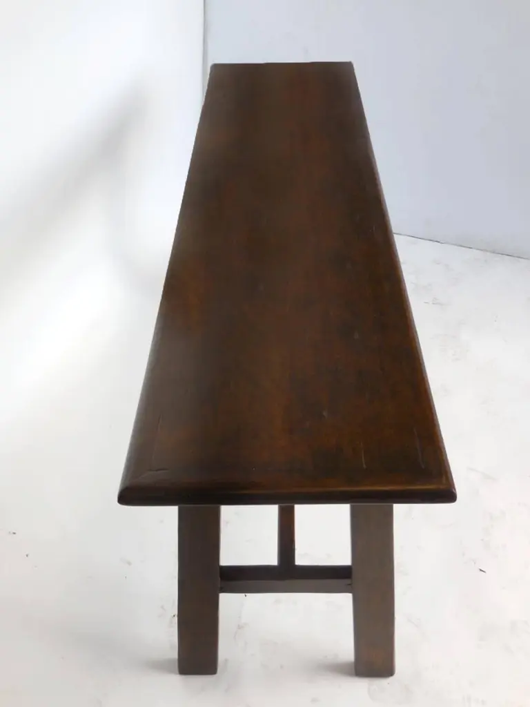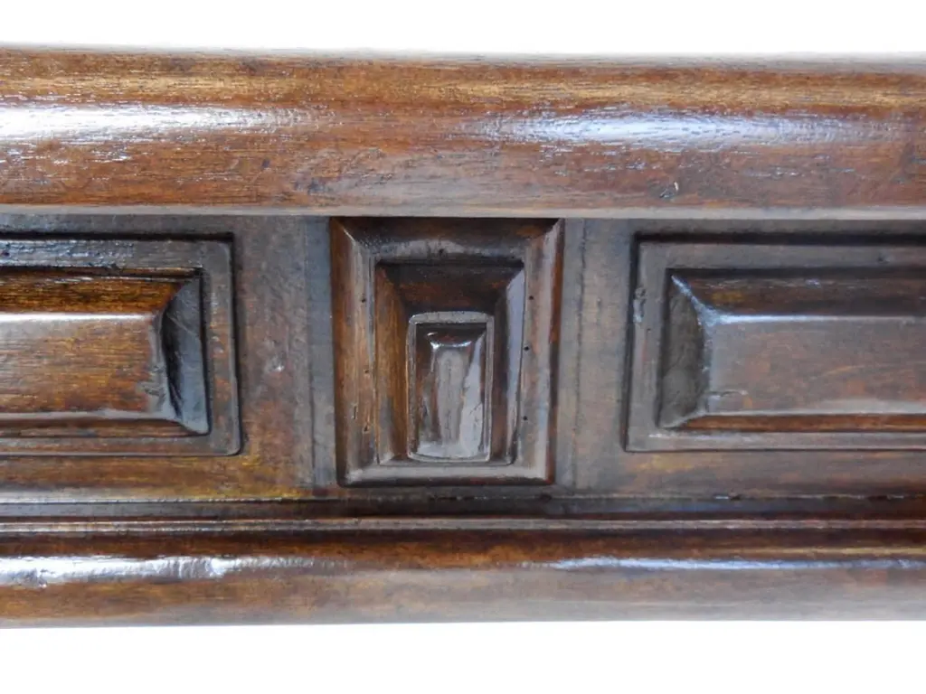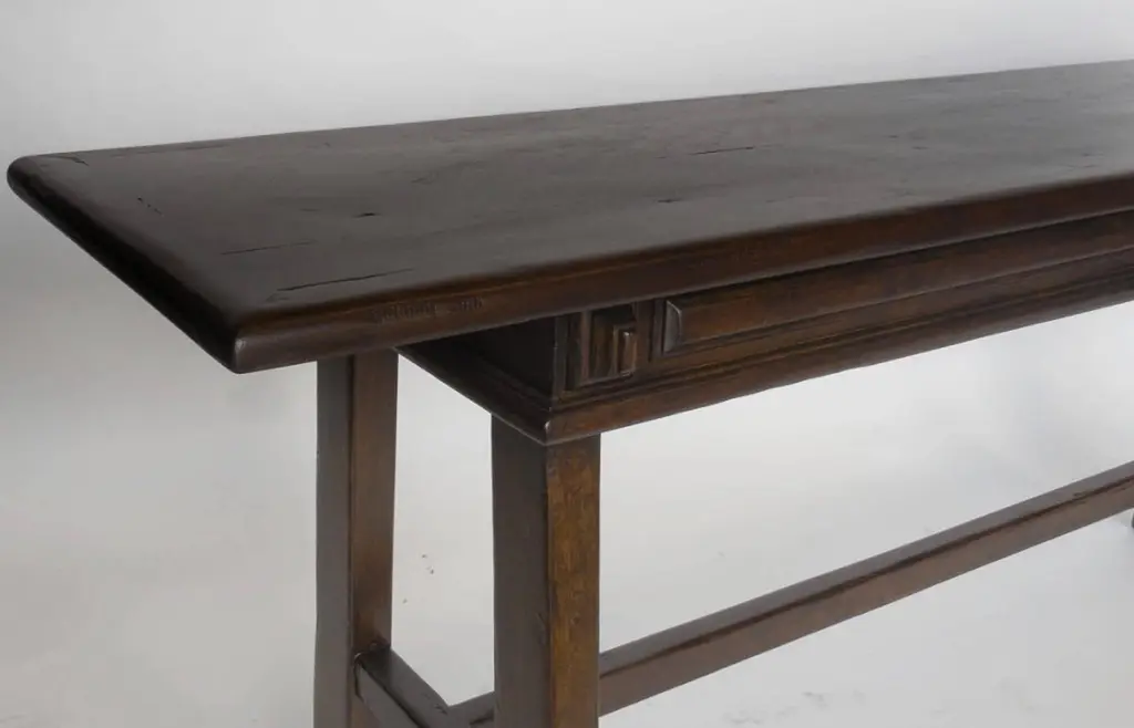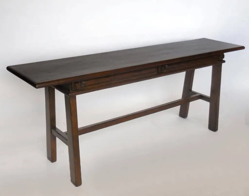 Custom console in walnut. As seen here with fixed panels, front and back but these can also be pencil drawers. Can be made in any size and finish, in walnut, oak or mahogany. Shown in walnut #2 with a medium distress. Made in Los Angeles by Dos Gallos Studio.CUSTOM PRICES ARE SUBJECT TO CHANGE. PLEASE INQUIRE BEFORE ORDERING. ALL CUSTOM ORDERS ARE NON RETURNABLE. FINAL SALE