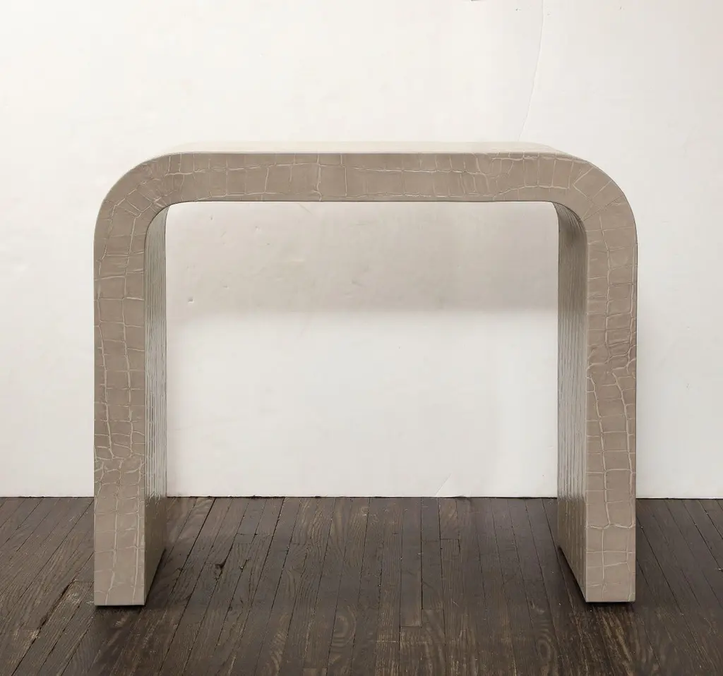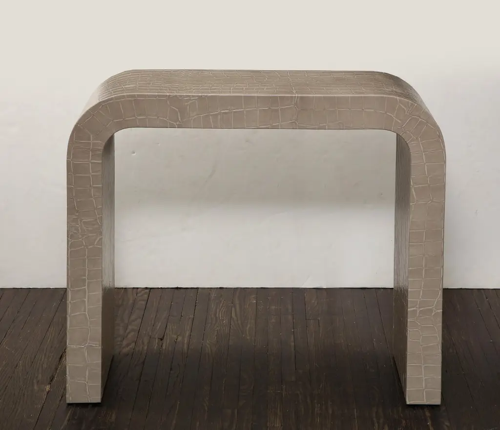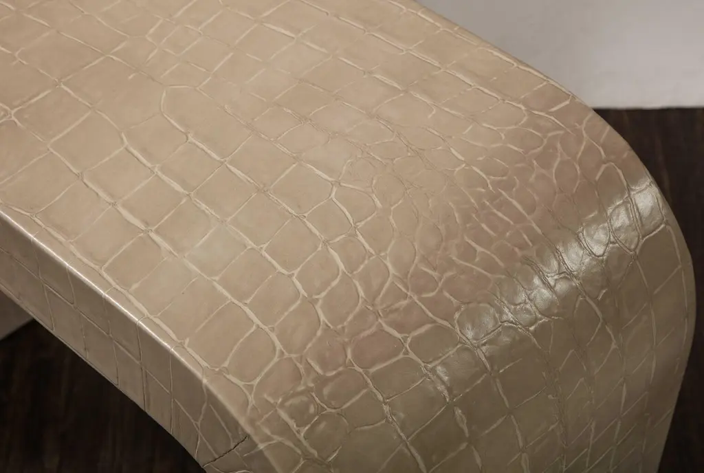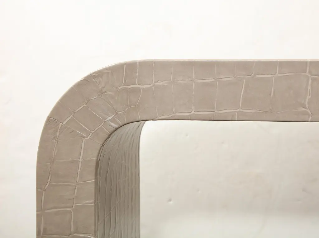 Beautiful custom waterfall console upholstered in Edelman's embossed crocodile leather in smoke color. Custom orders are available for different dimensions, colors, and also with COM/COF (Customer Owned Material/Fabric).