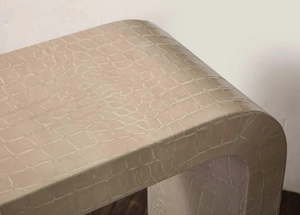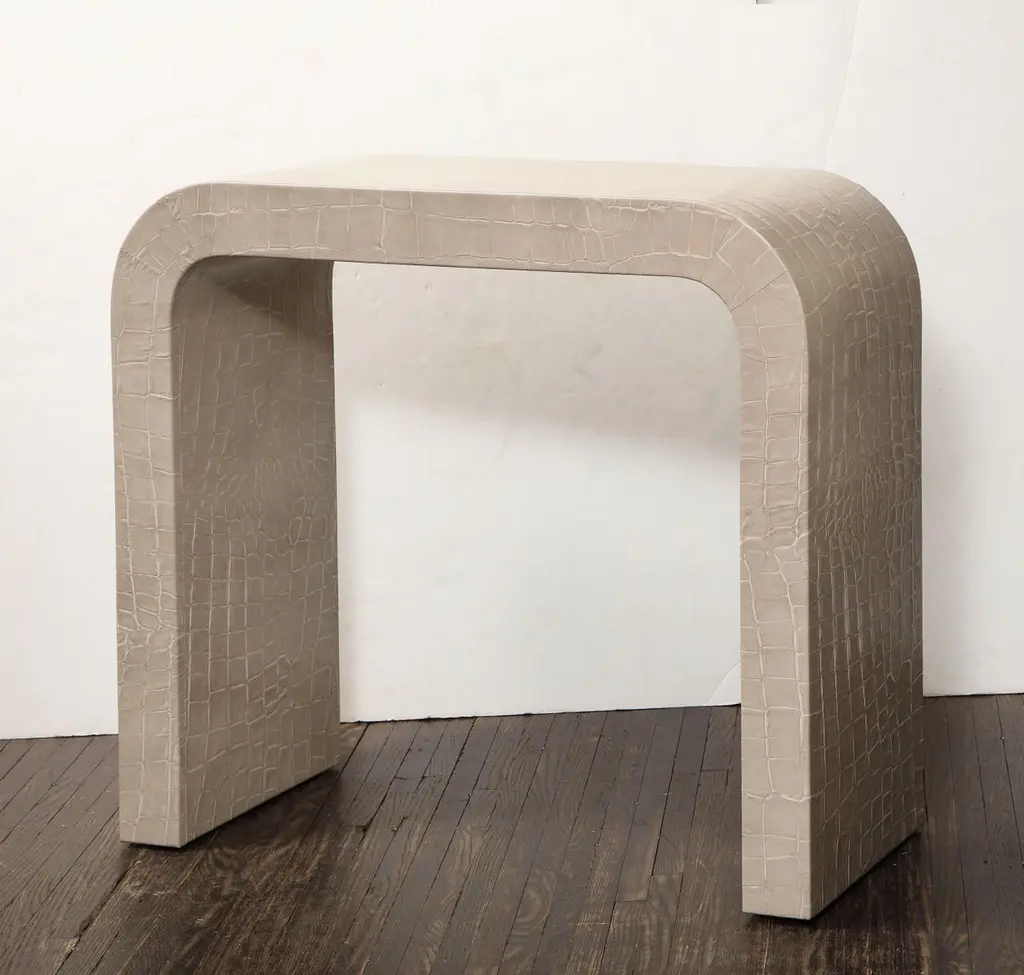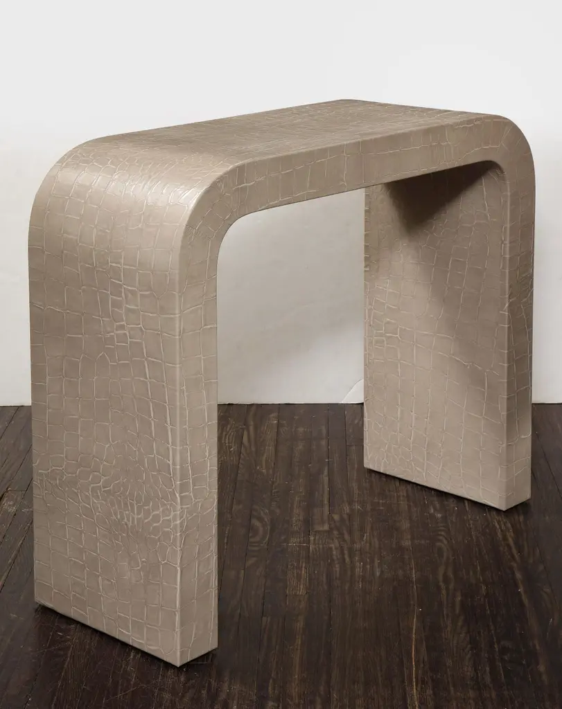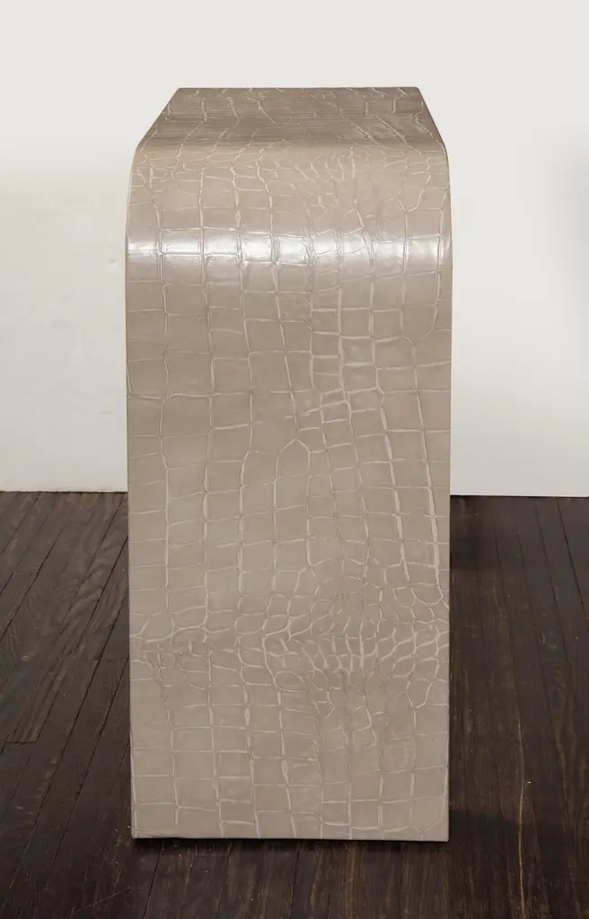 Beautiful custom waterfall console upholstered in Edelman's embossed crocodile leather in smoke color. Custom orders are available for different dimensions, colors, and also with COM/COF (Customer Owned Material/Fabric).