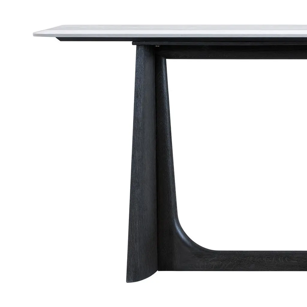 Featuring a wire-brushed white oak in our dark charcoal finish. With a Gan Edan quartz top raised on trapezoidal form trestle ends with a stretcher.Dimensions: 72" W x 16" D x 31.75" H