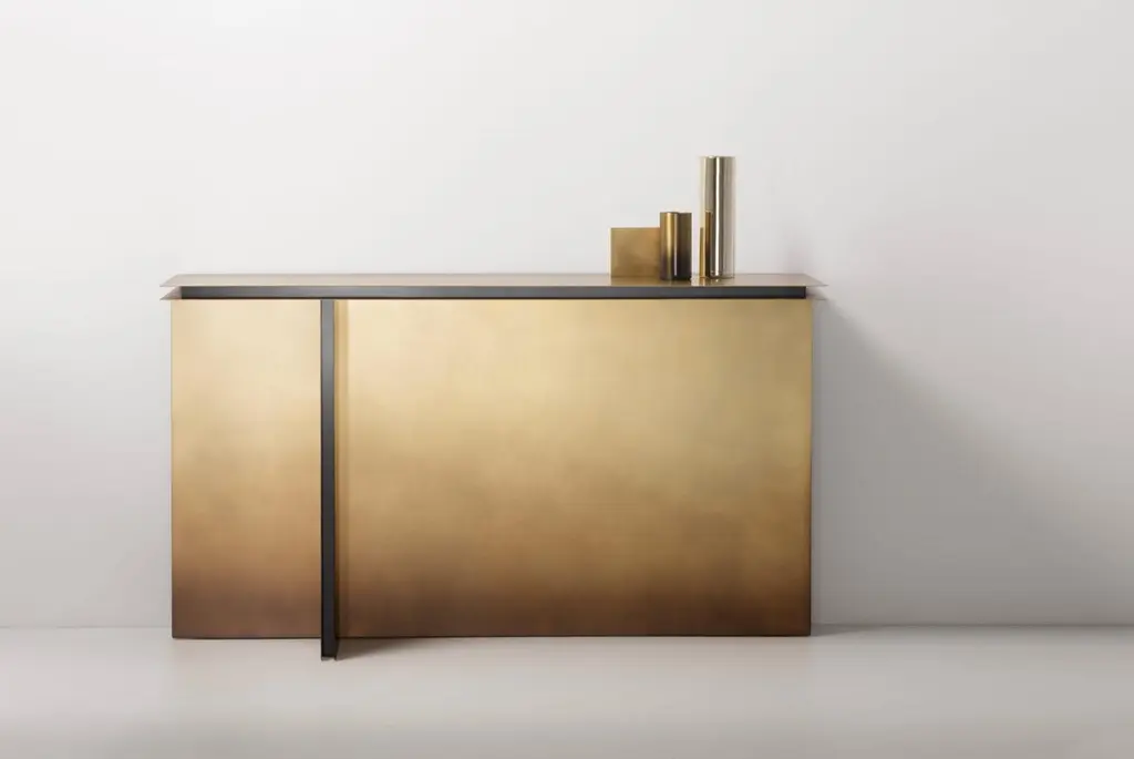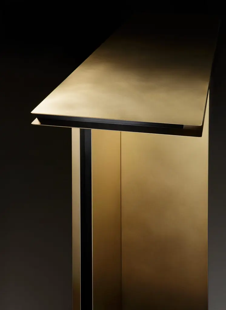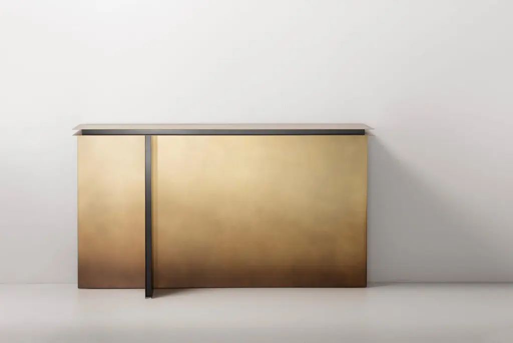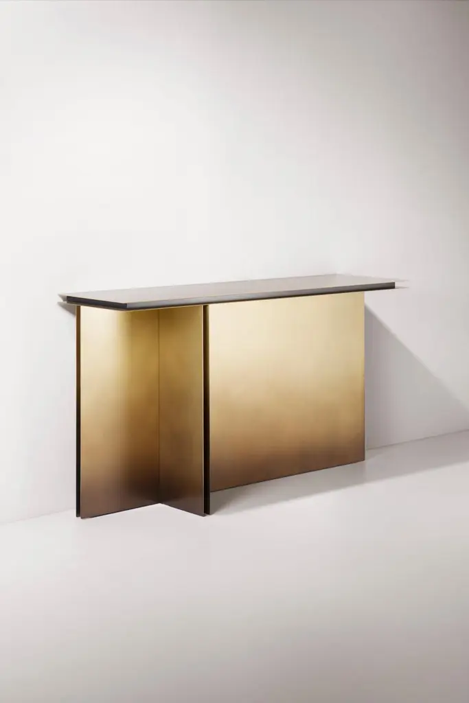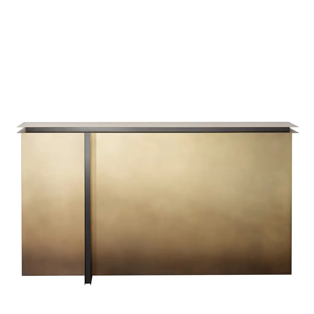 A dramatic, bold yet essential presence defines the Folio console, made of thick brass sheets placed on parallel planes. Exclusive design and style define the base and the top. A linear and three-dimensional ‘T’ emerges from the lower sheet, creating a dense, precise volume, where positive and negative spaces elegantly interact. Ideal for decorating and creating a surface upon which to put objects, even in narrow spaces such as entries and hallways, it is a natural fit in retail, hospitality and contract settings too.DIMENSIONS:W. 160 D. 45 H. 90 cmAvailable in different options, Please inquire with us.