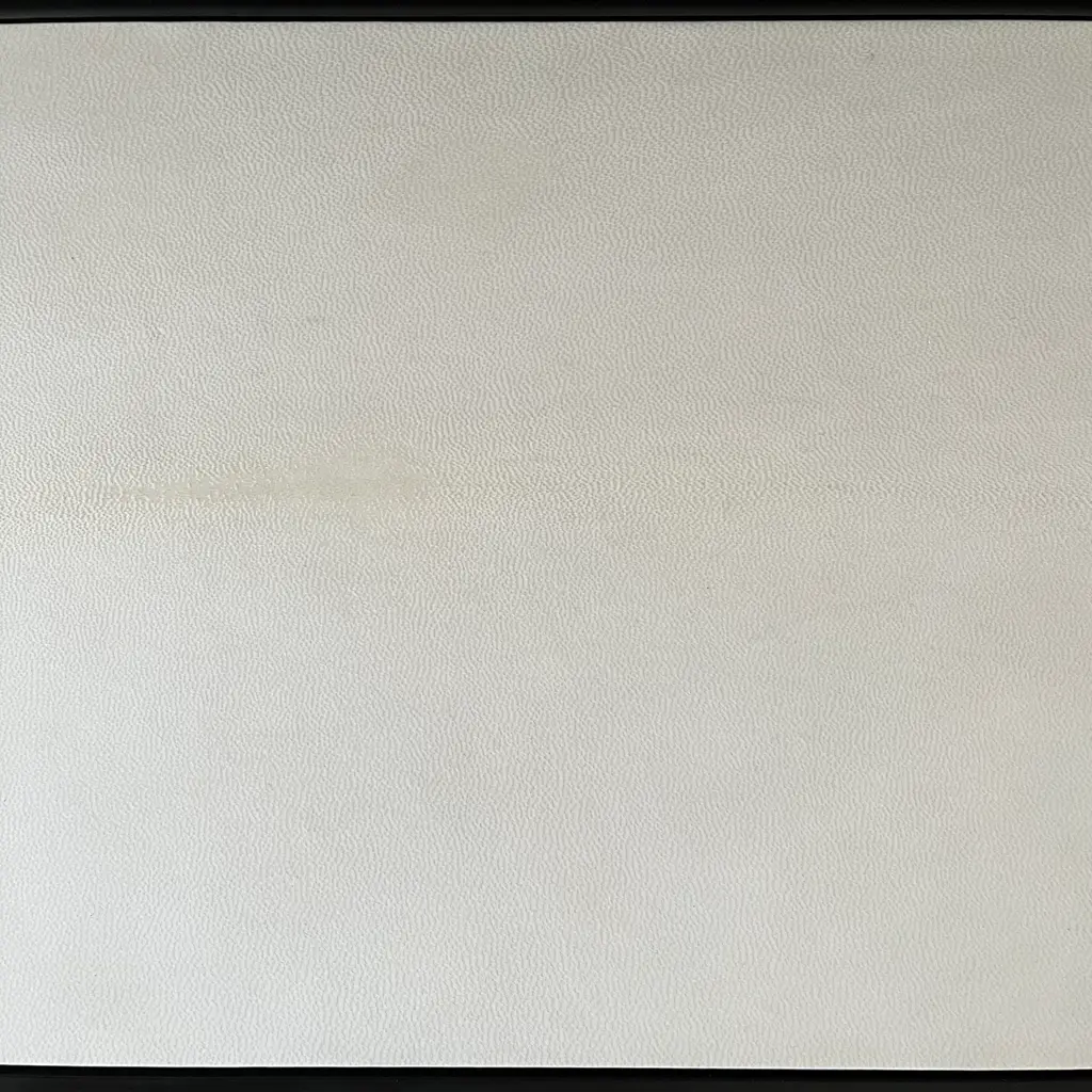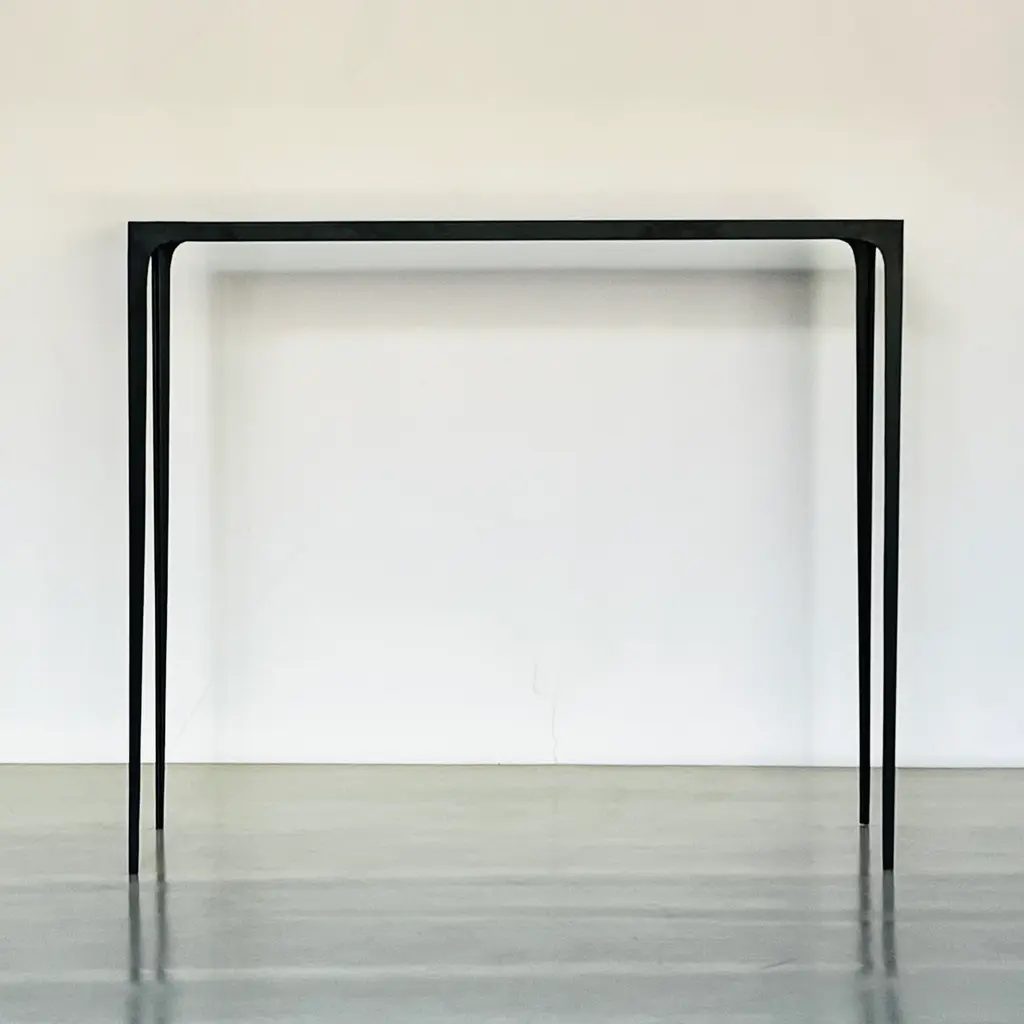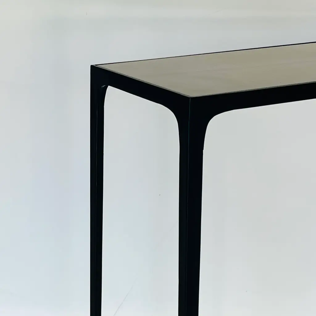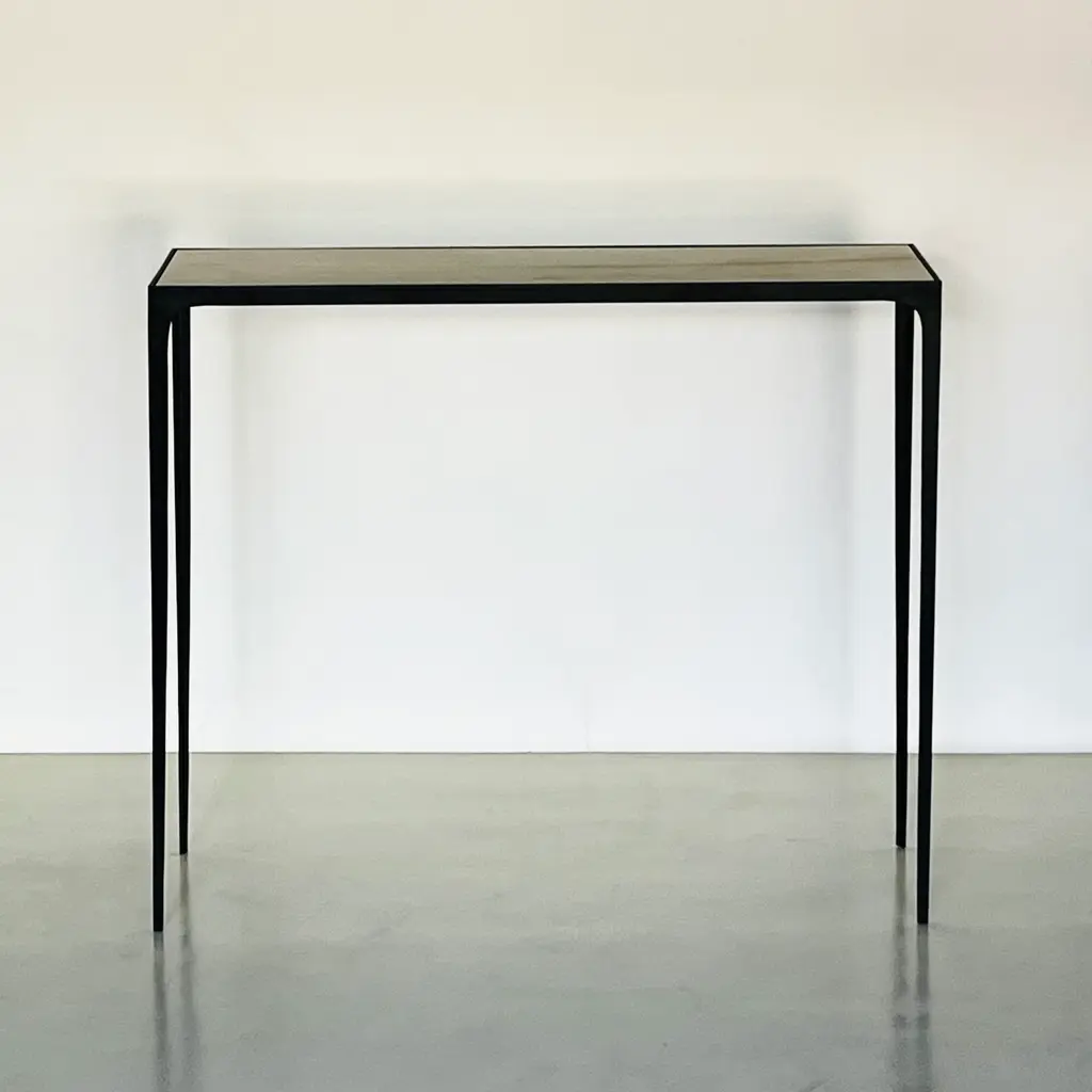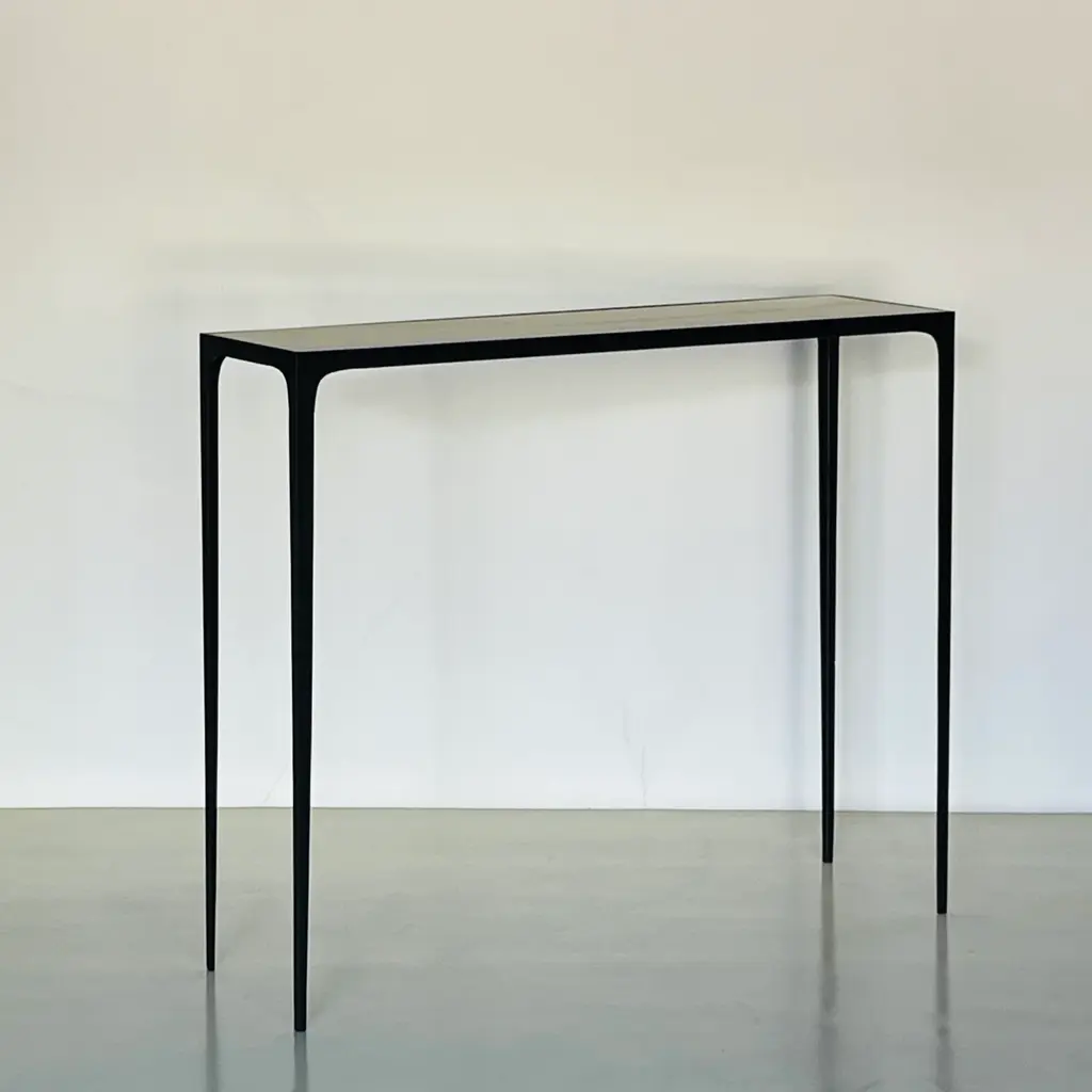 Chic Long 'Esquisse' parchment console from our exclusive Design Frères line. Chic combination of a slender blackened iron base with an inset goatskin (parchemin) clad top. Understated elegance. Timeless.