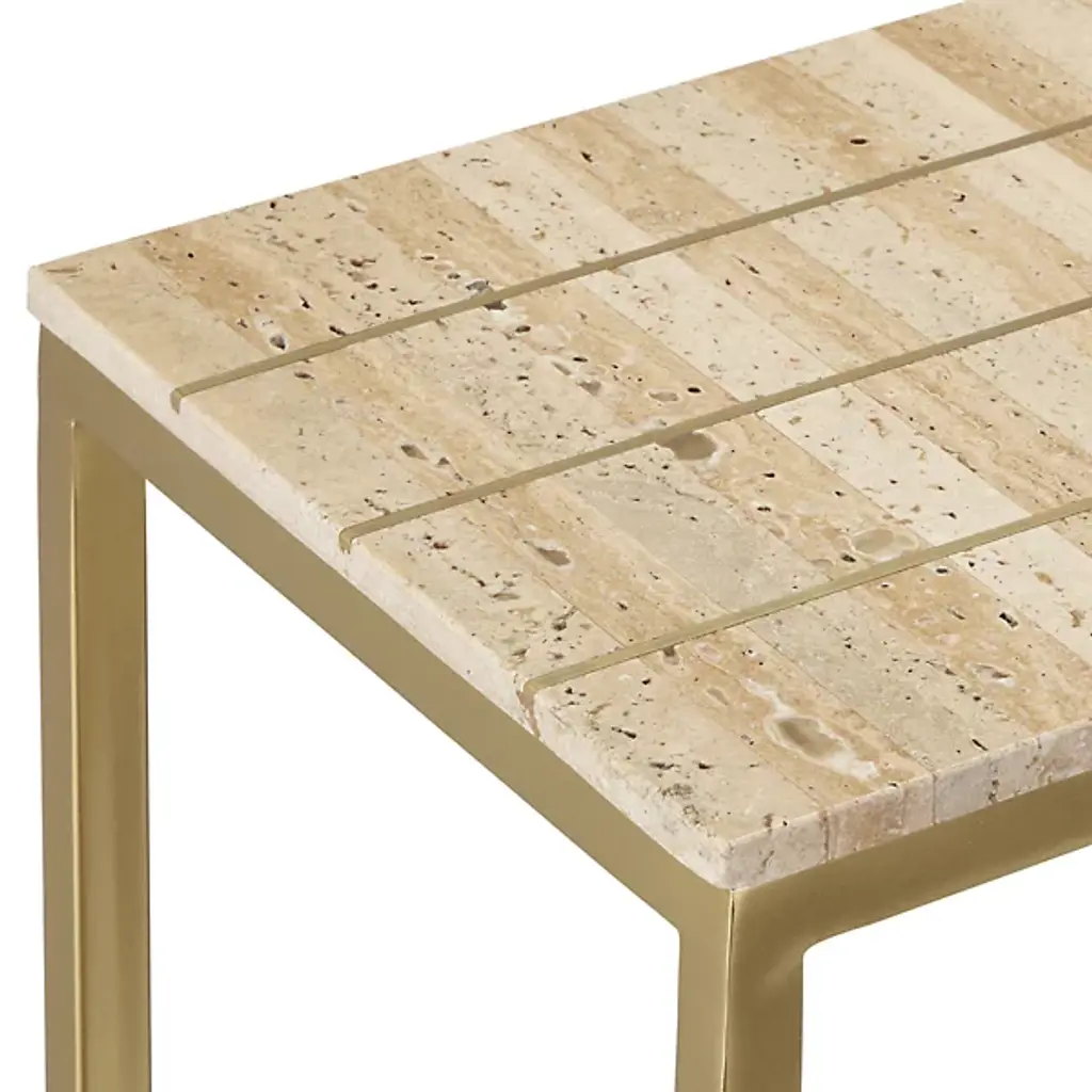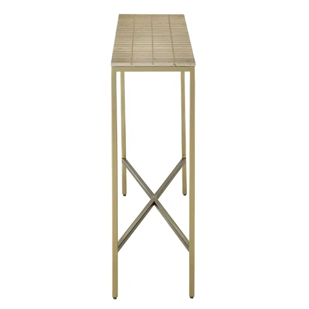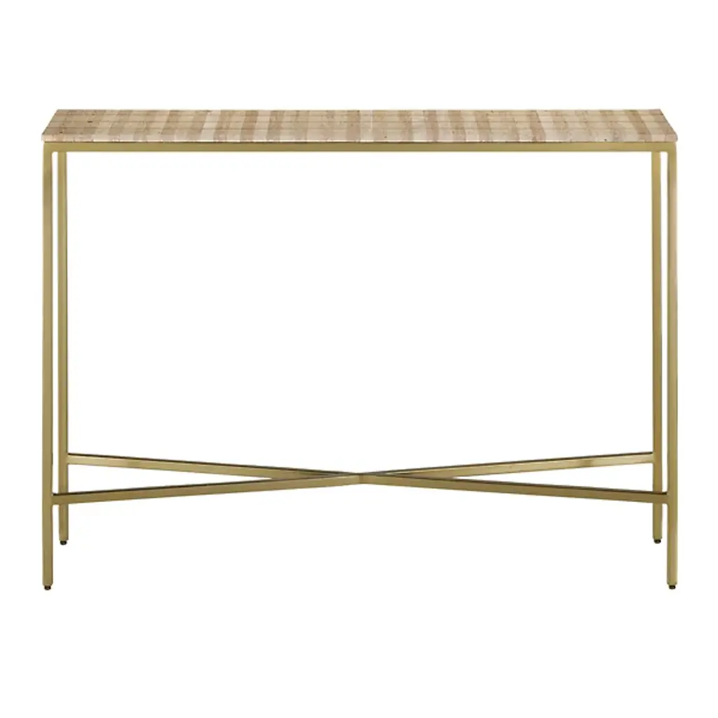 The Dezi Console Table from Currey & Company brings dynamic contrast and refined craftsmanship to any space. Its surface showcases natural travertine tiles arranged in a striking dark-and-light stacked pattern, accented with brass inlays that catch the light beautifully. The elegant top rests on a streamlined iron frame in a rich gold finish, with slender legs connected by an x-shaped stretcher for added stability and style. A bold, bright design certain to enhance entryways, hallways, or living spaces with modern sophistication.