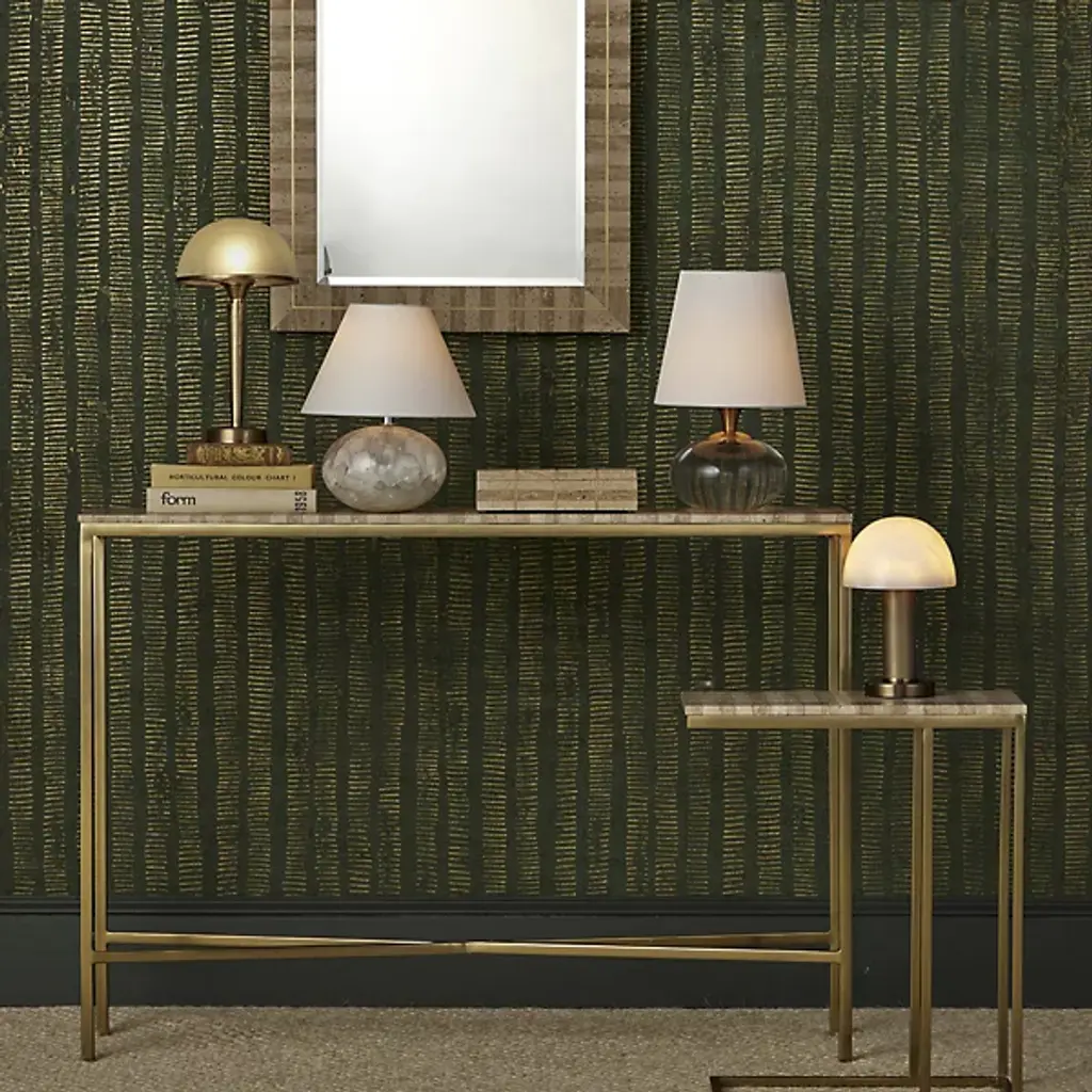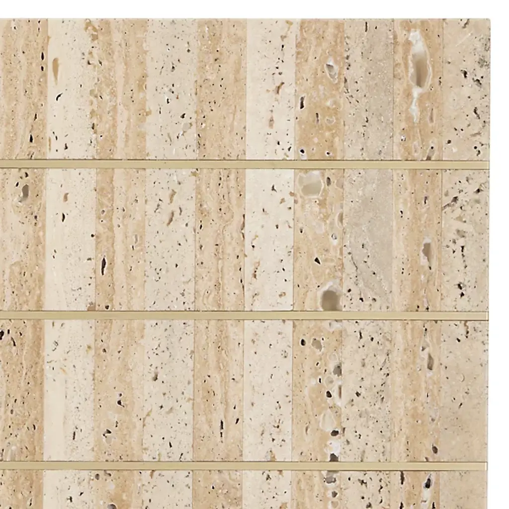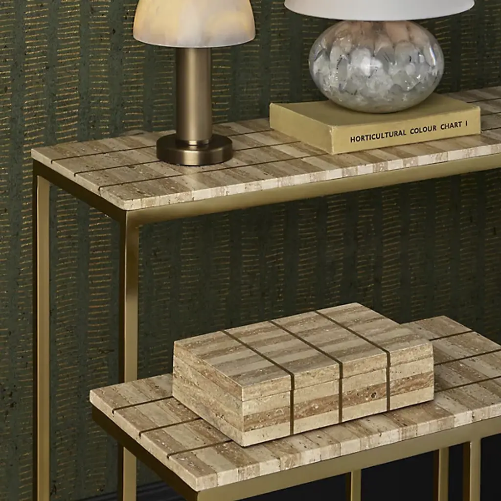 The Dezi Console Table from Currey & Company brings dynamic contrast and refined craftsmanship to any space. Its surface showcases natural travertine tiles arranged in a striking dark-and-light stacked pattern, accented with brass inlays that catch the light beautifully. The elegant top rests on a streamlined iron frame in a rich gold finish, with slender legs connected by an x-shaped stretcher for added stability and style. A bold, bright design certain to enhance entryways, hallways, or living spaces with modern sophistication.