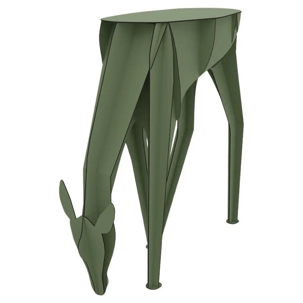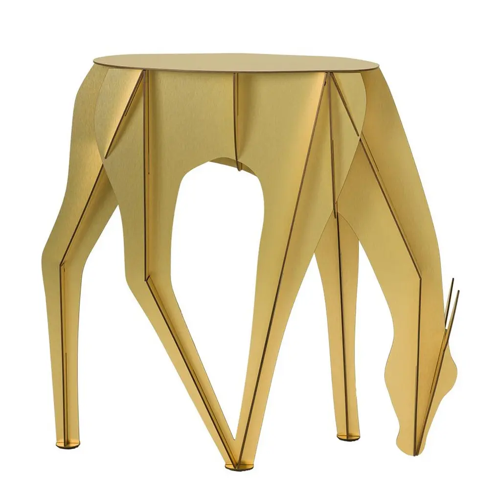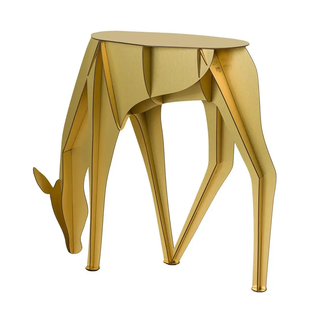 The Diane console, with its elegant and graceful appearance, blends discreetly into the decor of your home. Versatile, it can be placed against the wall or stand independently, thus adapting to your needs. Diane is a unique and functional console that seduces with its timeless elegance.Its presence evokes the delicate gait of an animal on alert, arousing the hope of seeing it in the glow of the forest edges, elusive and mysterious.Diane is part of the collection called Mobilier de Compagnie, which boldly reinvents animal shapes to integrate them harmoniously into interiors.In the gold version, this console adds a touch of originality to any space.Doe Console - Design: Rachel & Benoît ConversMaterial: high pressure laminate (HPL) coated in brushed gold metal for indoor useDimensions: H.92 × L.96 × W.34 cm - Weight: 10 kg