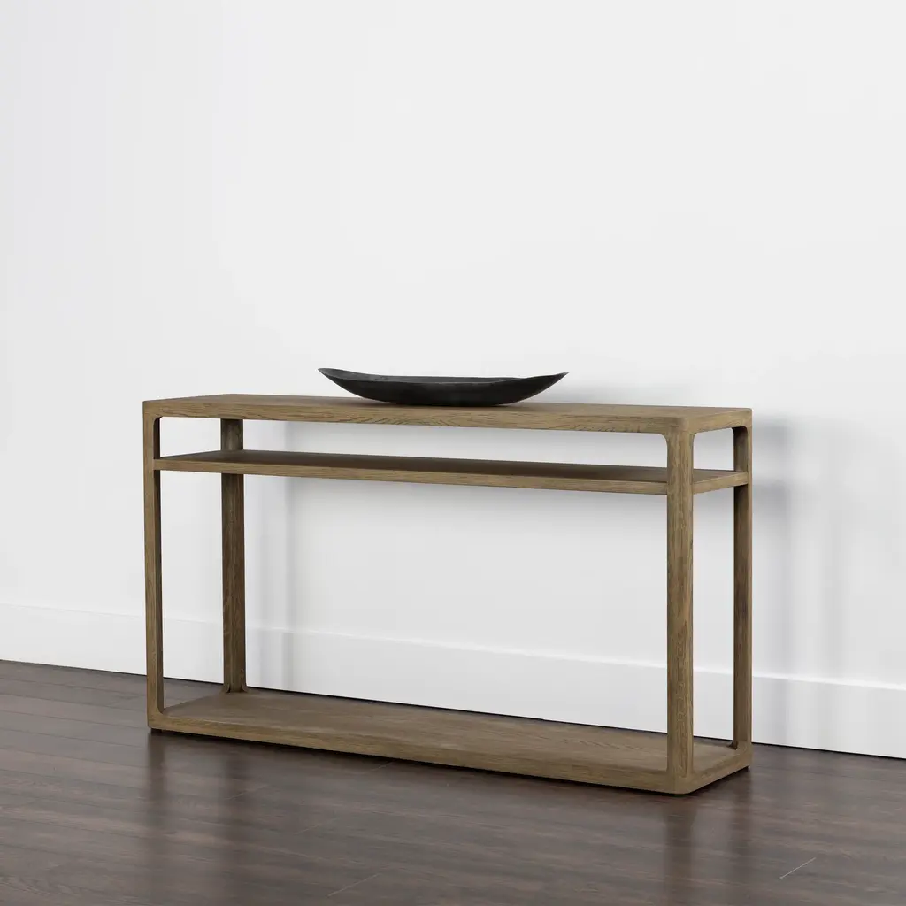 Indulge in minimalist luxury with the Doncaster Console Table from Sunpan. Its clean, modern design adds a touch of sophistication to any space. The organic nature of wood creates unique textures, indentations, and cracks, giving each table its own character. Embrace natural beauty with this elegant piece. Highlights