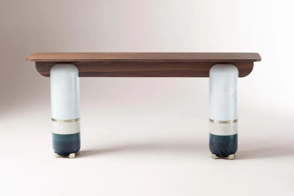 Dolce Vita console transports you to a time of greatness and opulence which we can still find very much alive in Rome. Rich materials take the form and proportion of ancient structures connecting them to a modern functionality and purpose. Bauhaus inspiration, in a piece carved from Natural Marble Stone in tones of Off-white, Green Guatemala and Nero Marquina. Delicately solid Brass bases and a Natural Walnut Wood top, complete this rich and impressive piece of craftsmanship.Made to Order. For sales with delivery address within European territories, VAT will be charged additionally to the stated price.